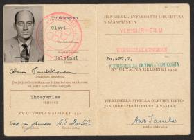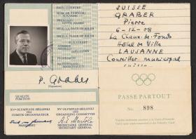 ProtagonistsPaul SÖDERSTRÖMCountriesFinlandRolesdesignergraphic designerFrom … To1910 - 1999Related objectsHelsinki 1952, identity card of Bo LINDMAN (SWE), member of the Swedish National Olympic Committee.Visually represented: Paavo NURMI ...Helsinki 1952, identity card issued to Olavi Tuukkanen of the National Olympic Committee of Finland.Symbolically represented: Paavo NURMI ...Helsinki 1952, identity card of Lennart Hyland (SWE), radio commentator.Used: Lennart HYLAND ...Helsinki 1952, identity card of Czeslaw BIALAS (POL).Visually represented: Paavo NURMI ...Helsinki 1952, official's trainer badge for rowing, blue ribbon.Created: Paul SÖDERSTRÖM (1910)Helsinki 1952, veterinarian's badge.Created: Paul SÖDERSTRÖM (1910)Helsinki 1952, athletics badge of Heather Joy ARMITAGE (GBR), bronze medallist.Used: Heather Joy ARMITAGE ...Helsinki 1952, IOC President's Badge.Created: Paul SÖDERSTRÖM (1910)Helsinki 1952, F.E.I. President's badge.Created: Paul SÖDERSTRÖM (1910)Helsinki 1952, identity card of Jean-Pierre ROCHE (SUI).Visually represented: Paavo NURMI ...Helsinki 1952, list of meals served in the Olympic Village.Visually represented: The Coca-Cola Company ...Helsinki 1952, vignette with the Games' emblem.Created: Paul SÖDERSTRÖM (1910)Helsinki 1952, identity card of Pierre GRABER (SUI).Visually represented: Paavo NURMI ...Helsinki 1952, green identity card of the heads of the Olympic family and theirs relatives.Visually represented: Paavo NURMI ...Helsinki 1952, blue identity card of the participants and the officials.Visually represented: Paavo NURMI ...Helsinki 1952, orange identity card of the medias representatives.Visually represented: Paavo NURMI ...Helsinki 1952, rules and regulations for the Olympic identity card.Created: Paul SÖDERSTRÖM (1910)Helsinki 1952, yellow pass.Visually represented: Paavo NURMI ...Helsinki 1952, registered passVisually represented: Paavo NURMI ...Helsinki 1952, grey identity card used by Olympic sites surveyors.Visually represented: Paavo NURMI ...Helsinki 1952, official's badge for rowing.Created: Paul SÖDERSTRÖM (1910)Helsinki 1952, invidiual entry form.Created: Paul SÖDERSTRÖM (1910)Helsinki 1952, torch relay plaque.Created: Aukusti TUHKA ...Helsinki 1940, official badge.Created: Yrjö Salmela Oy ...Helsinki 1940, official badge.Created: Yrjö Salmela Oy ...Helsinki 1952, participant's badge having belonged to Walter BACH (SUI).Used: Walter BACH ...Helsinki 1952, "NOC" Badge.Created: Comité International Olympique (CIO) ...Helsinki 1952, badge for a chef de mission from the International Boxing Federation.Created: Paul SÖDERSTRÖM (1910)Helsinki 1952, badge for a sailing technician.Created: Paul SÖDERSTRÖM (1910)Helsinki 1952, badge for a modern pentathlon official.Created: Paul SÖDERSTRÖM (1910)Helsinki 1952, badge for a fencing technician.Created: Paul SÖDERSTRÖM (1910)Helsinki 1952, badge for a cycling technician.Created: Paul SÖDERSTRÖM (1910)Helsinki 1952, badge for a cycling coach.Created: Paul SÖDERSTRÖM (1910)Helsinki 1952, badge for a the press.Created: Paul SÖDERSTRÖM (1910)Helsinki 1952, technician's badge for rowing, blue ribbon.Created: Paul SÖDERSTRÖM (1910)Helsinki 1952, coach's badge for gymnastics.Created: Paul SÖDERSTRÖM (1910)Helsinki 1952, badge for an equestrian technician.Created: Paul SÖDERSTRÖM (1910)Helsinki 1952, badge for wrestling.Created: Paul SÖDERSTRÖM (1910)Helsinki 1952, badge for a basketball technician.Created: Paul SÖDERSTRÖM (1910)Helsinki 1952, official's badge for canoeing.Created: Paul SÖDERSTRÖM (1910)Helsinki 1952, masseur's badge.Created: Paul SÖDERSTRÖM (1910)Helsinki 1952, official's badge for weightlifting.Created: Paul SÖDERSTRÖM (1910)Helsinki 1952, official's badge for shooting.Created: Paul SÖDERSTRÖM (1910)Helsinki 1952, International Association of Athletics Federations judge's badge.Created: Paul SÖDERSTRÖM (1910)Helsinki 1952, collection of function badges.Created: Paul SÖDERSTRÖM (1910)Helsinki 1952, identity card of Kurt GOLDSCHMID (SUI).Visually represented: Paavo NURMI ...Helsinki 1952, identity card of Jean Amann, timekeeper at Omega.Visually represented: Paavo NURMI ...Helsinki 1952, function badge that belonged to Jean AMANN, timekeeper at Omega.Created: Paul SÖDERSTRÖM (1910) ...Helsinki 1952, commemorative badge that belonged to Jean AMANN, timekeeper at Omega.Created: Paul SÖDERSTRÖM (1910) ...Helsinki 1952, identity card of Onni NISKANEN (SWE), journalist.Visually represented: Paavo NURMI ...