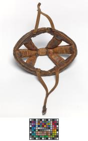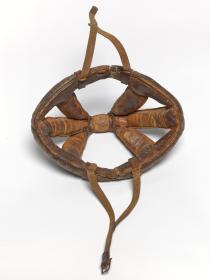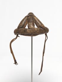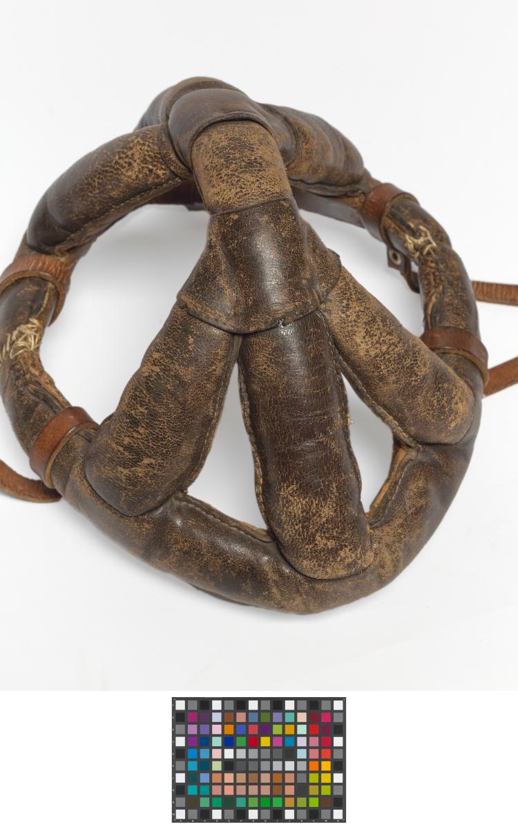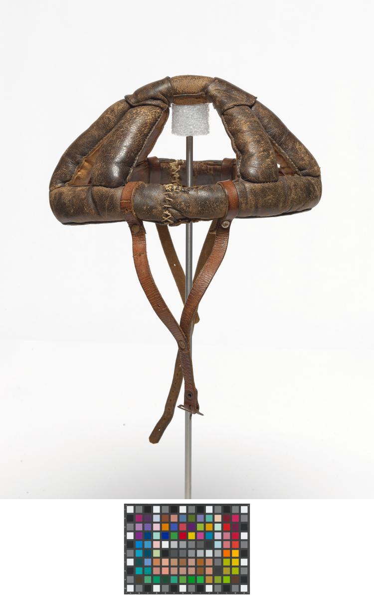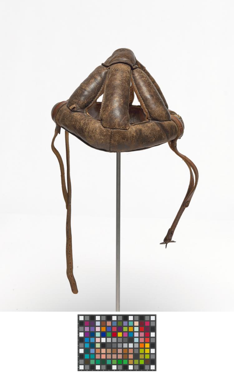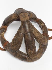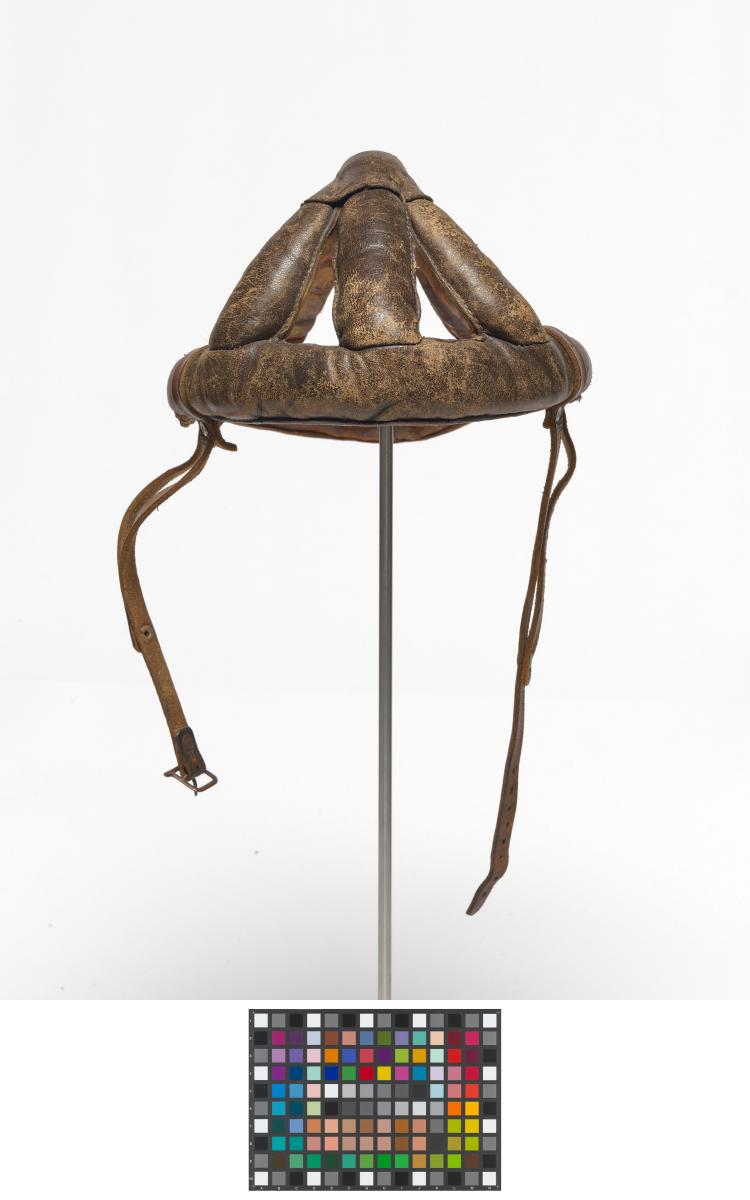 Man's dark brown leather bicycle crash helmet unlined, with chin strap and buckle. Helmet consisting of several bands of padded leather stitched together with a leather chin strap.