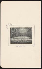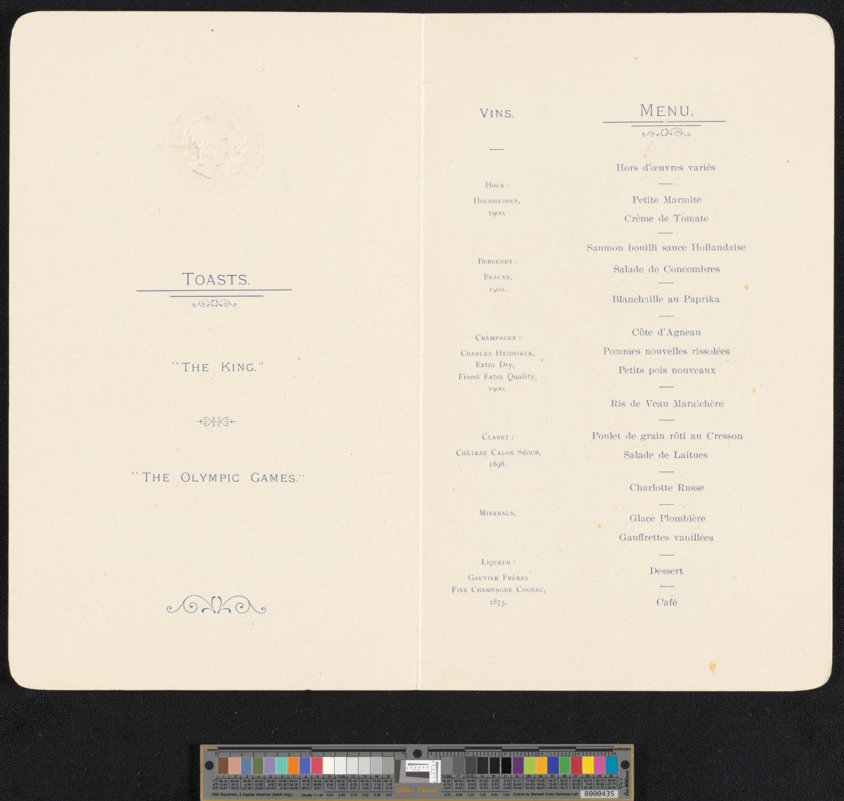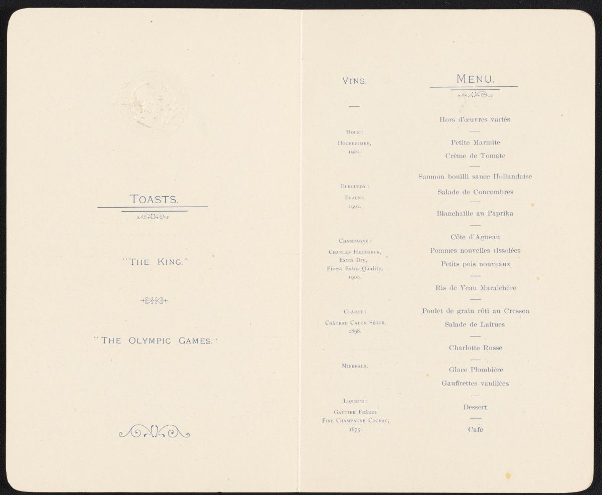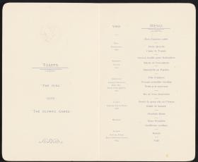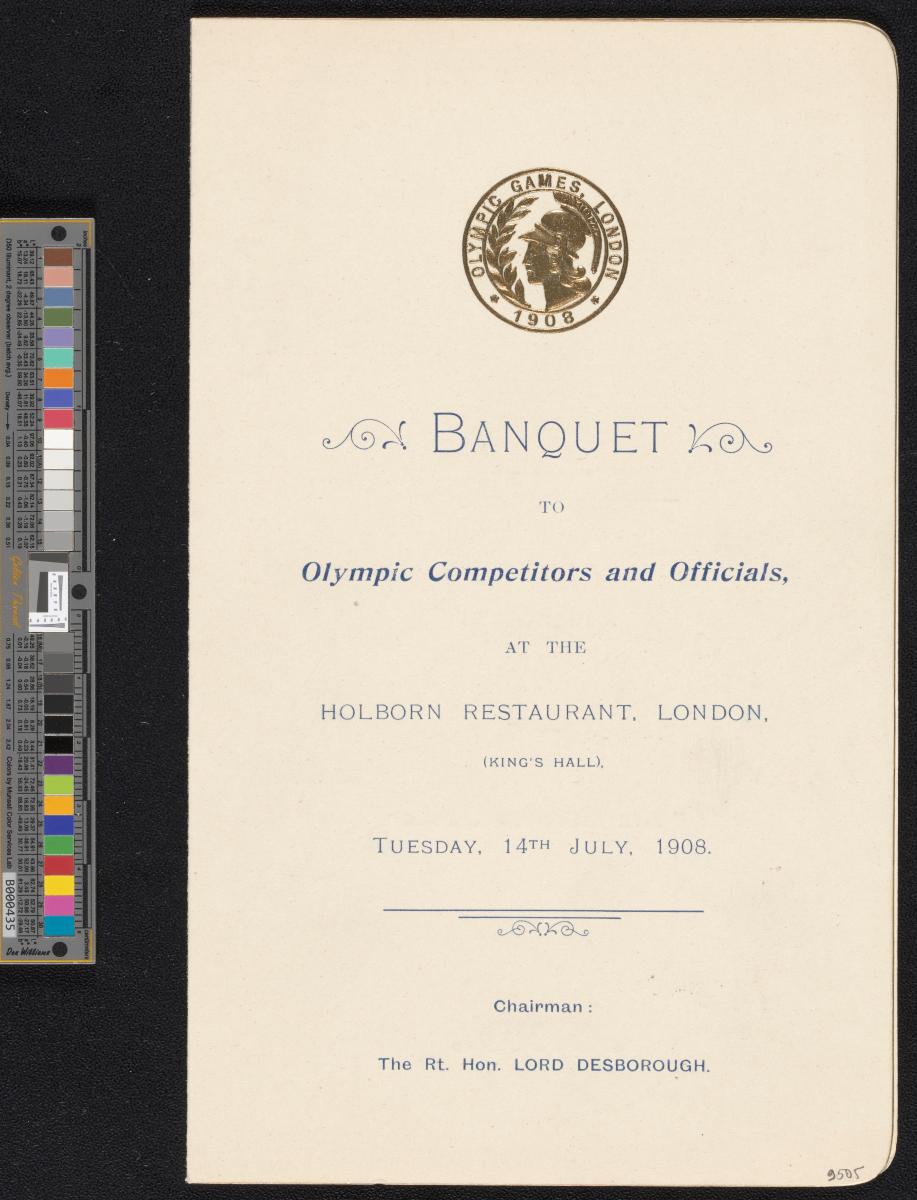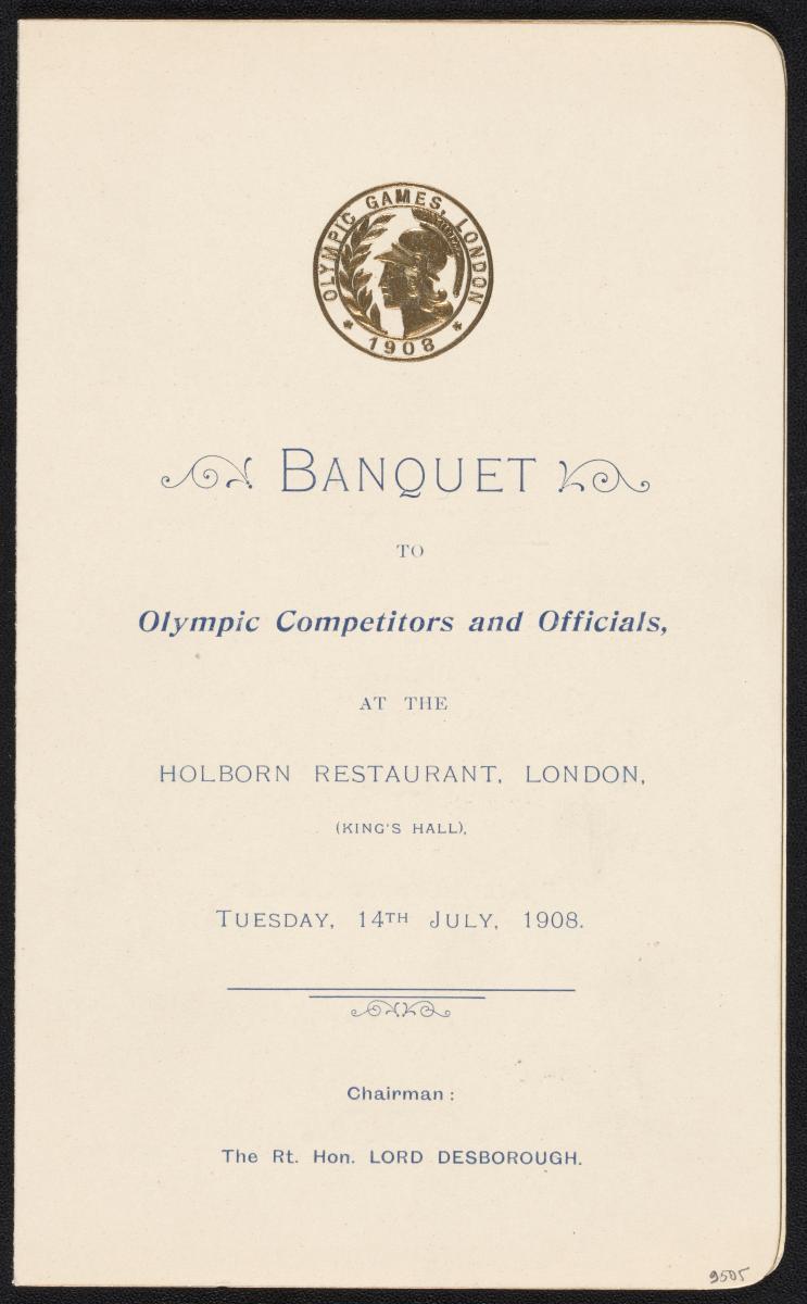 Menu of a banquet to the Olympic competitors and officials taking part to the Olympic Games. On the cover there is the helmeted Britannia with a laurel branch and the caption: "OLYMPIC GAMES, LONDON - 1908". Text: "BANQUET / TO / Olympic Competitors and Officials, / AT THE / HOLBORN RESTAURANT, LONDON / (KING'S HALL), / TUESDAY, 14TH JULY, 1908. / Chairman: / The Rt. Hon. LORD DESBOROUGH.". Inside there is the menu and toast. On the back cover photograph of the banquet hall.
