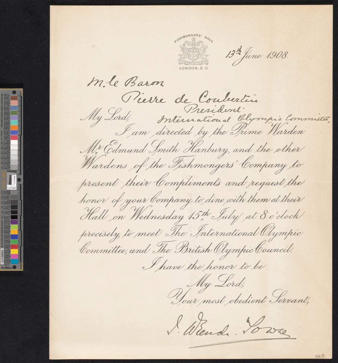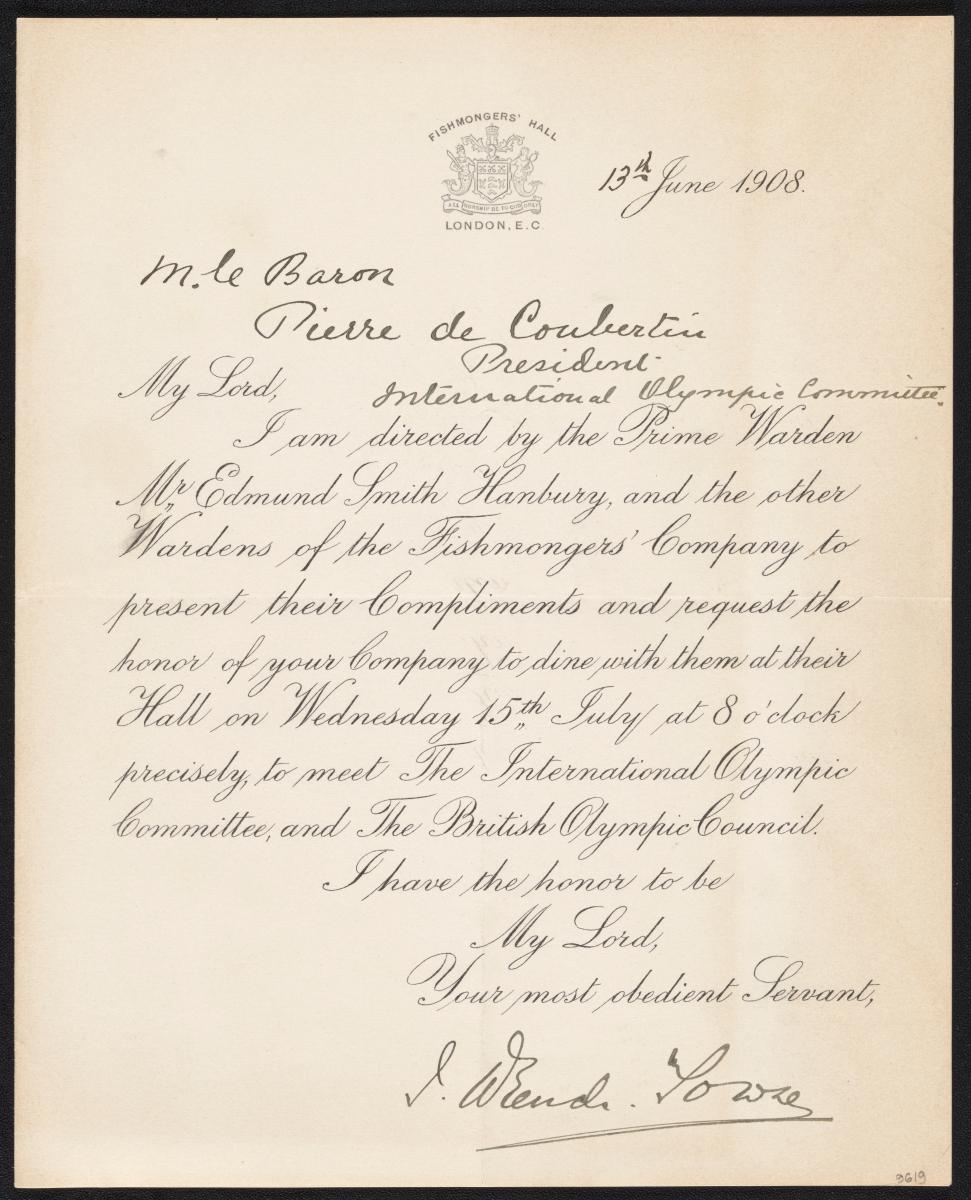 Dinner between the International Olympic Committee and the British Olympic Council. Text: "M. le Baron / Pierre de Coubertin / My Lord, Président / International Olympic Committee. / I am directed by the Prime Warden / Mr Edmund Smith Hanbury, and the other / Wardens of the Fishmongers' Company to / present their Compliments and request the / honor of your Company to dine with them at their / Hall on Wednesday 15th July at 8 o'clock / precisely, to meet The International Olympic / Committee, and The British Olympic Council. / I have the honor to be / My Lord, Your most obedient Servant, / [S. Wendi. Lowze ?]".