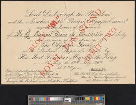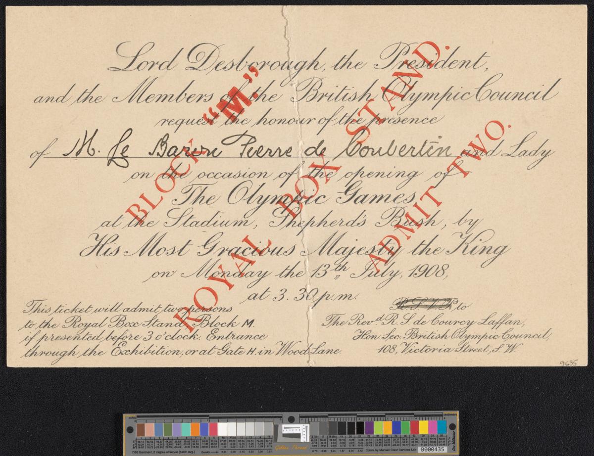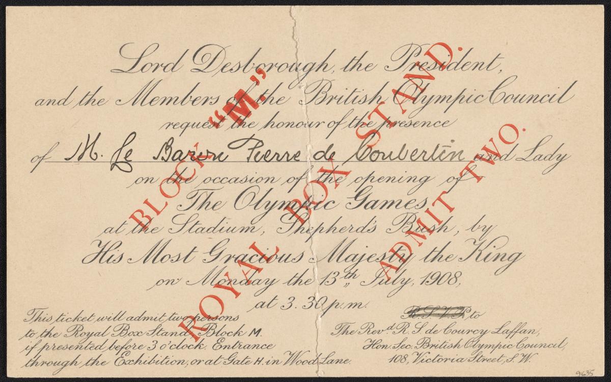 Printed in red on the ticket : Block "M." Royal box stand. Admit two. Text: "LORD DESBOROUGH, the President, / and the Members of the British Olympic Council / request the honour of the presence / of M. Le Baron Pierre de Coubertin and Lady / on the occasion of the opening of / The Olympic Games, / at the Stadium, Shepherd's Bush, by / HIS MOST GRACIOUS MAJESTY THE KING, / on Monday, the 13th July, 1908, / at 3.30 p.m.".