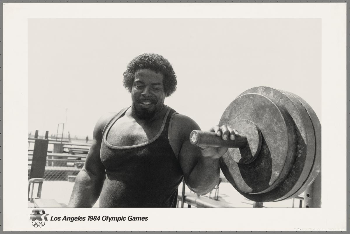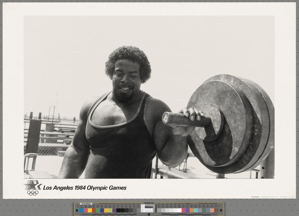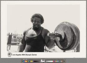 Copy of a black-and-white image in which the photographer immortalises the training session of an anonymous weightlifter. The smile on the amateur athlete’s face gives an idea of his pride at being photographed.