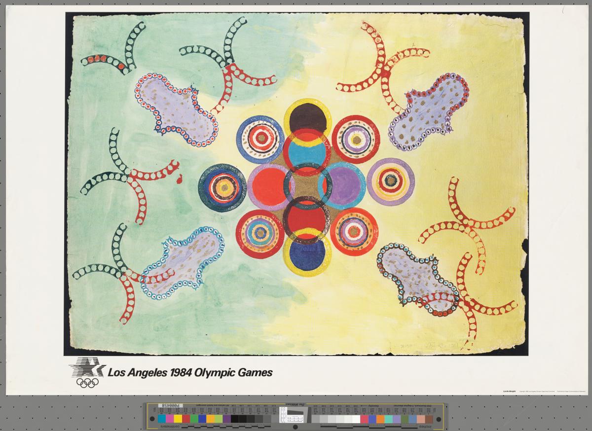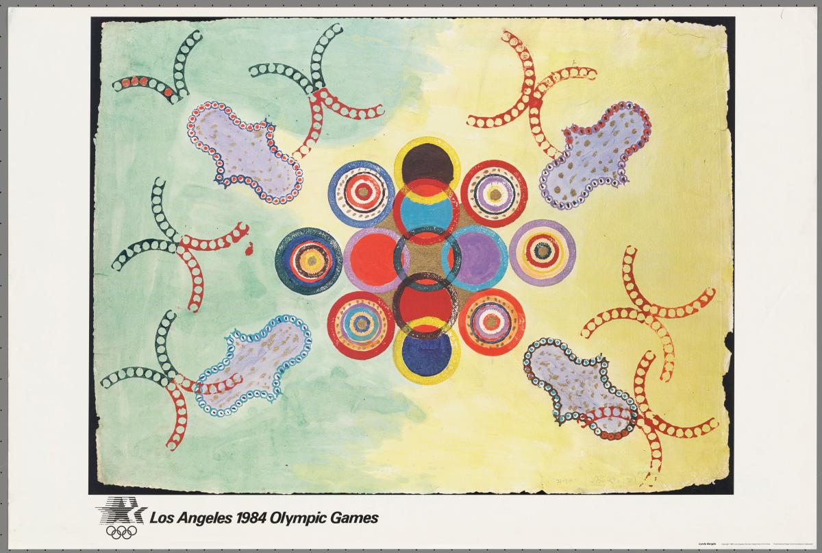 Geometrical motives based on the Olympic symbol. Games' emblem and caption: "Los Angeles 1984 Olympic Games". Signed L. Benglis on the lower right.