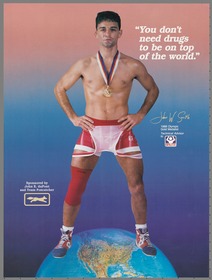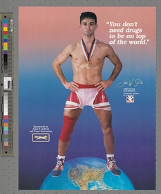Seoul 1988, antidoping poster with John William SMITH (USA), featherweight (57 - 62kg) freestyle wrestling Olympic champion.