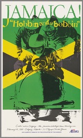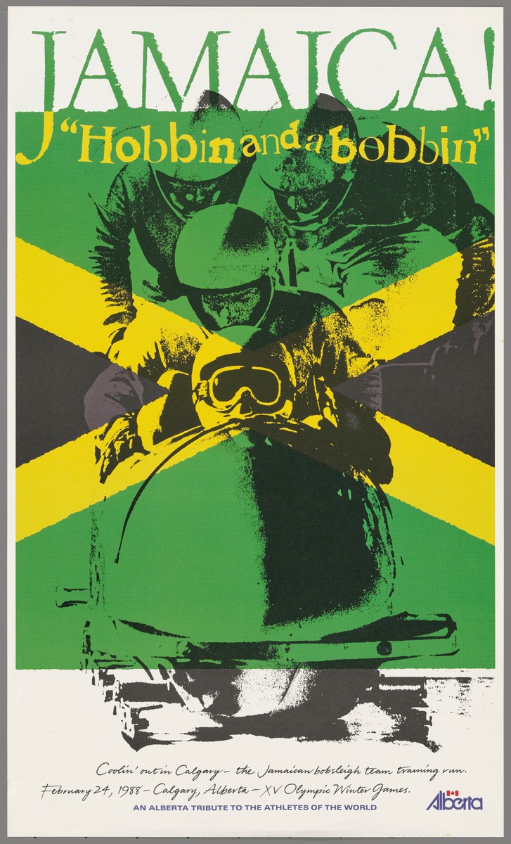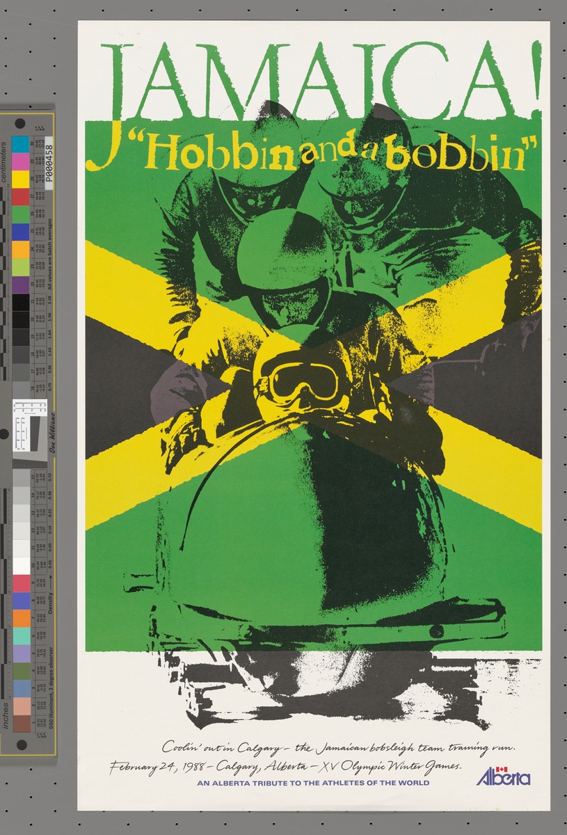 Poster with a photomontage depicting a four-man bobsleigh team at the start and the Jamaican flag in the background. Large title: ‘JAMAICA! / Hobbin and a bobbin’. At the bottom, the emblem of the Province of Alberta and the caption: ‘An Alberta Tribute / to the Athletes of / the World’.