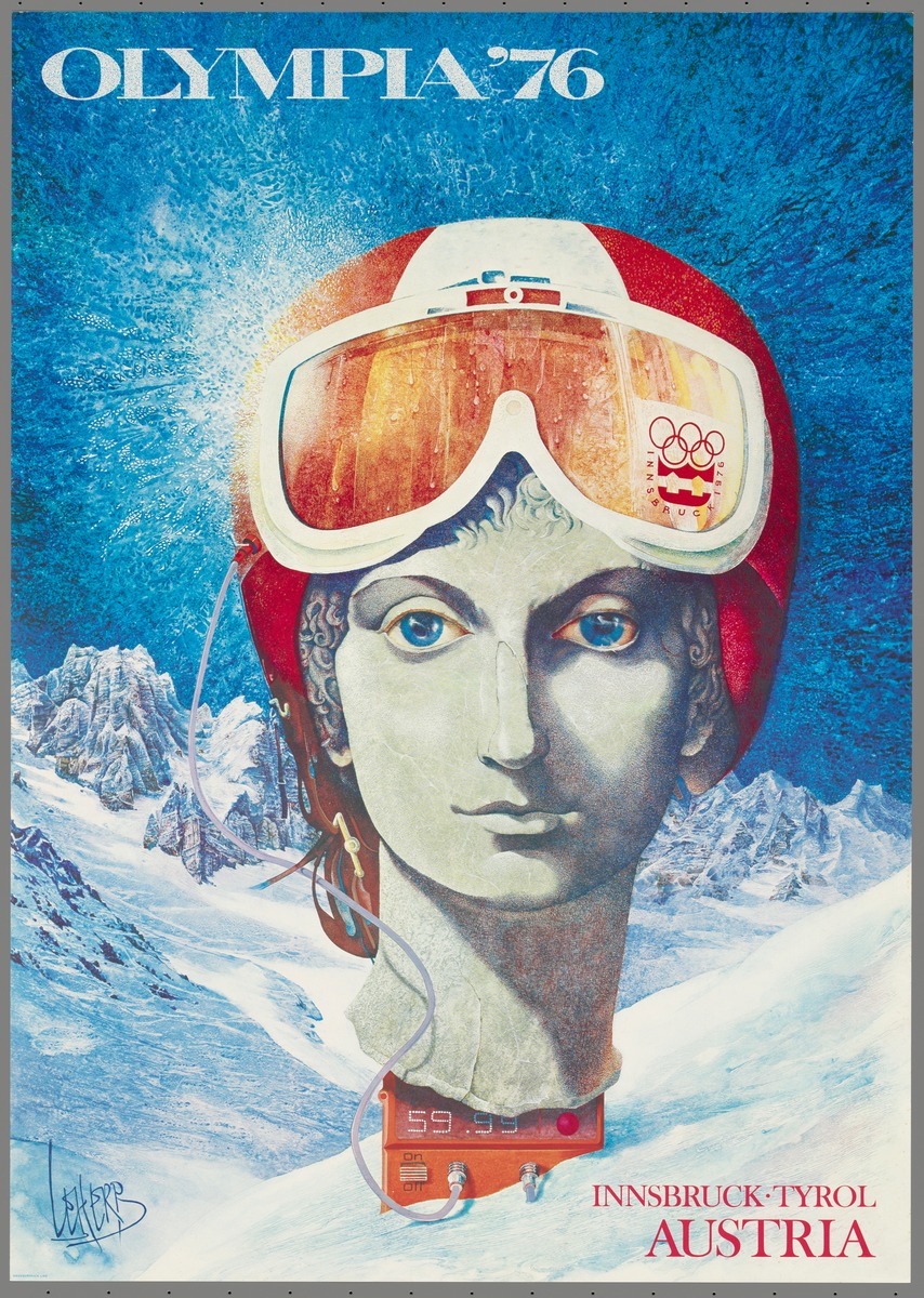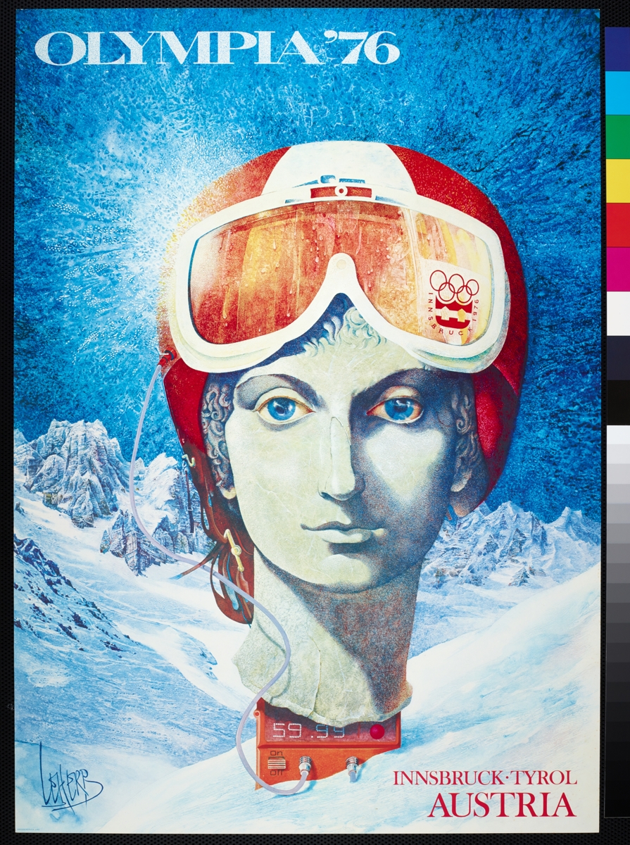 Helmeted head of a statue with blue eyes resting on a stopwatch in a mountain landscape. Games emblem on glasses. Caption: "Olympia '76 Innsbruck Tyrol Austria". Signed by the artist.