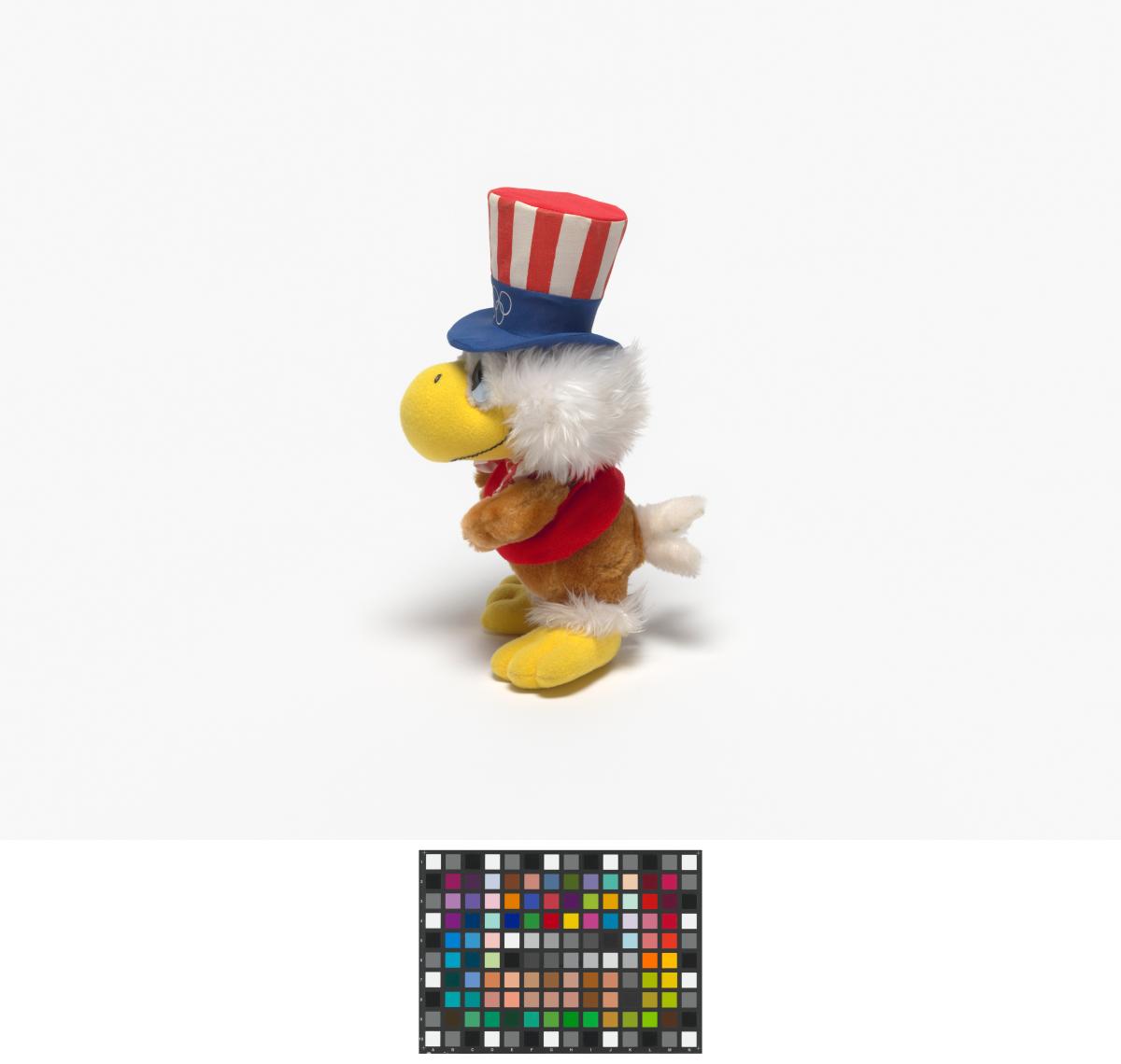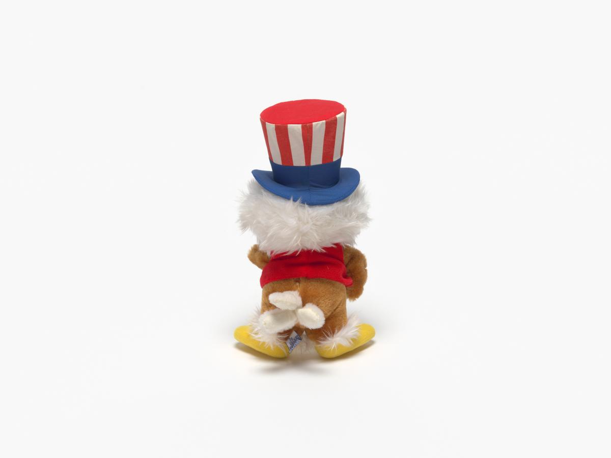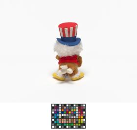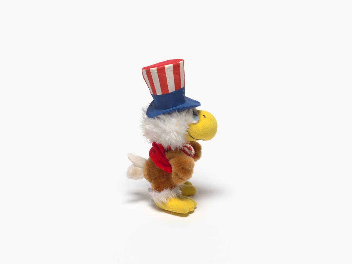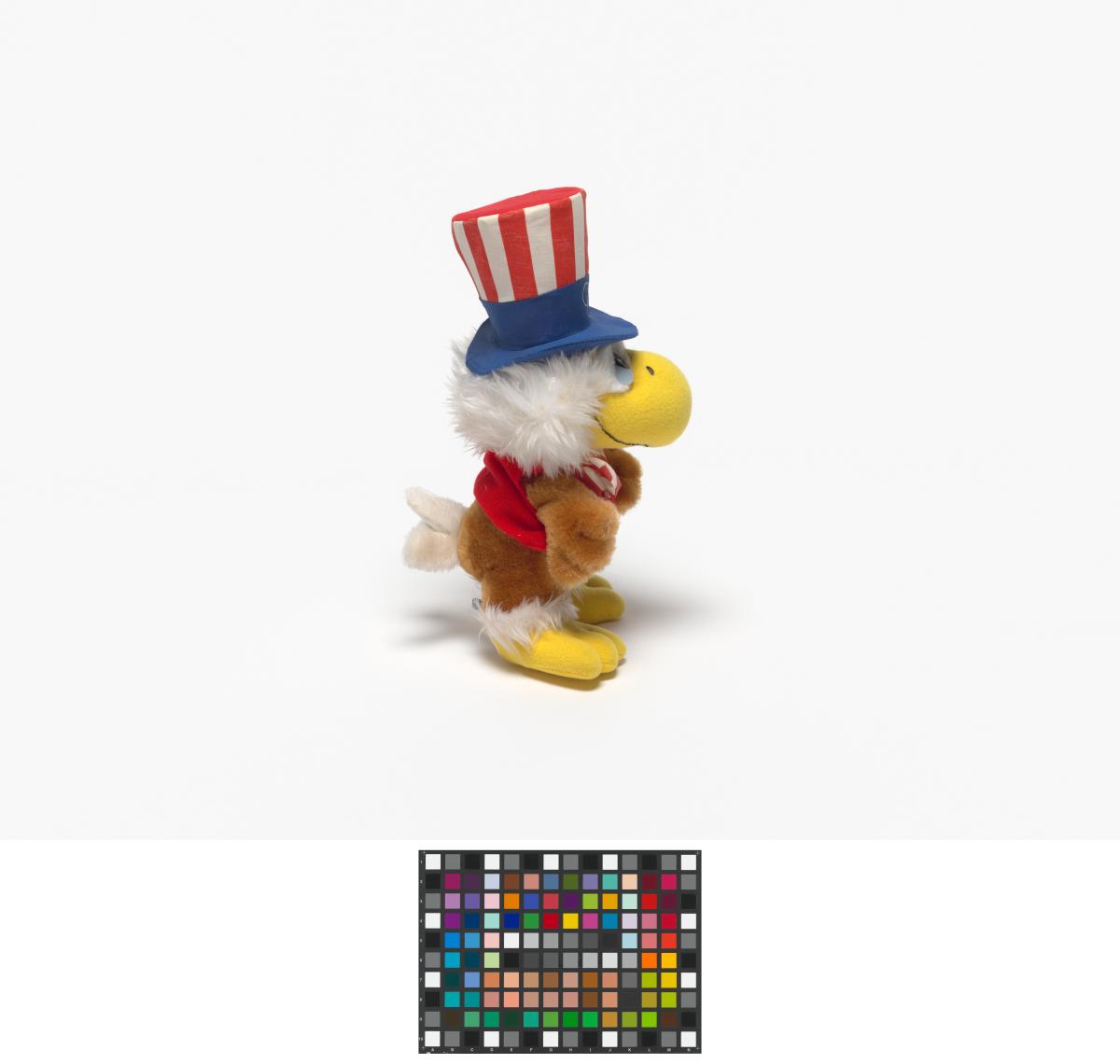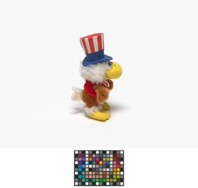 The eagle plush is wearing a top hat with the american flag colors.