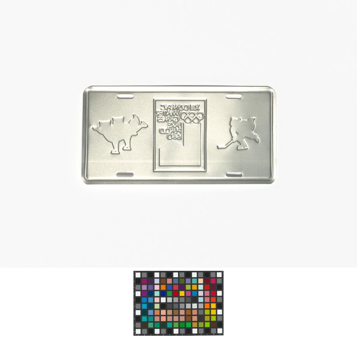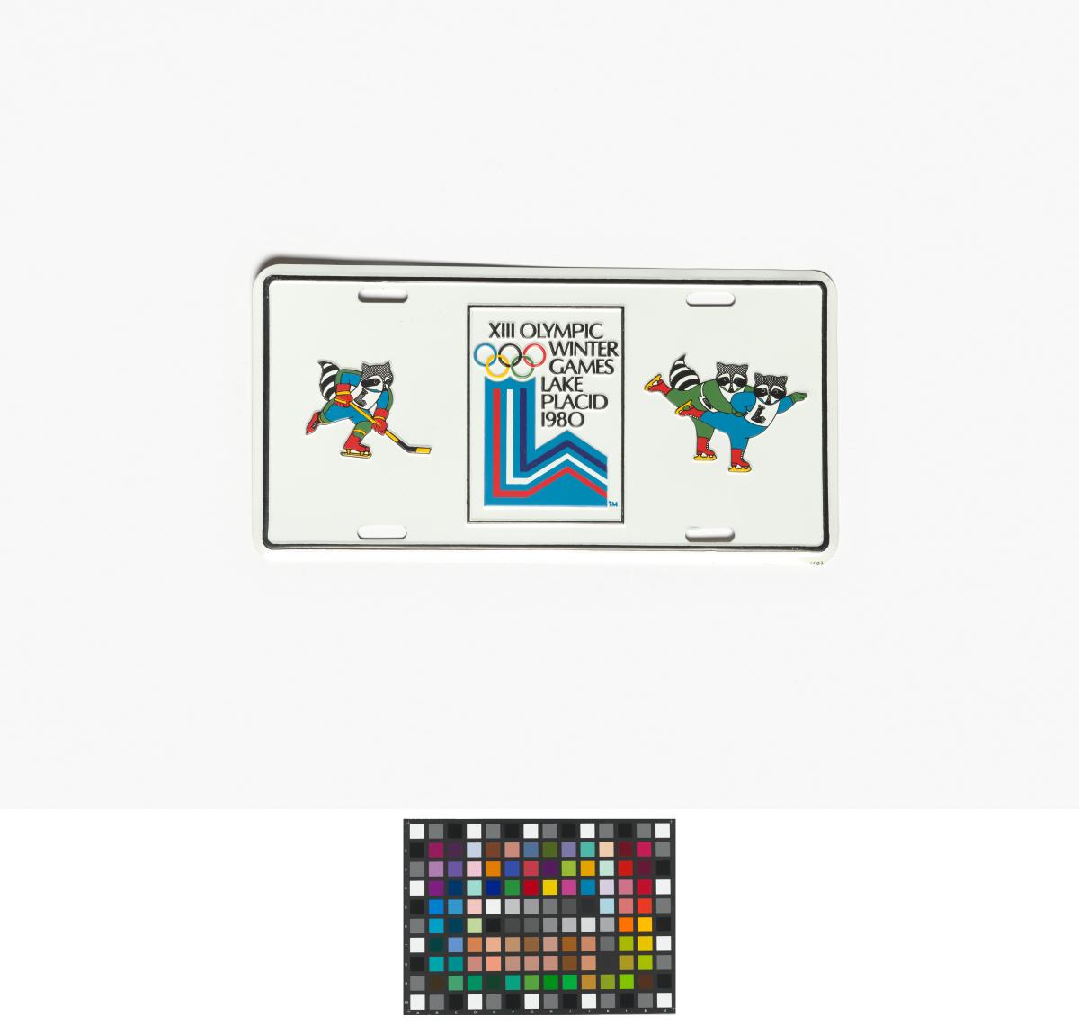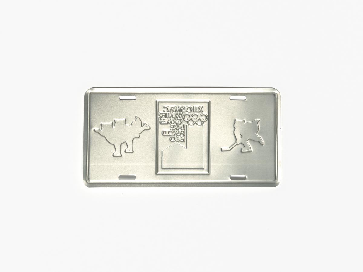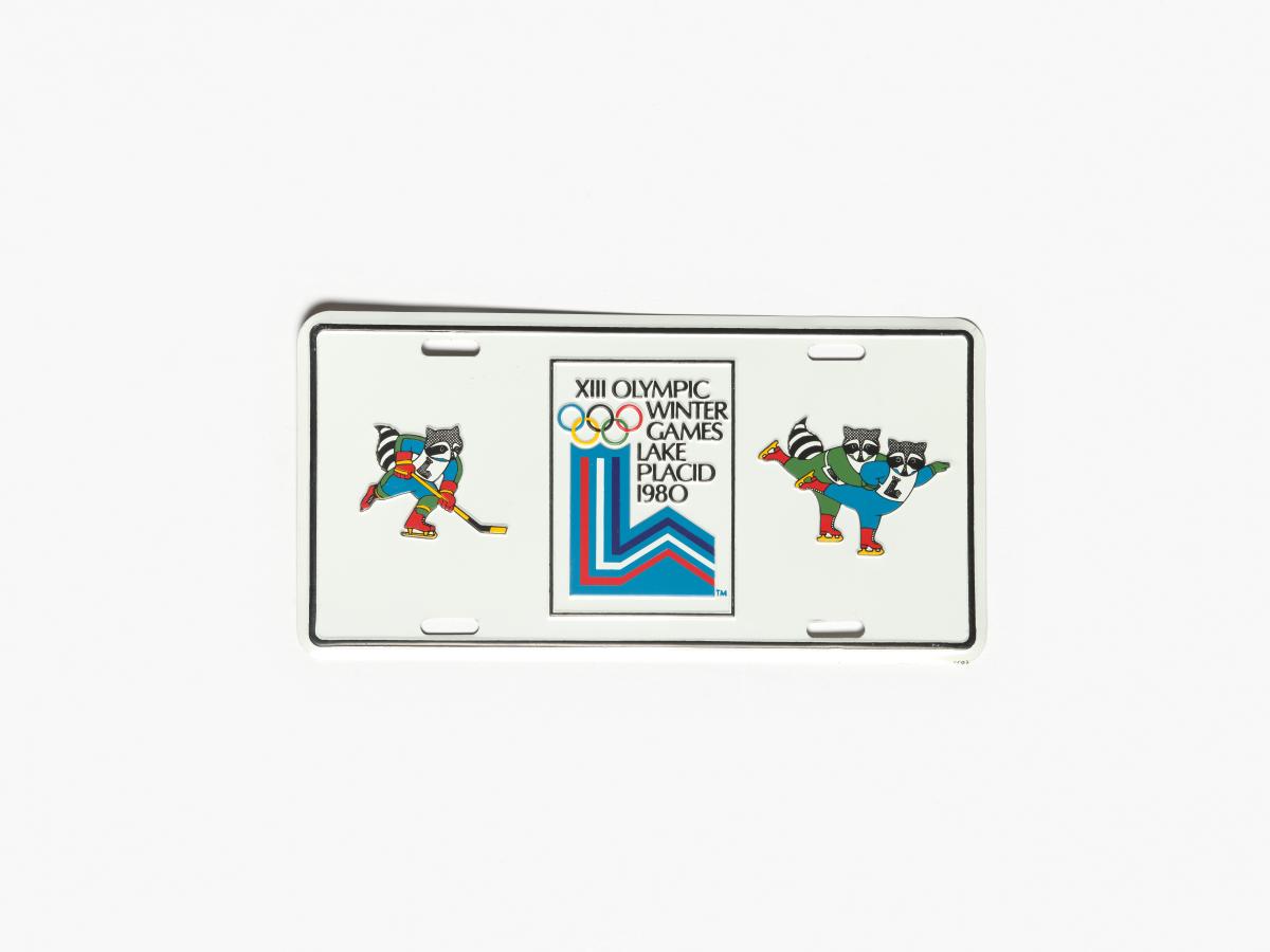 Lake Placid 1980, licence plate with the Games' emblem and Roni Raccoon, the Games' mascot.