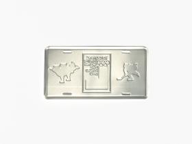 Licence plate. On the left, Roni Raccoon playing ice hockey; in the middle, Games' Emblem; on the right, Roni Raccoon making figure skating.