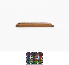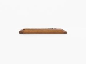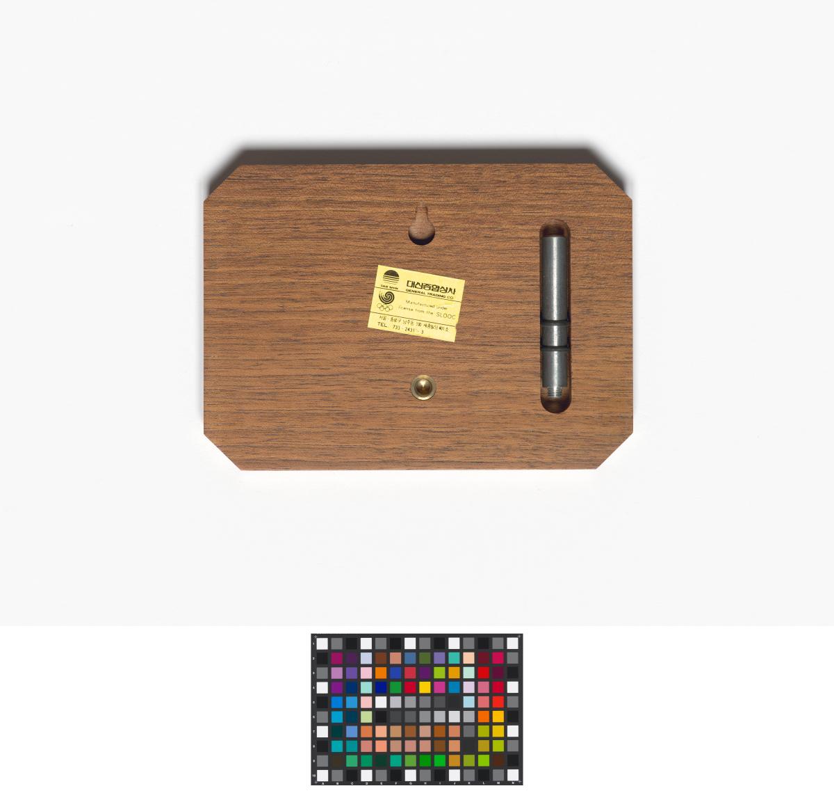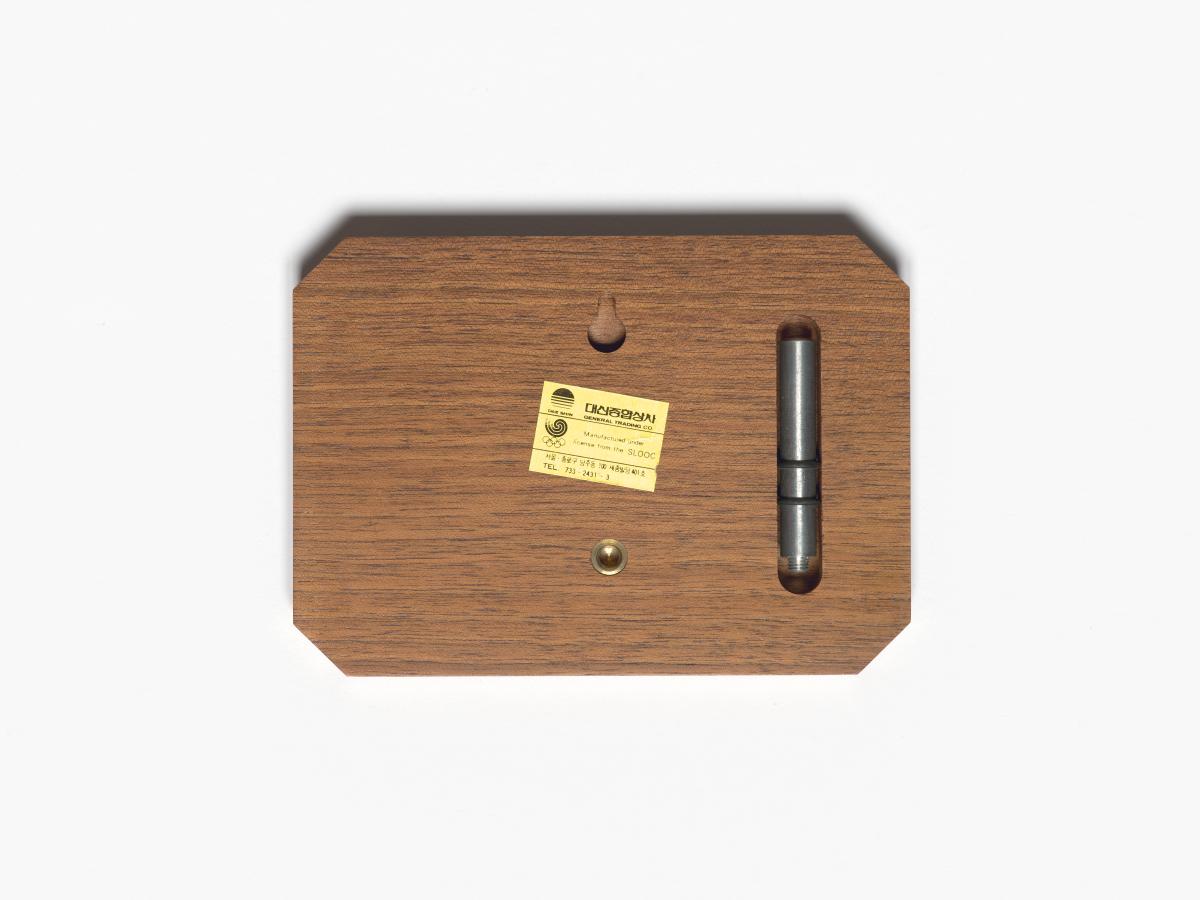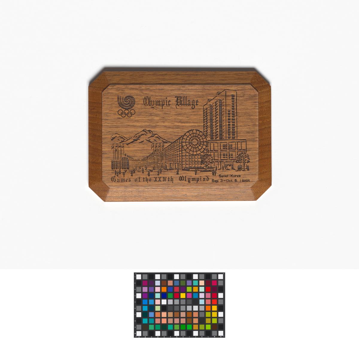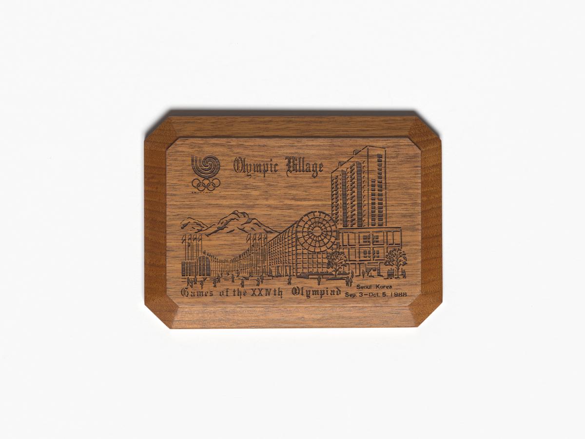Representation of the Olympic village engraved on the wood. Caption: "Games of the XXIVth Olympiad; sep. 3 - oct. 5 1988".