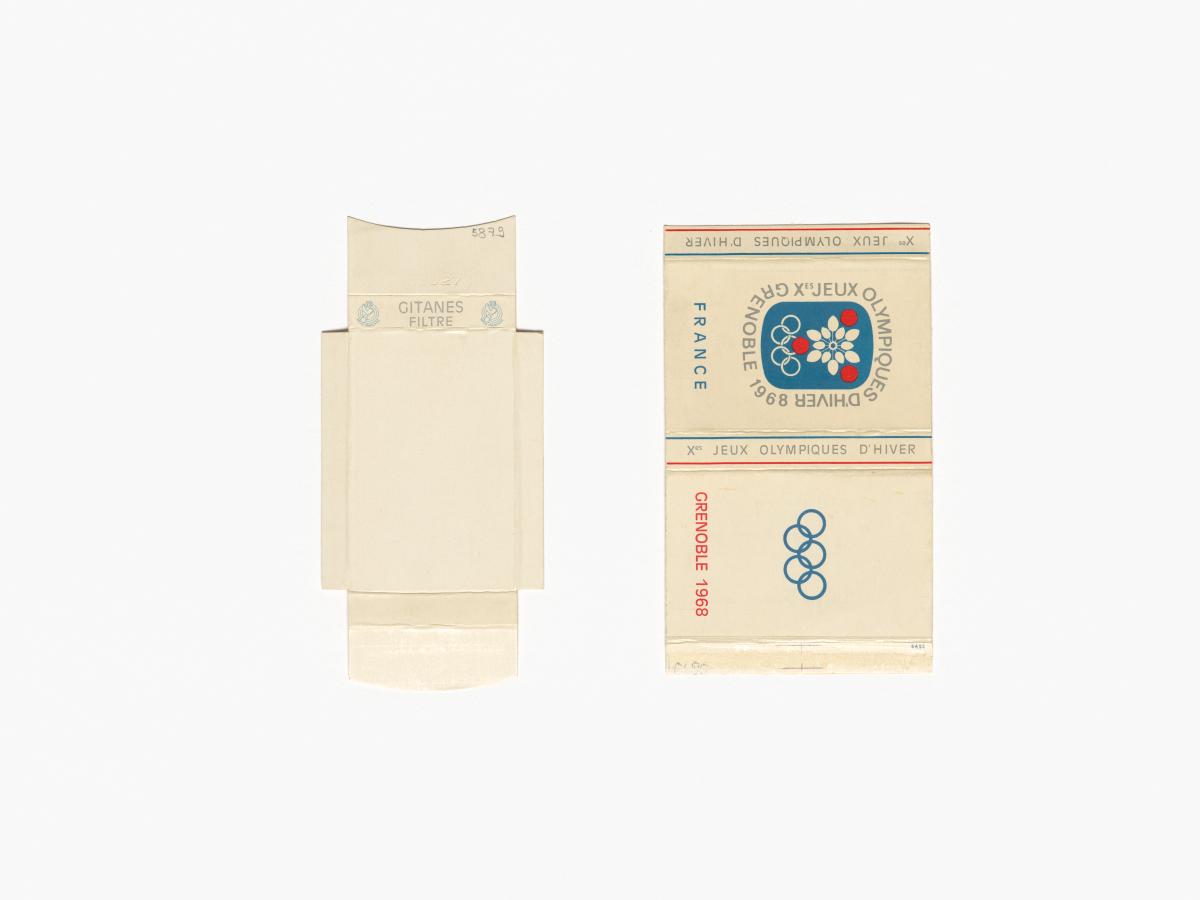Grenoble 1968, box of cigarette filters with the Games' emblem and the Olympic symbol.