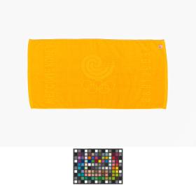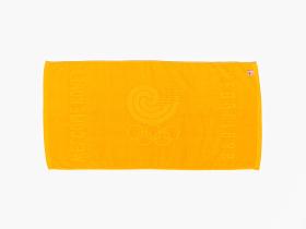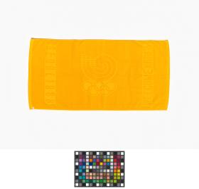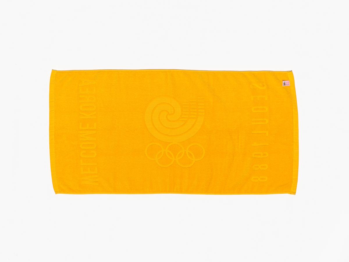 Bath towel with the Games emblem and the olympic symbol shown in the cloth thickness.