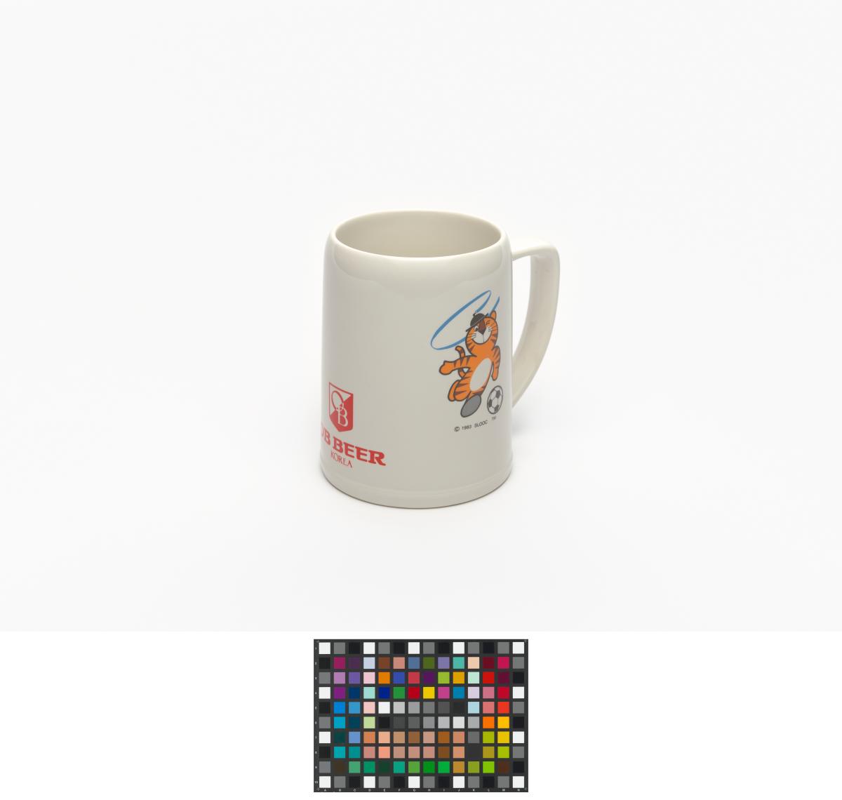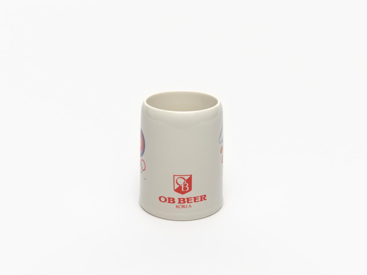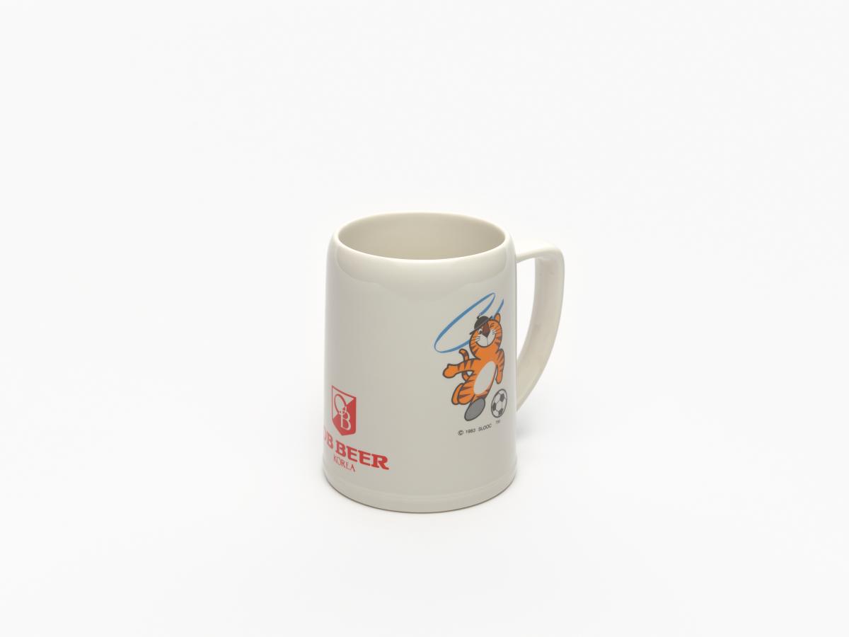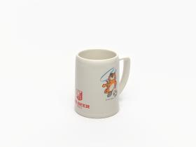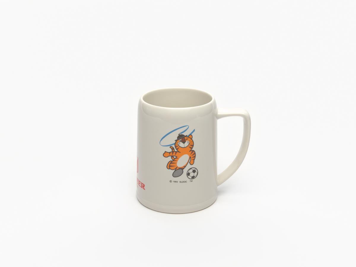 Seoul 1988, OB beer mug with Hodori, the Games' mascot, playing football and the Games' emblem.