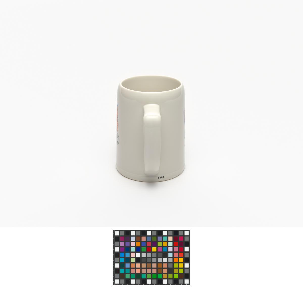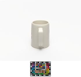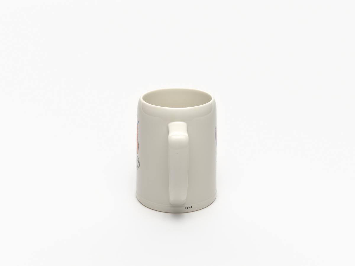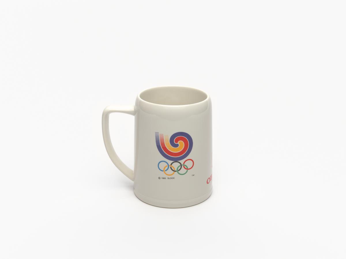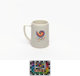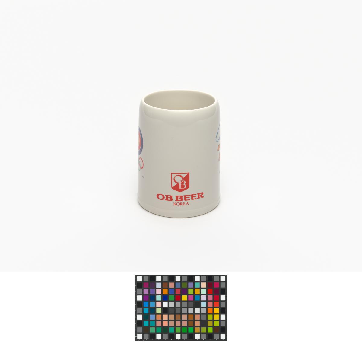 Seoul 1988, OB beer mug with Hodori, the Games' mascot, playing football and the Games' emblem.