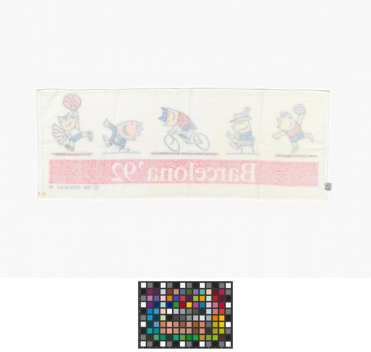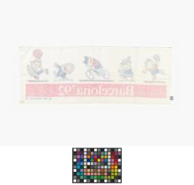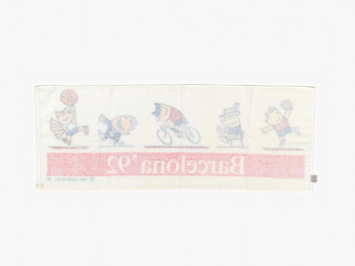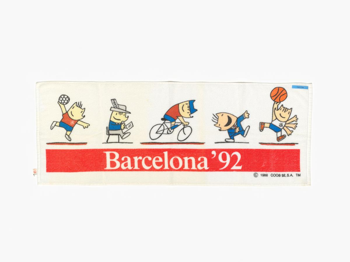 Barcelona 1992, bath towel with Cobi, the Games' mascot, practising various sports.