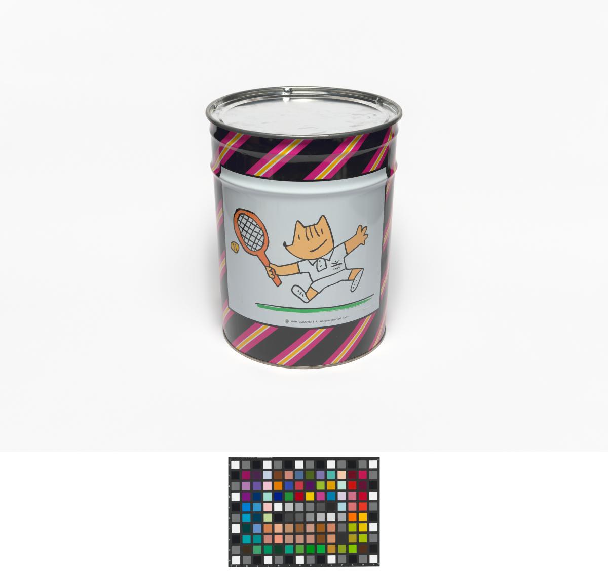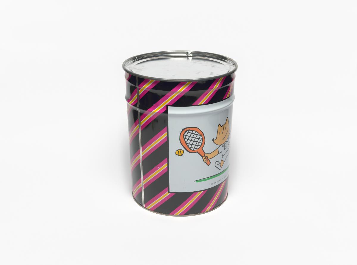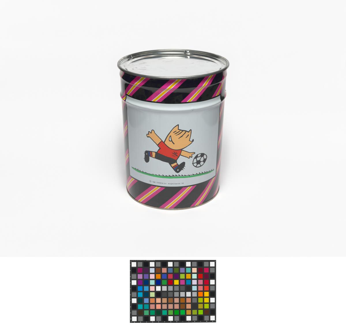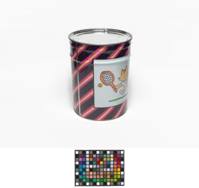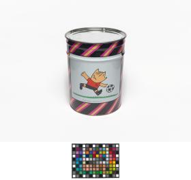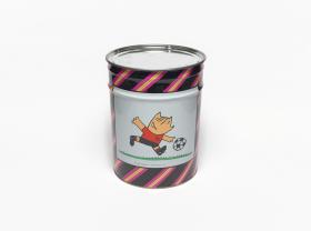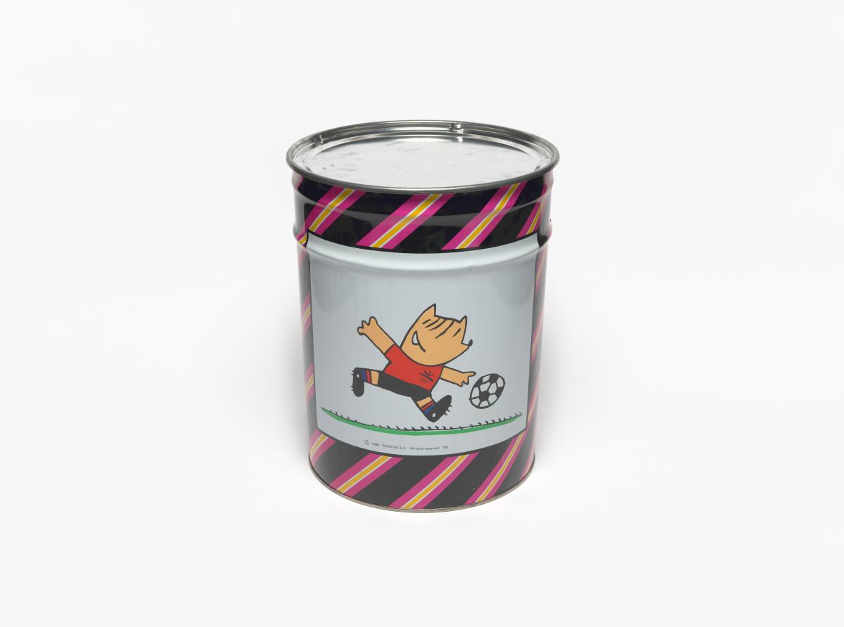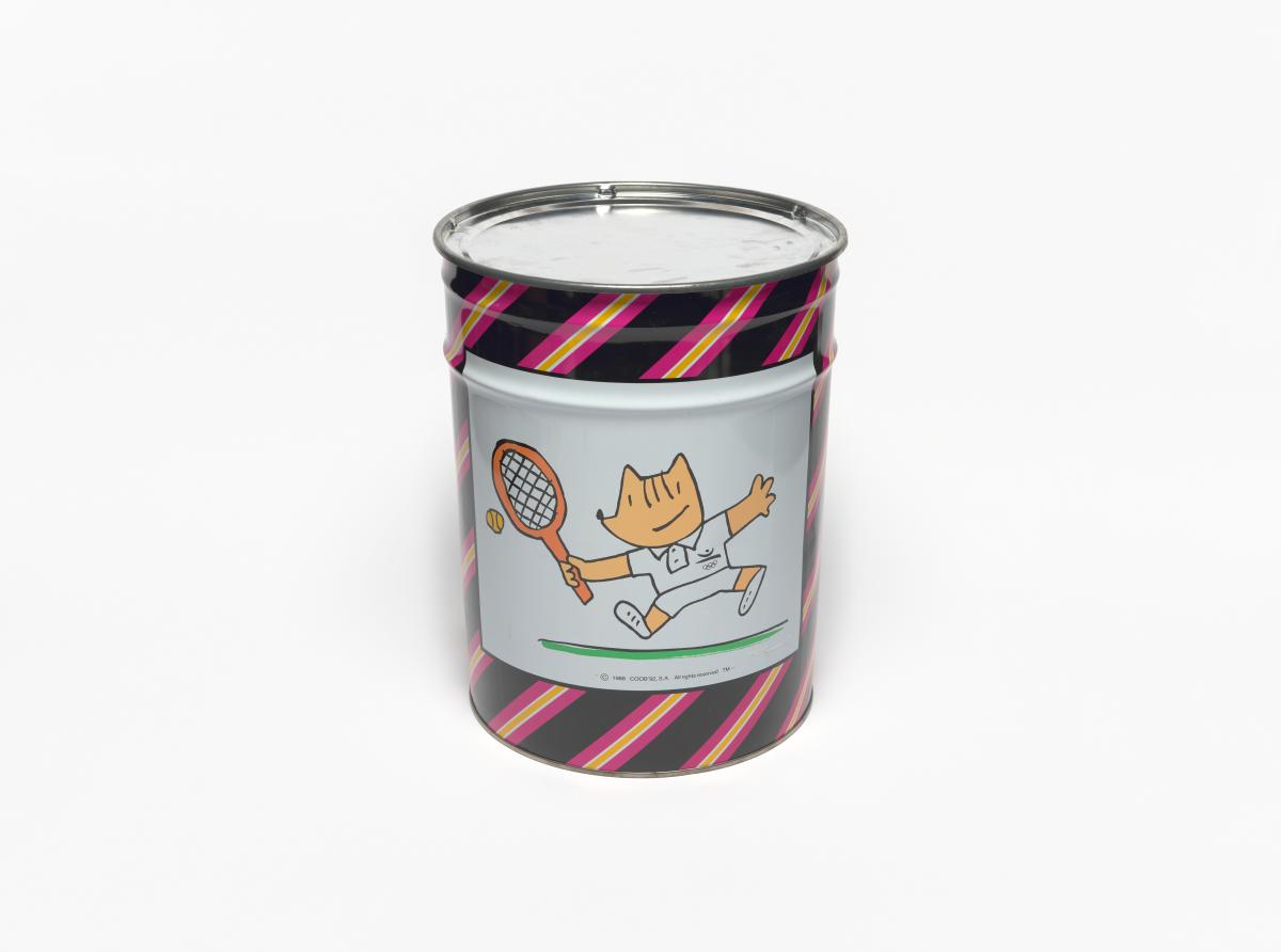 Cylindrical box with two white frames with images of Cobi playing tennis and Cobi playing football.