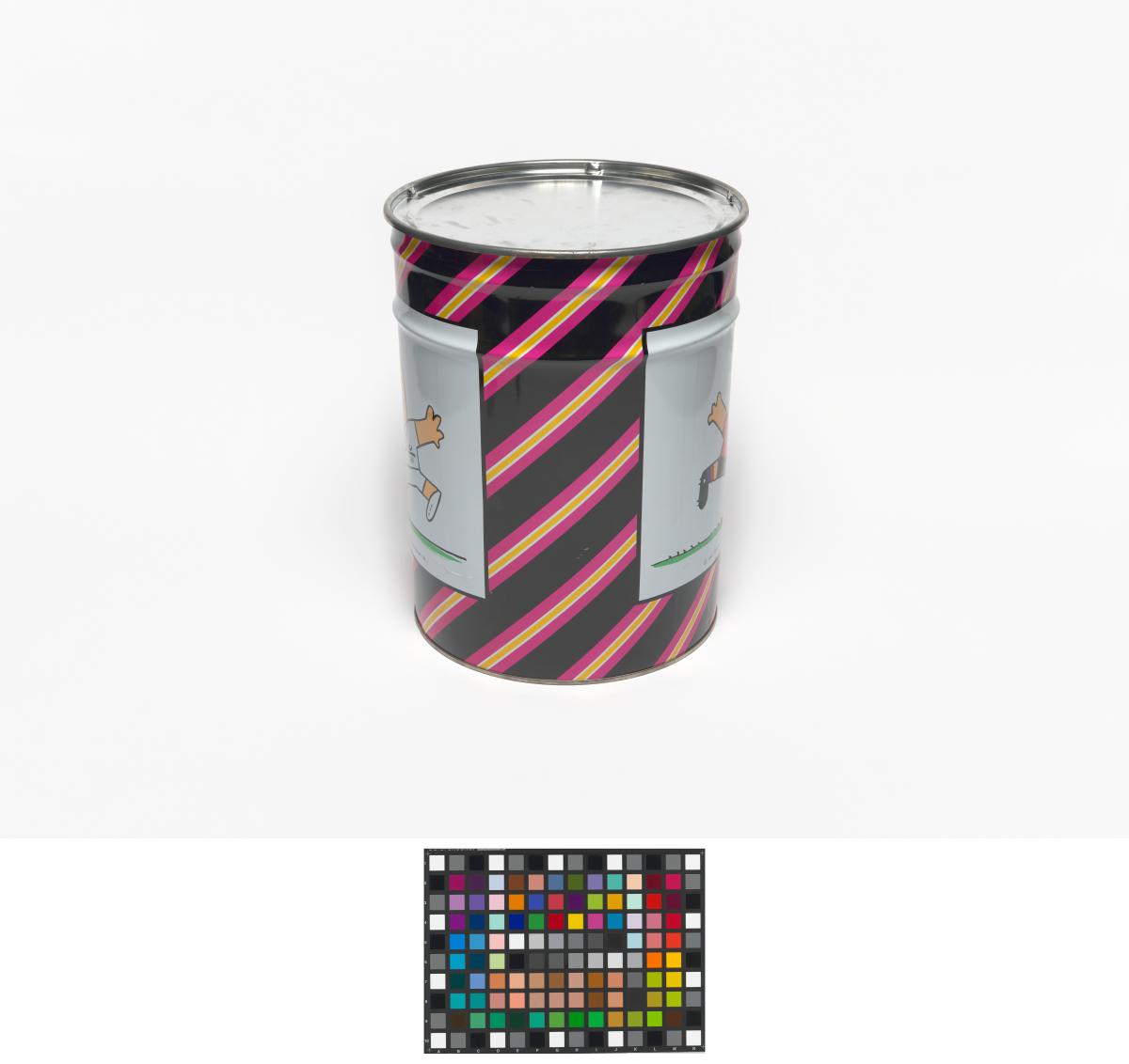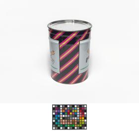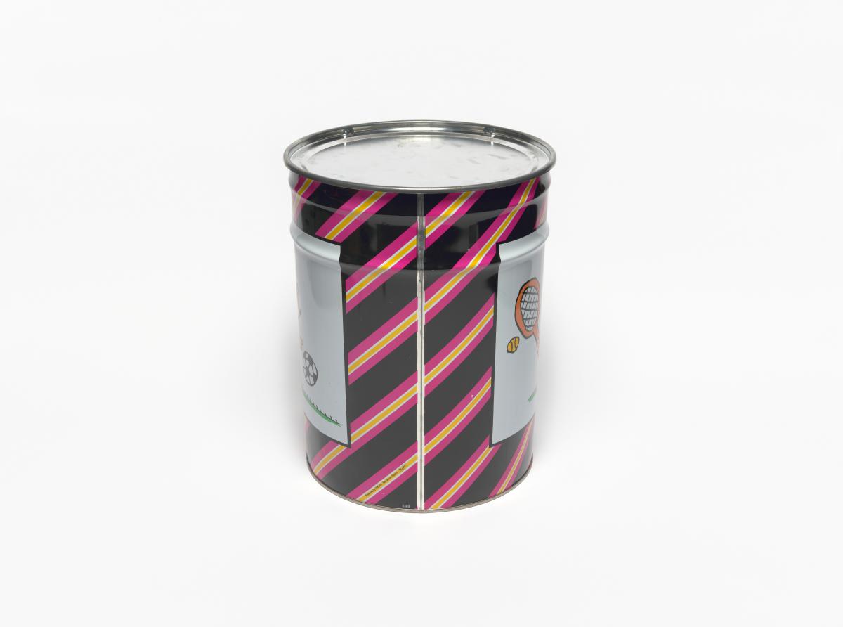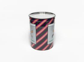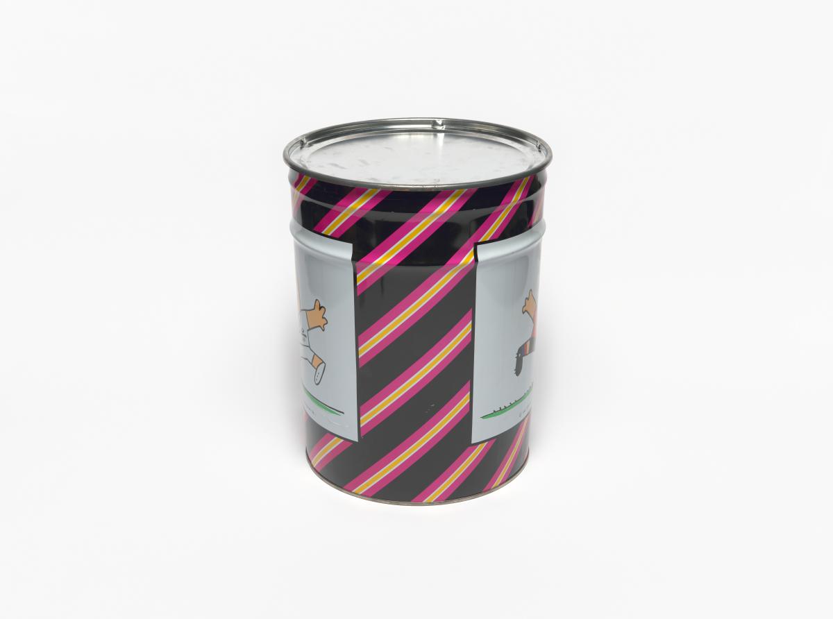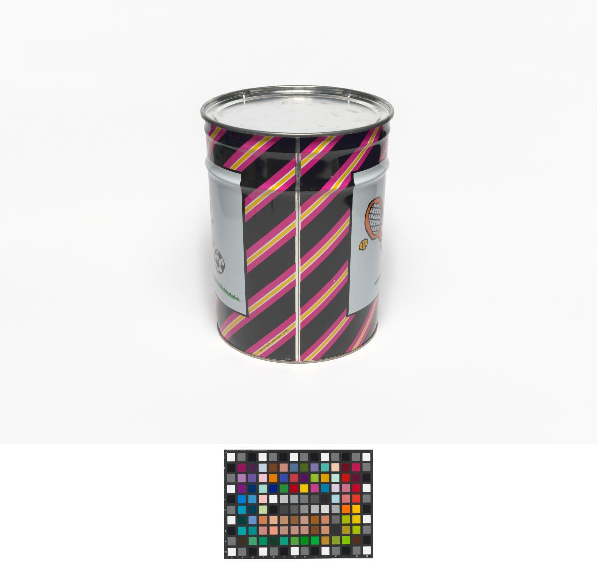 Cylindrical box with two white frames with images of Cobi playing tennis and Cobi playing football.