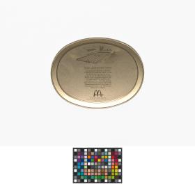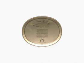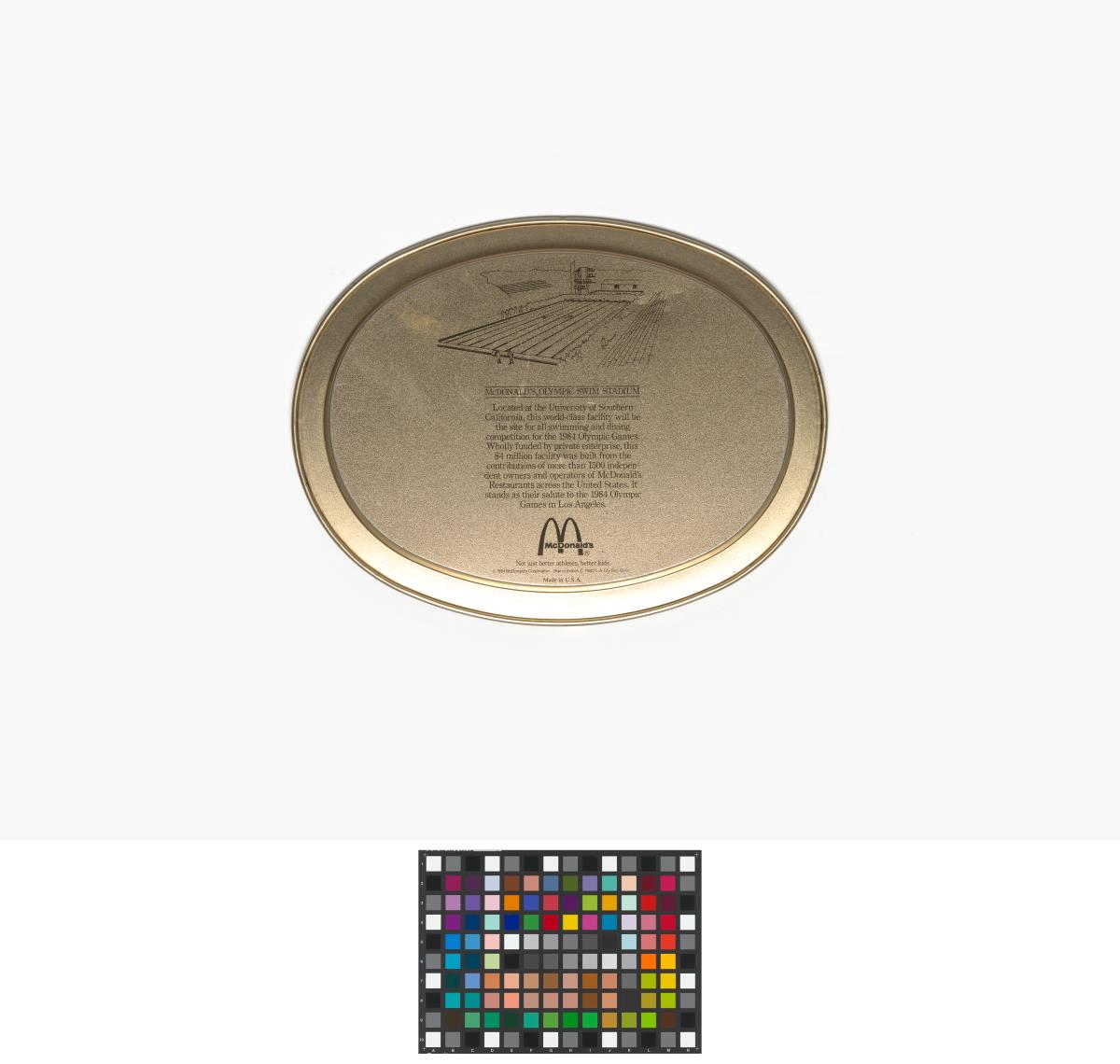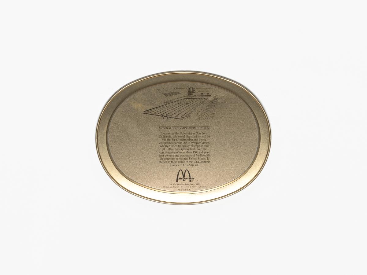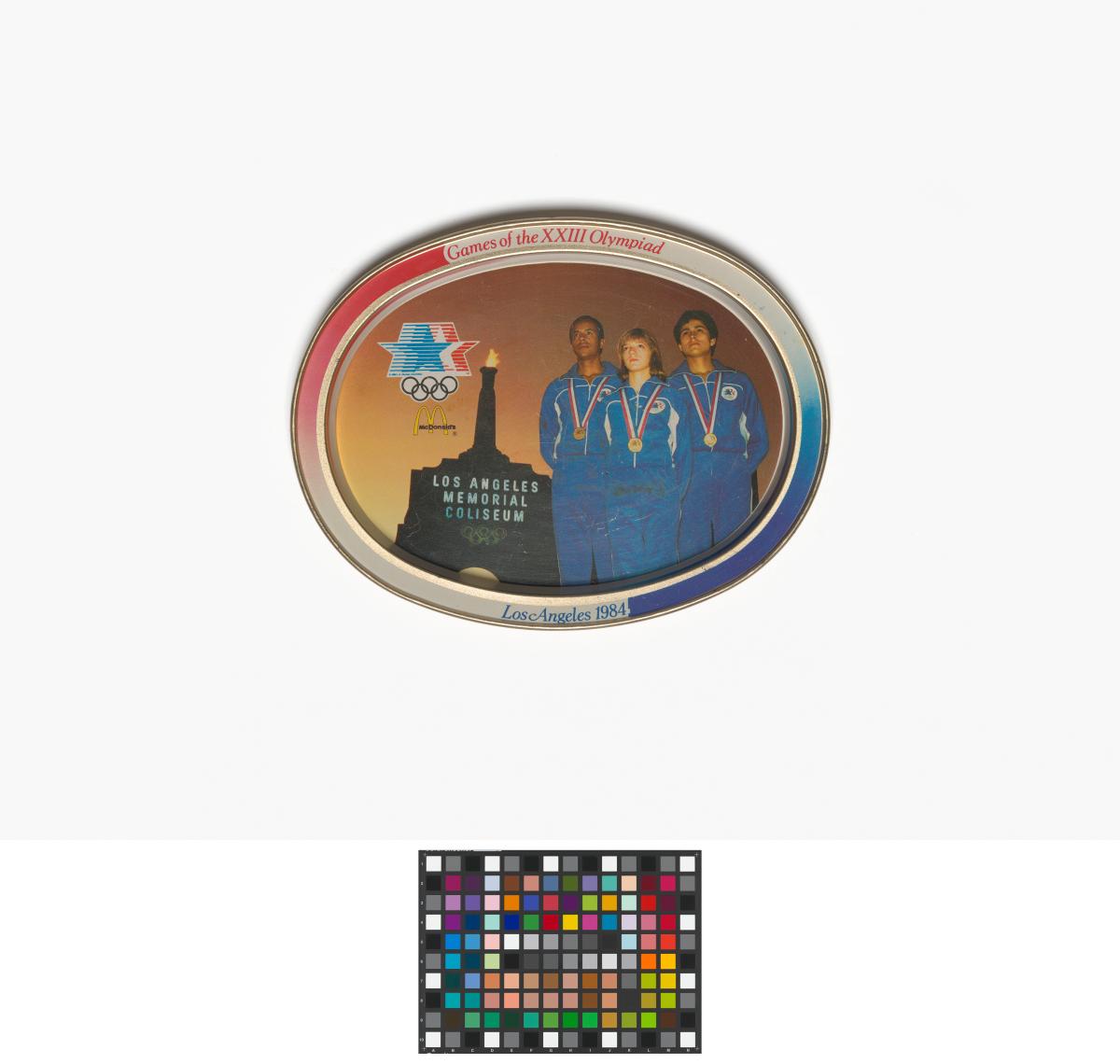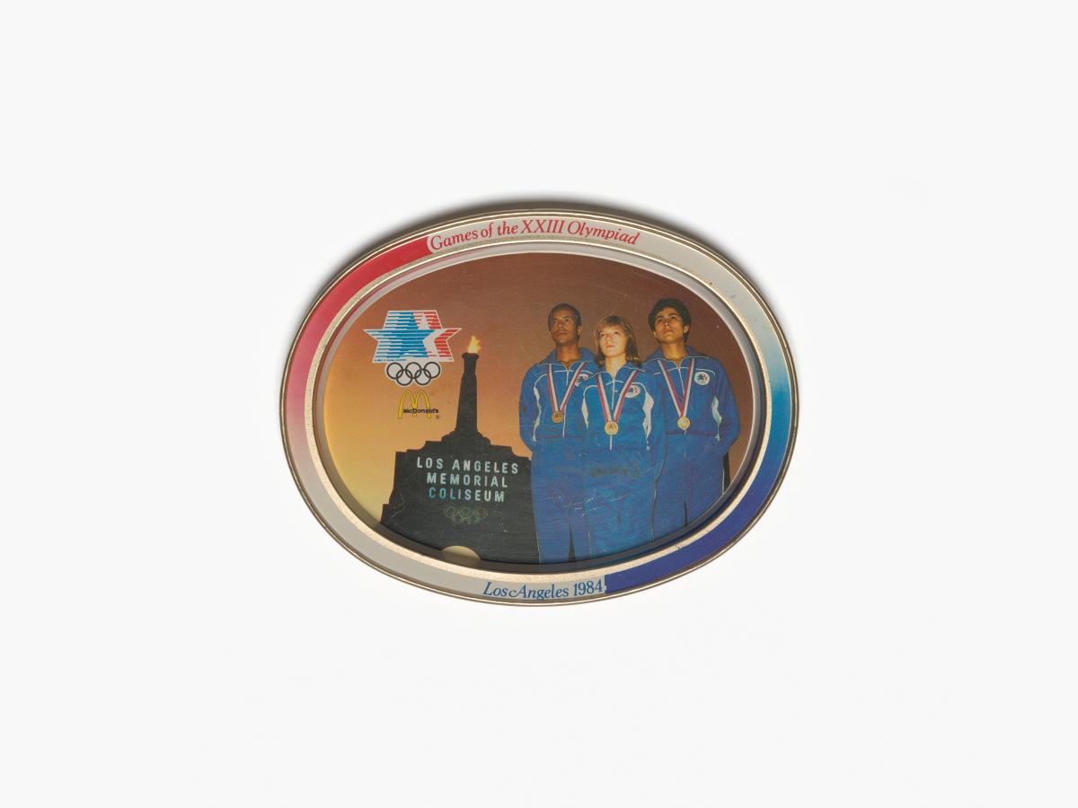 In the middle, a photography of three medalists, the Memorial Coliseum in the background, the Games' emblem and the logo of MacDonald's. On the rim, the caption: "Games of the XXIII Olympiad ; Los Angeles 1984".