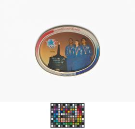 Los Angeles 1984, tray with three medallists and the Memorial Coliseum in the background.