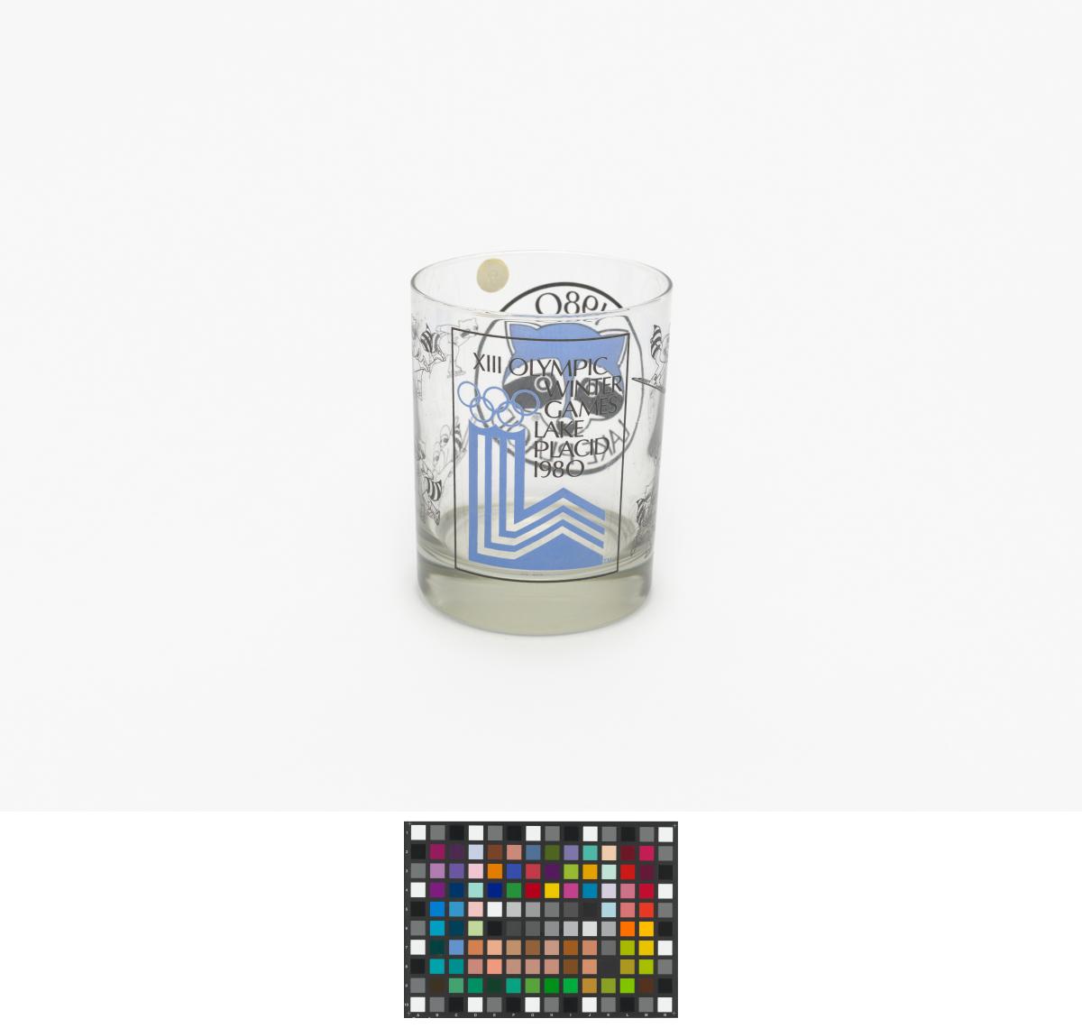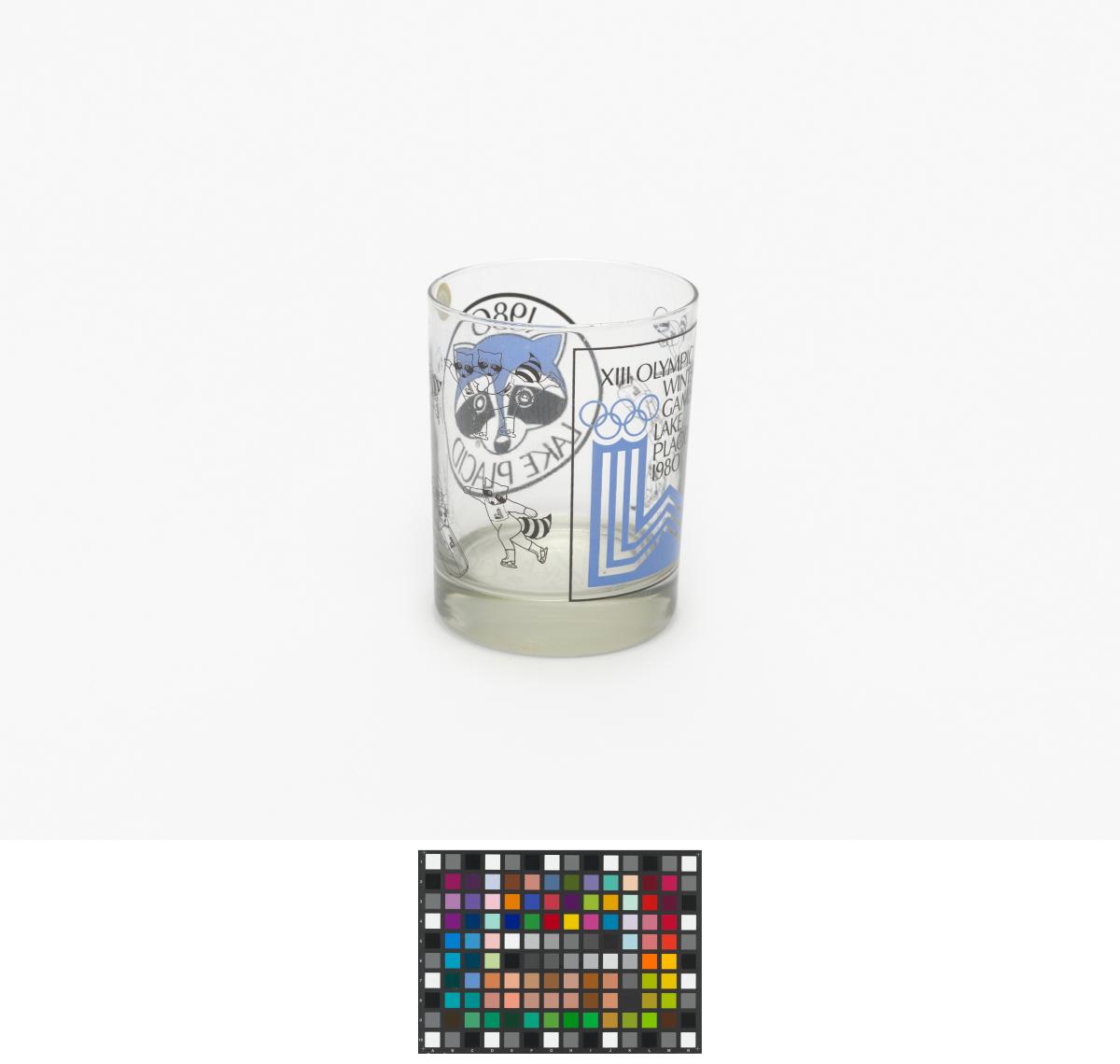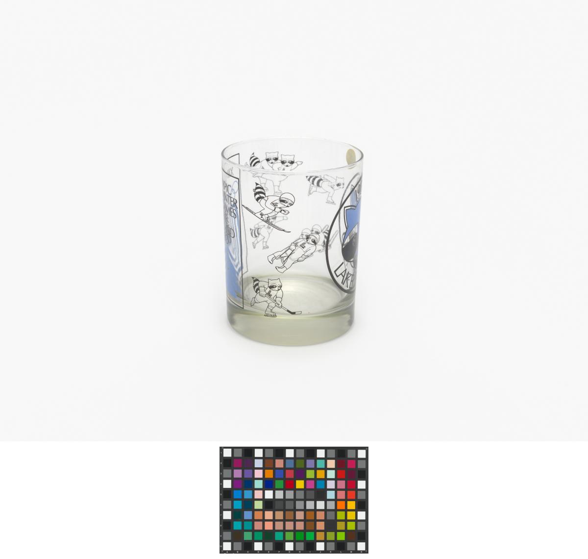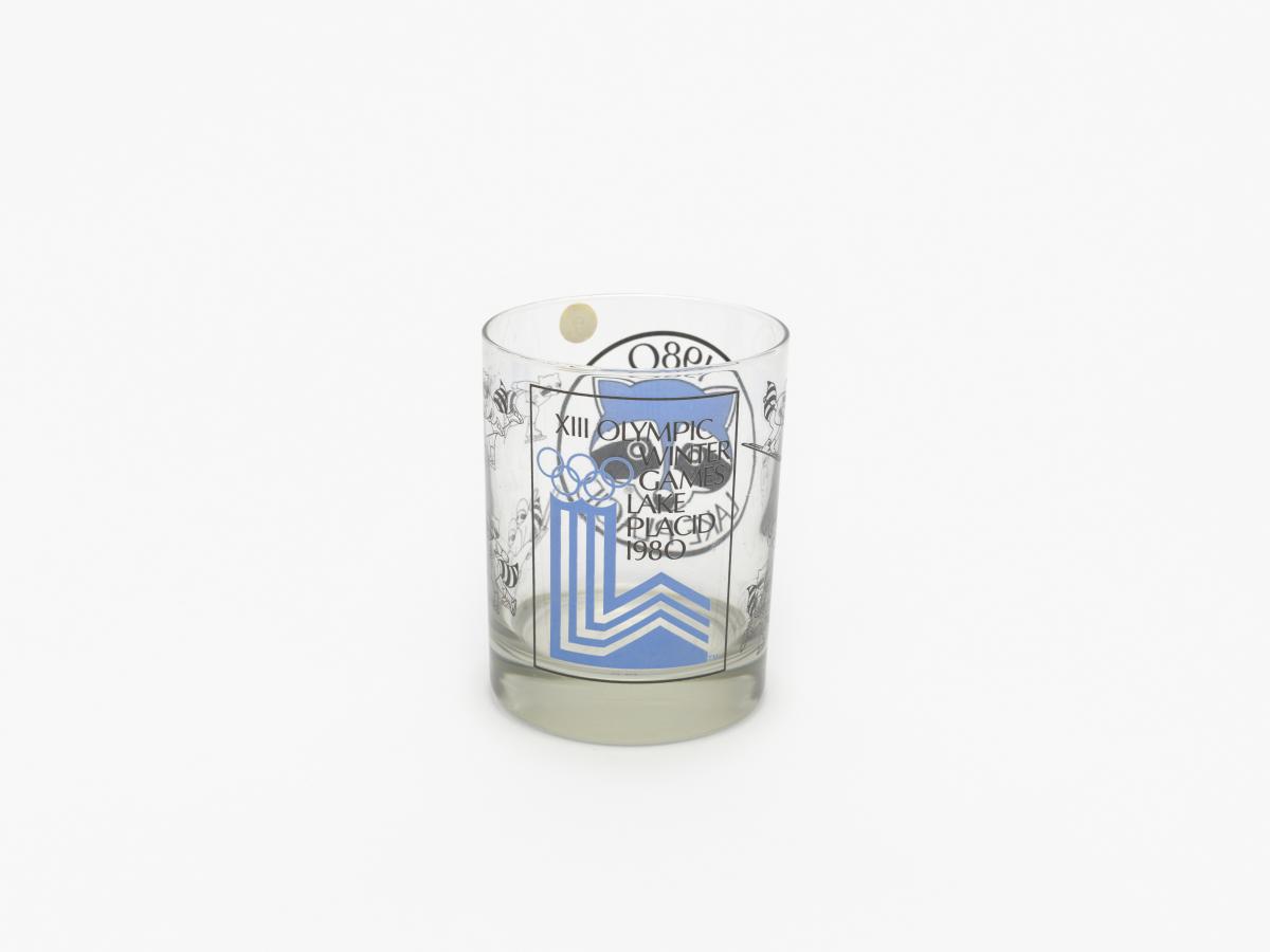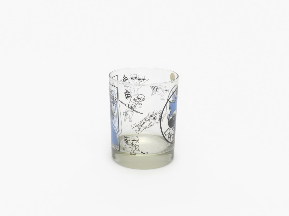 Lake Placid 1980, glass with the Games' emblem and the head of Roni Raccoon, the Games' mascot.