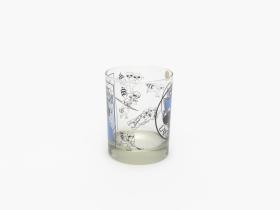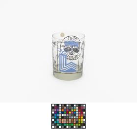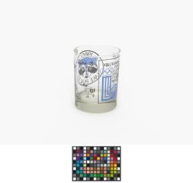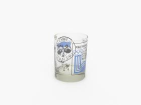 Glass with the Games' Emblem, Roni Raccon playing several winter sports and the head of Roni Raccoon, the Games' mascot.