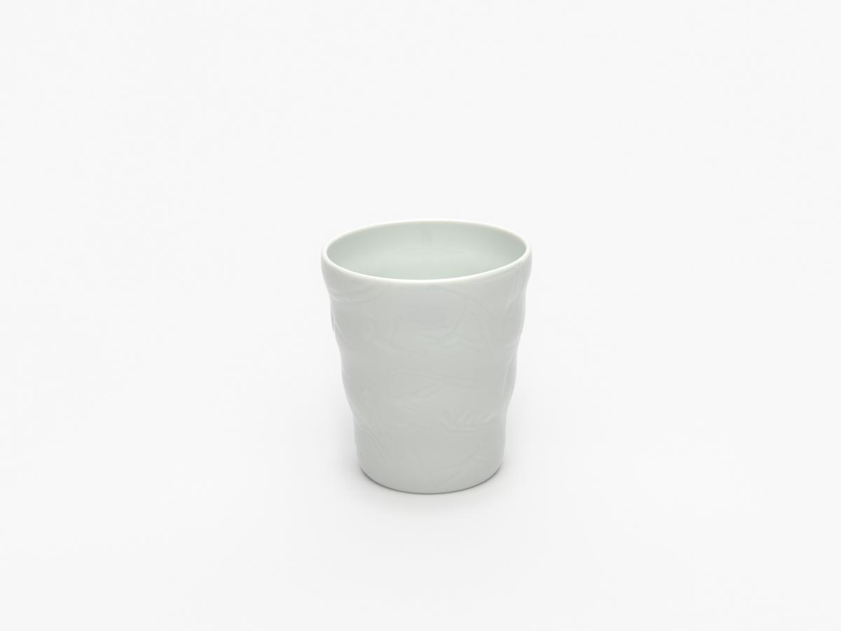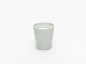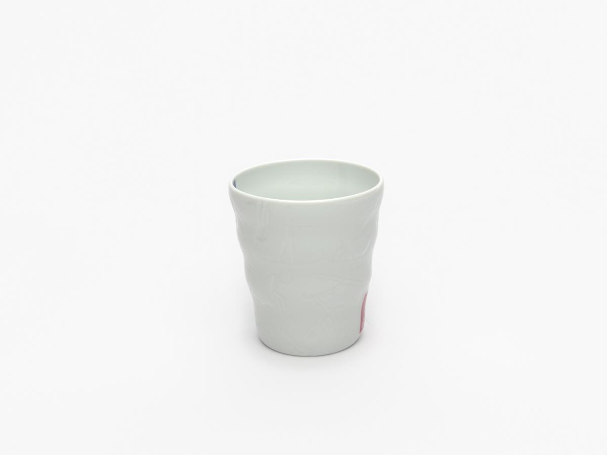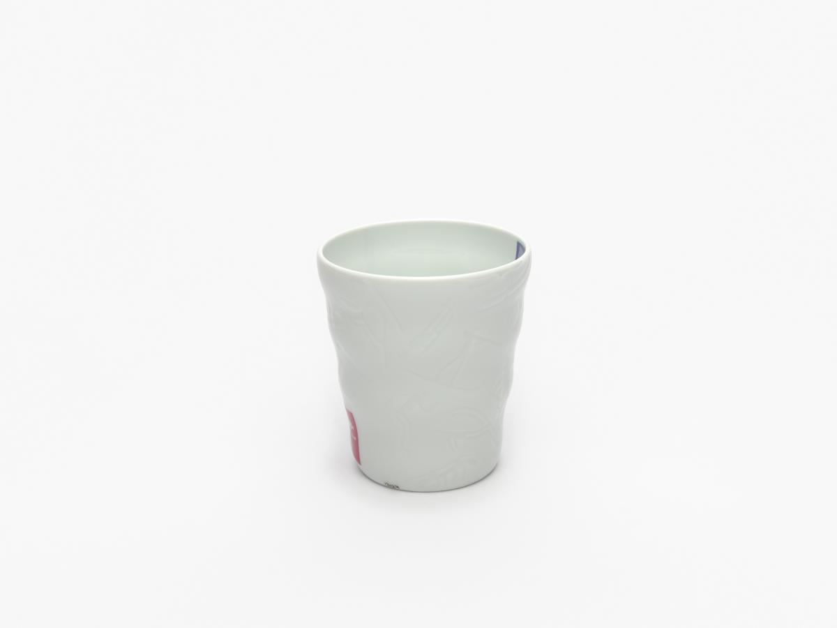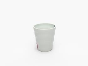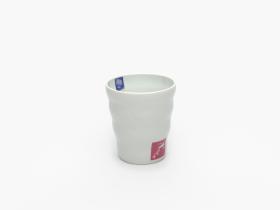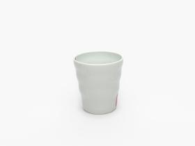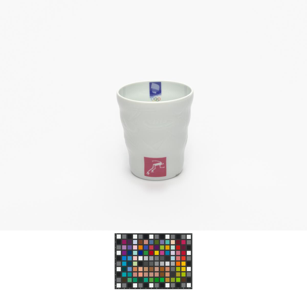 Waved white porcelain cup with the speed skating pictogram and the Games' Emblem.