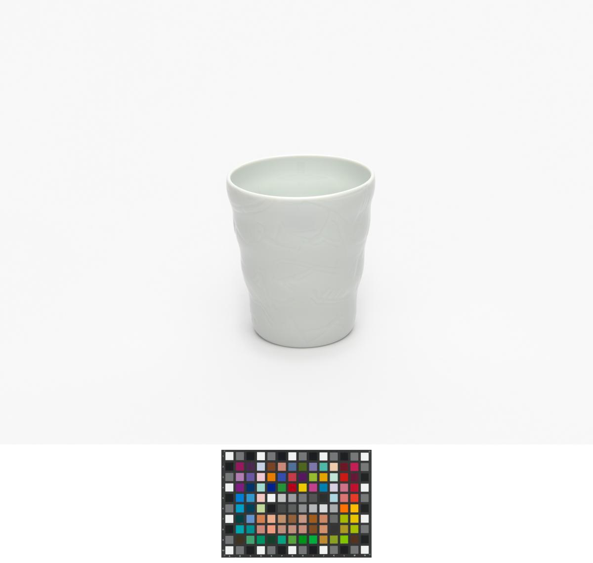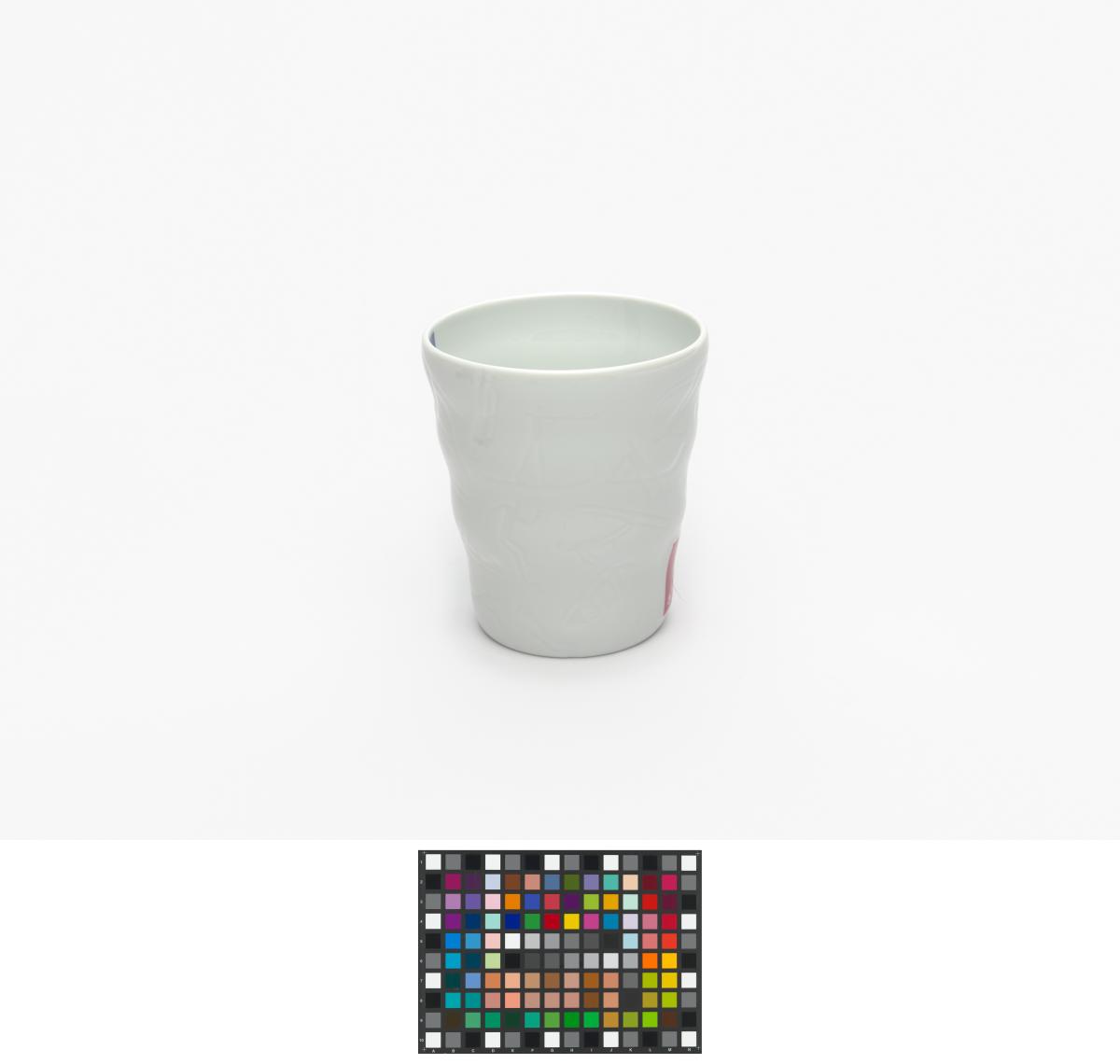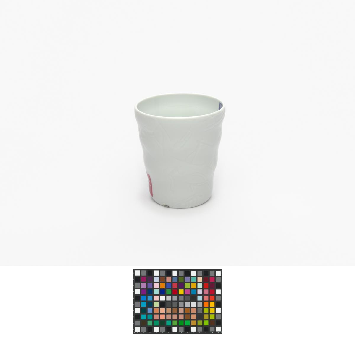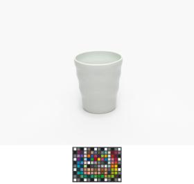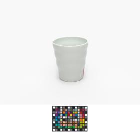 Waved white porcelain cup with the speed skating pictogram and the Games' Emblem.