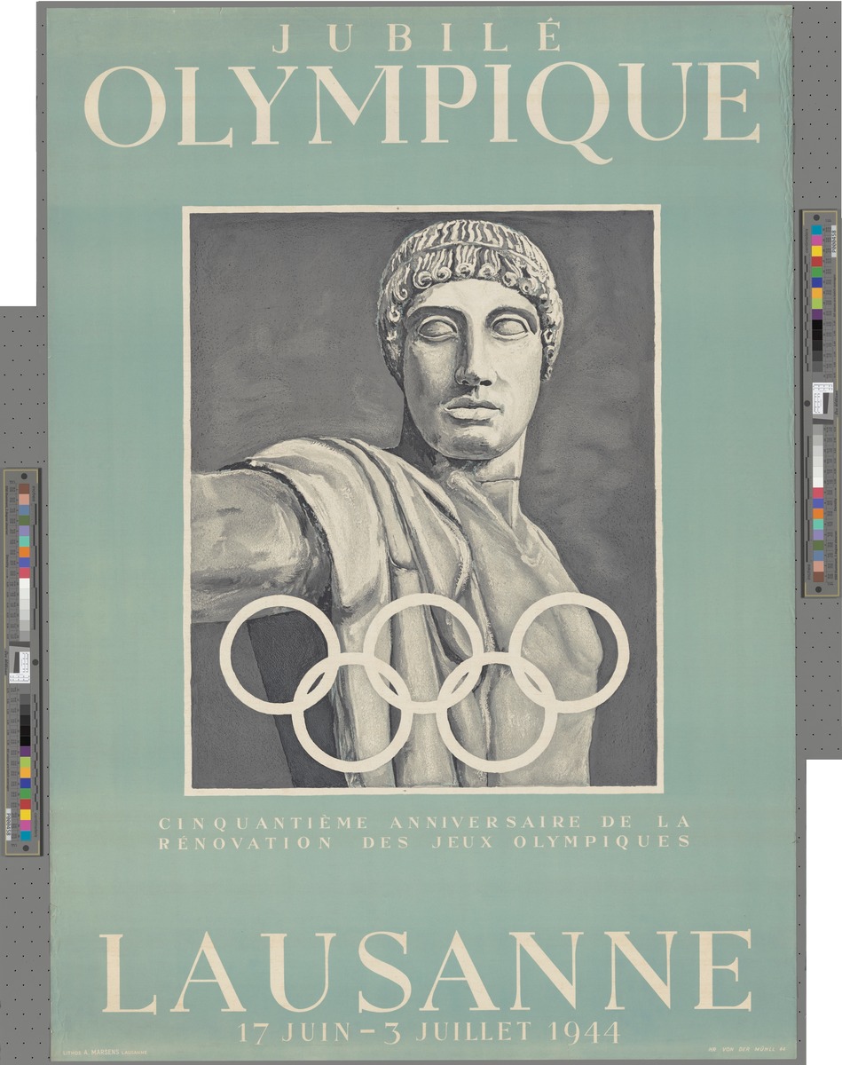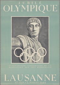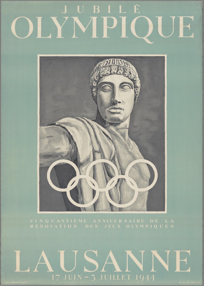 Antique statue and Olympic rings. Caption: "Jubilé Olympique Cinquantième anniversaire de la rénovation des Jeux Olympiques Lausanne 17 juin - 3 juillet 1944".