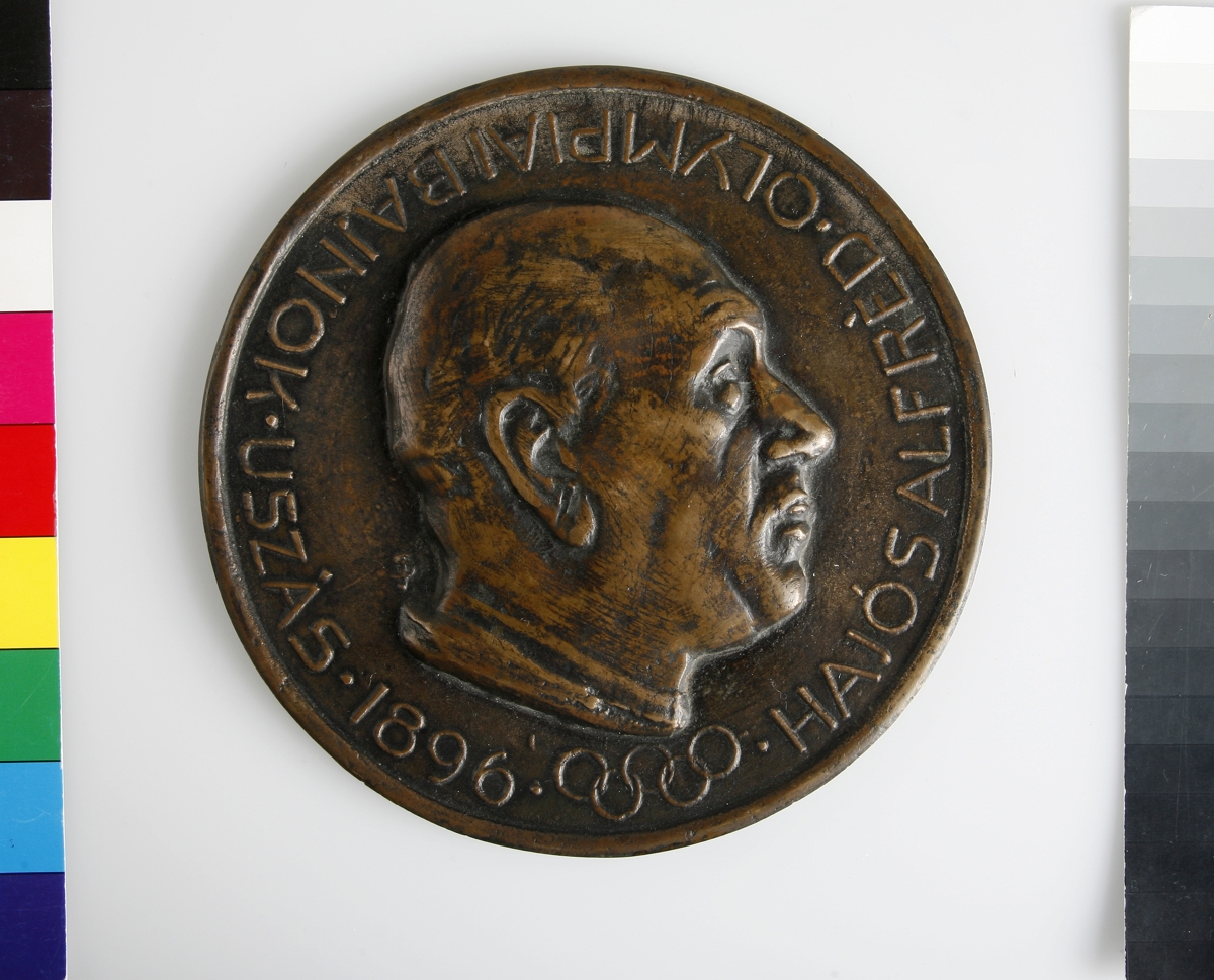 Athlete's head in profile already old and caption: "HAJÓS ALFRÈD -OLYMPIAI BAJNOK - USZÀS (=swimming olympic champion) - 1896". Artist's monogram "SJ". Olympic Symbol.