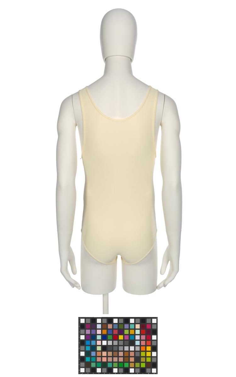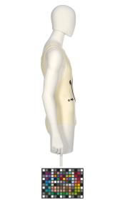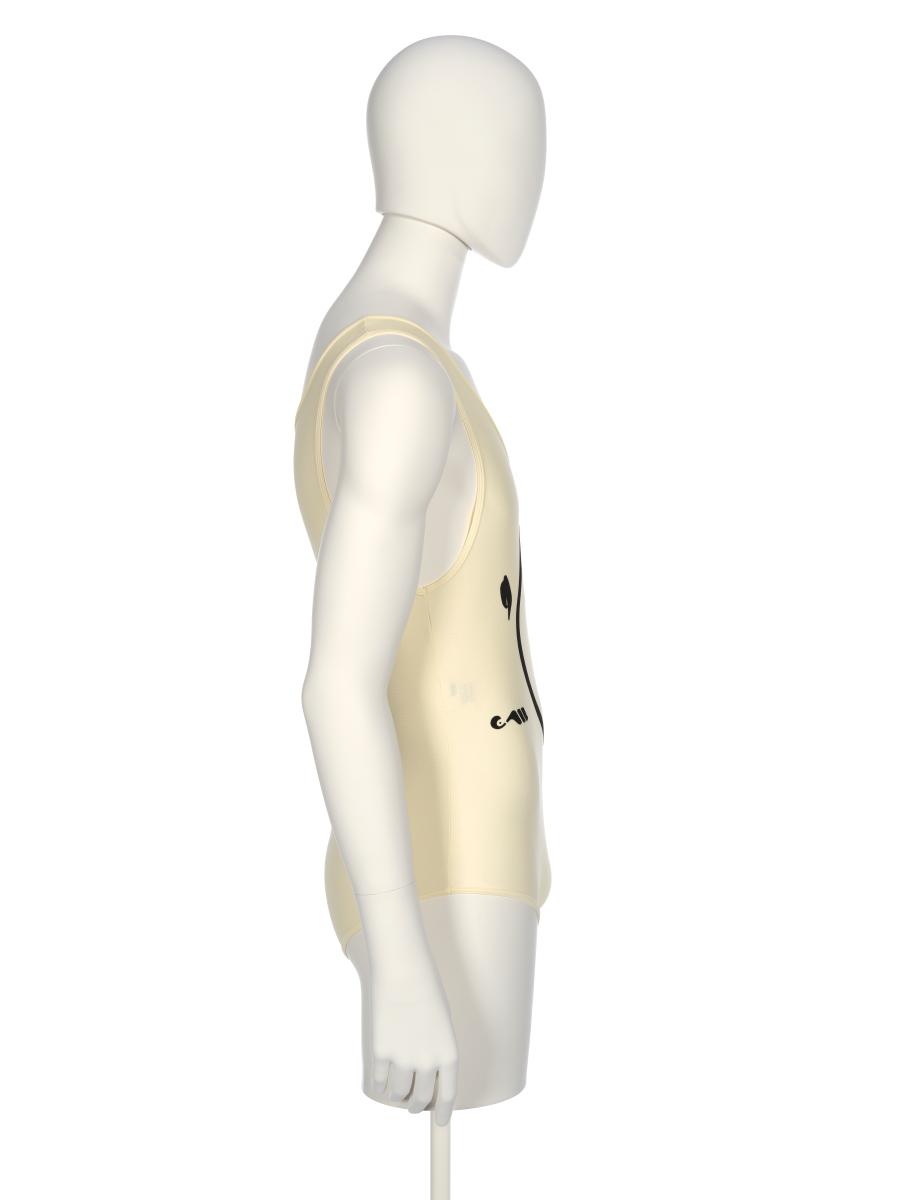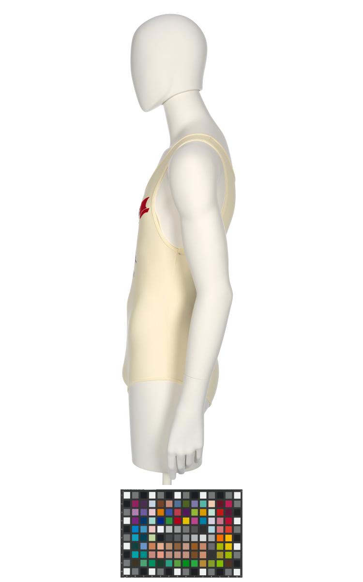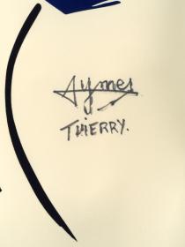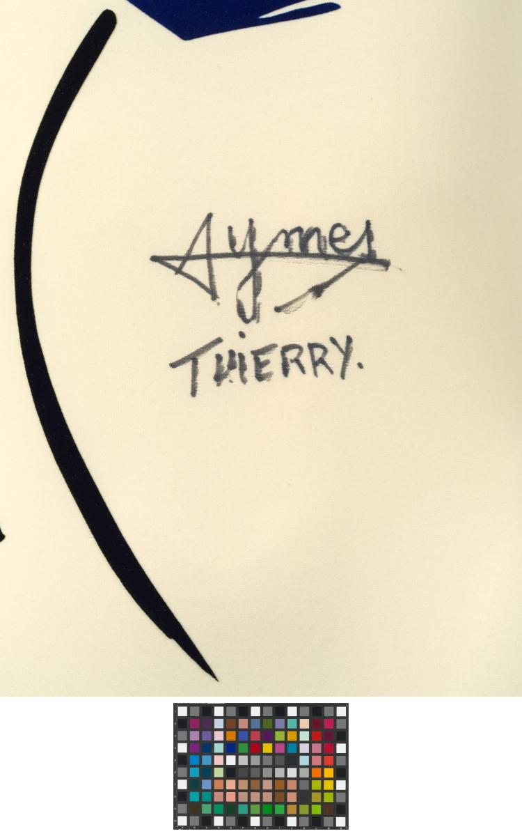 White body. In the middle, on the right, brand's logo. At the top, on the left, logo of the Fédération Française de Gymnastique. In the middle, athlete's autograph.