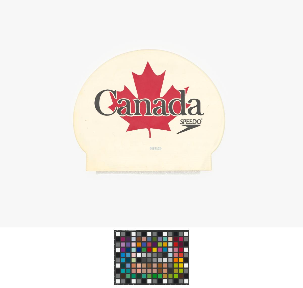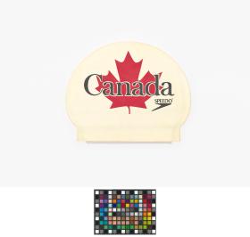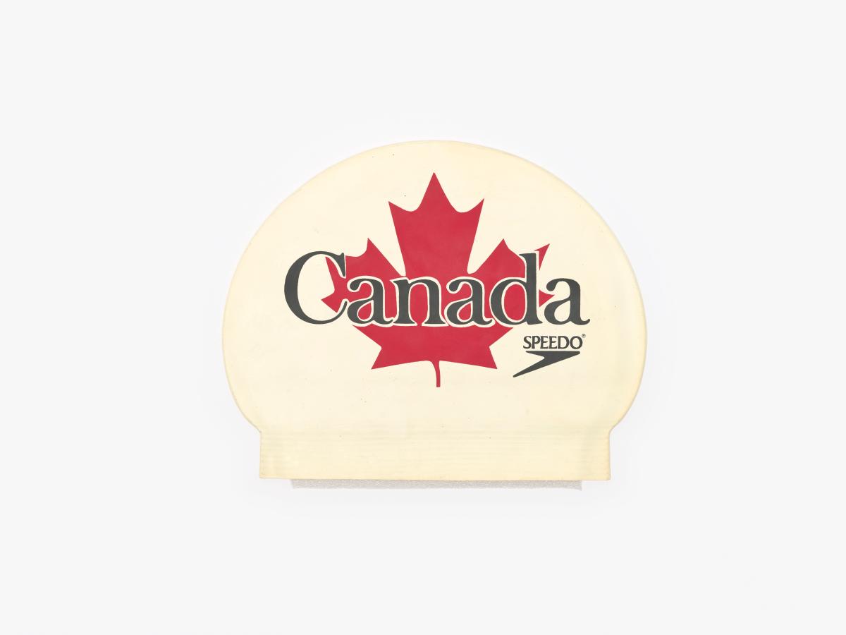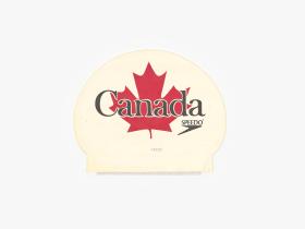 White swimming cap with maple leaf of Canada and the caption: "Canada". Manufacturer's logo.