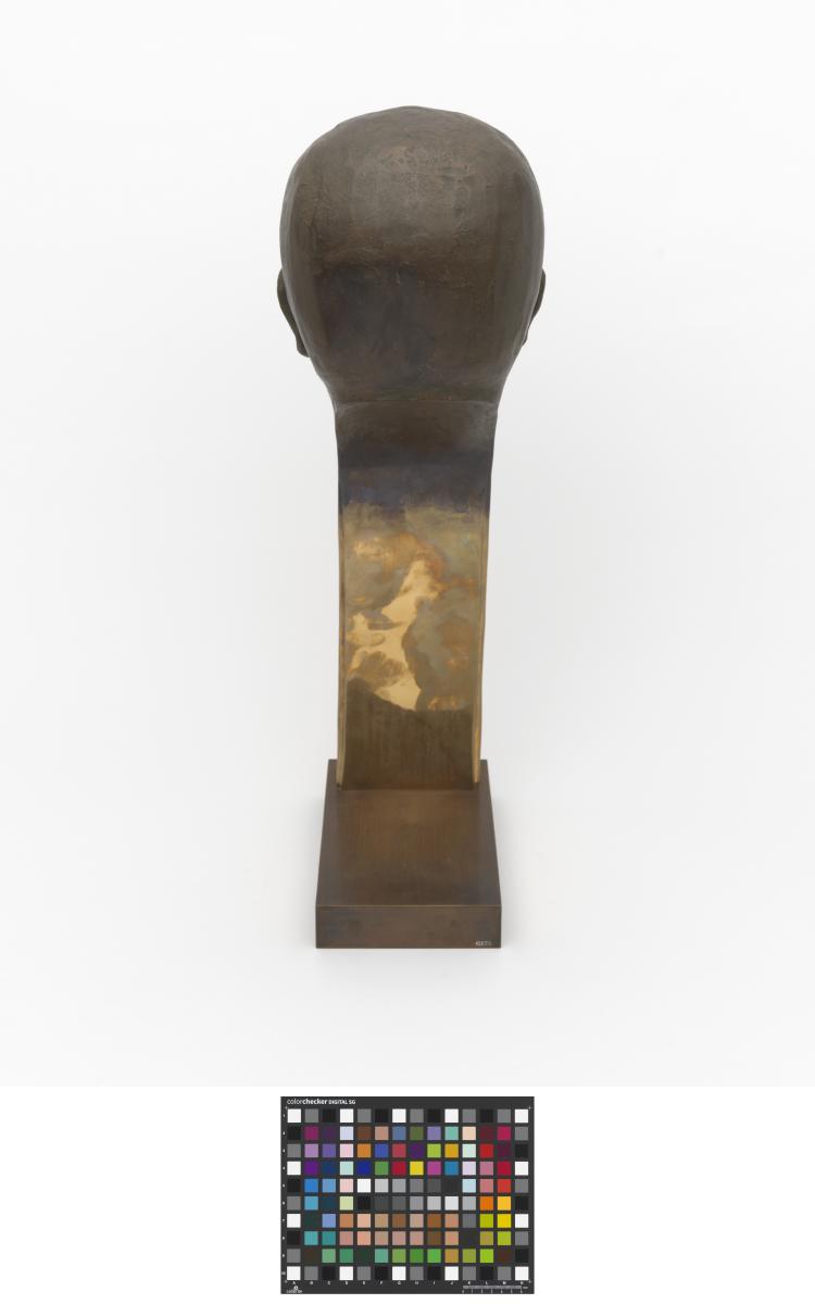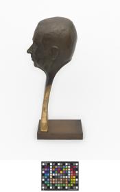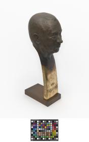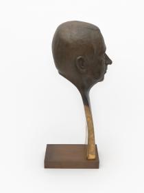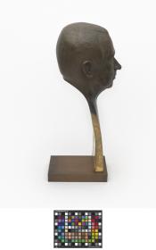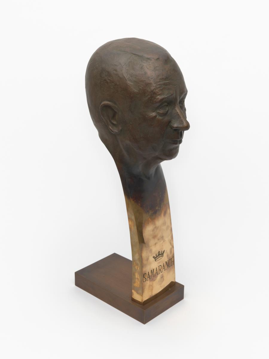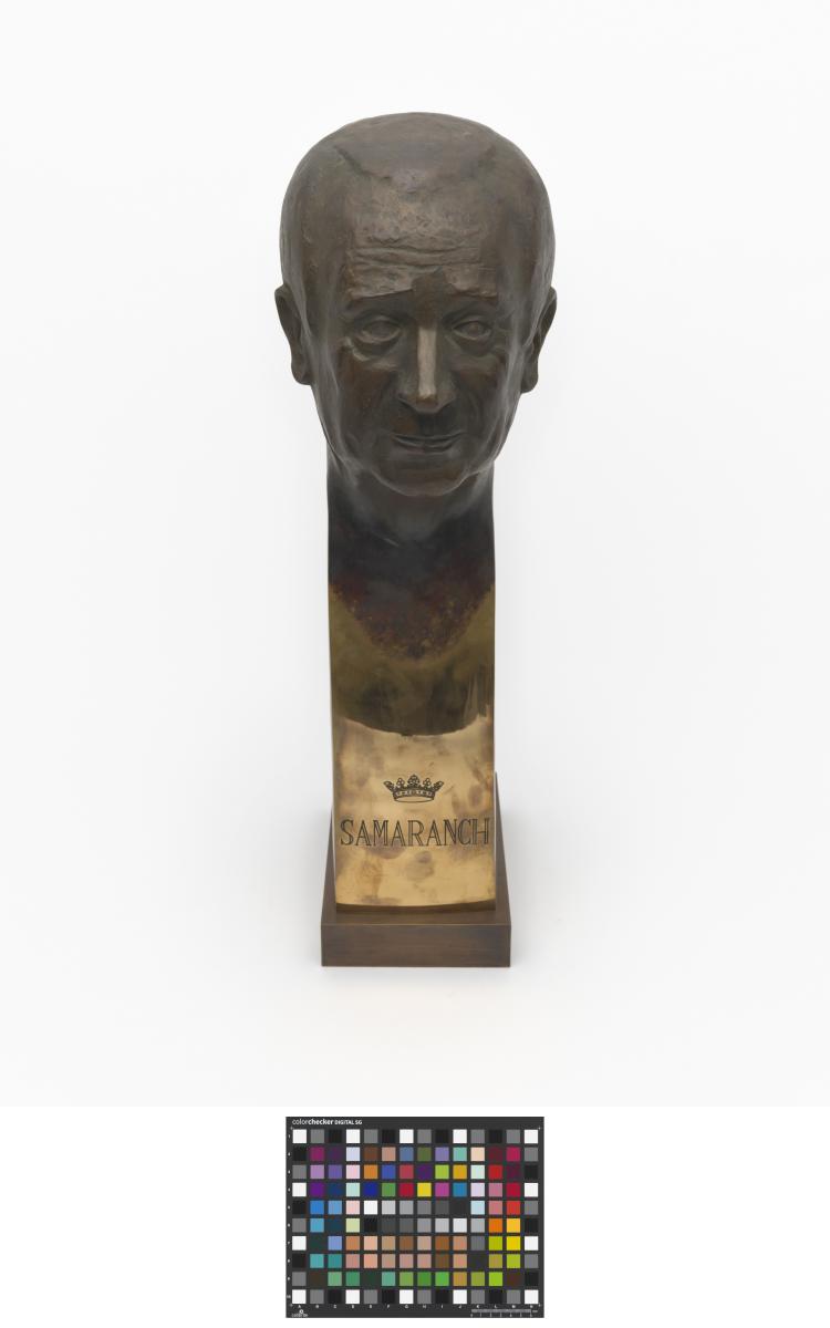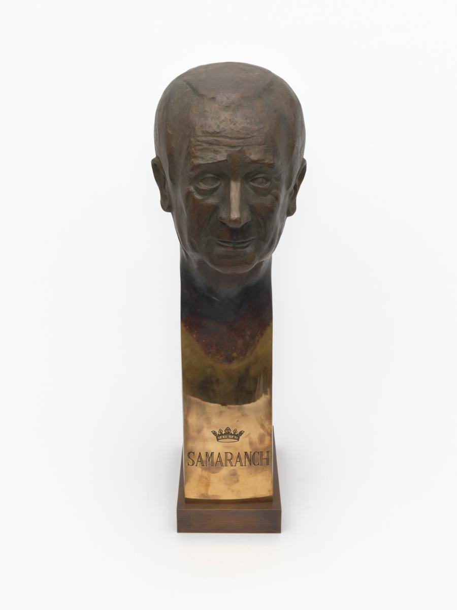 At the bottom of the stylised bust, a crown and the cap. "Samaranch" are engraved. Signed: Rosa Serra.