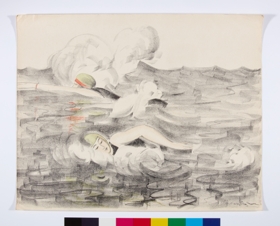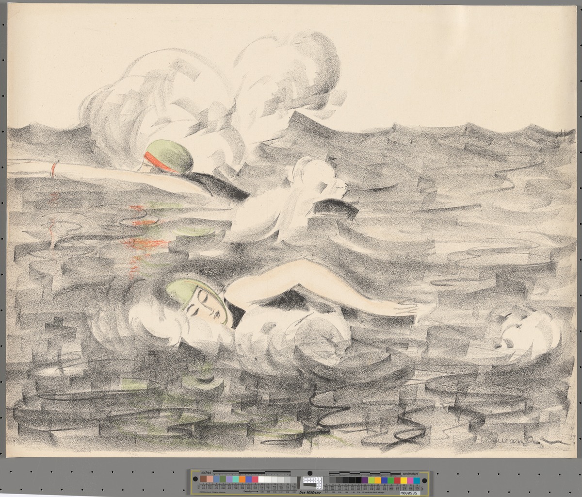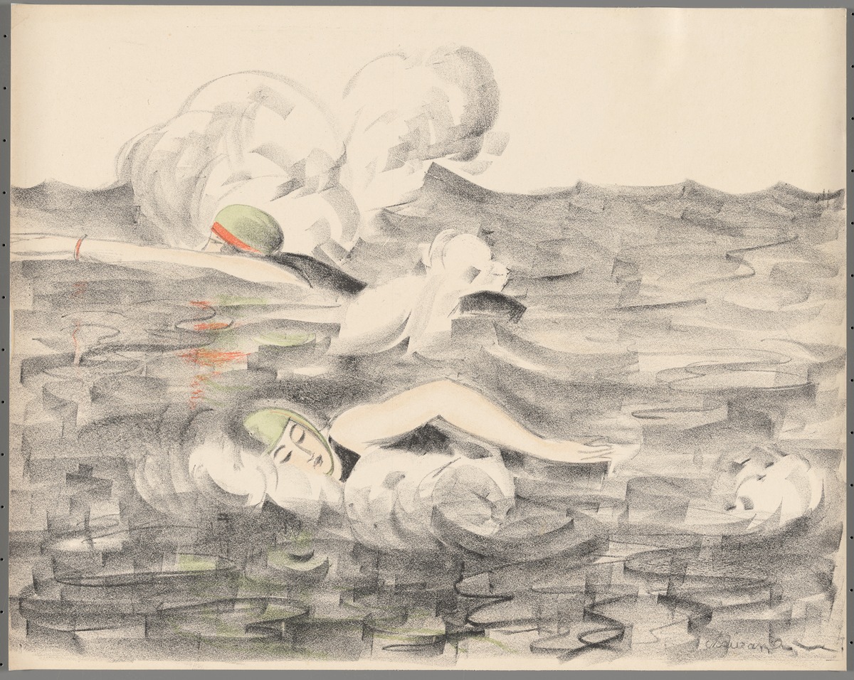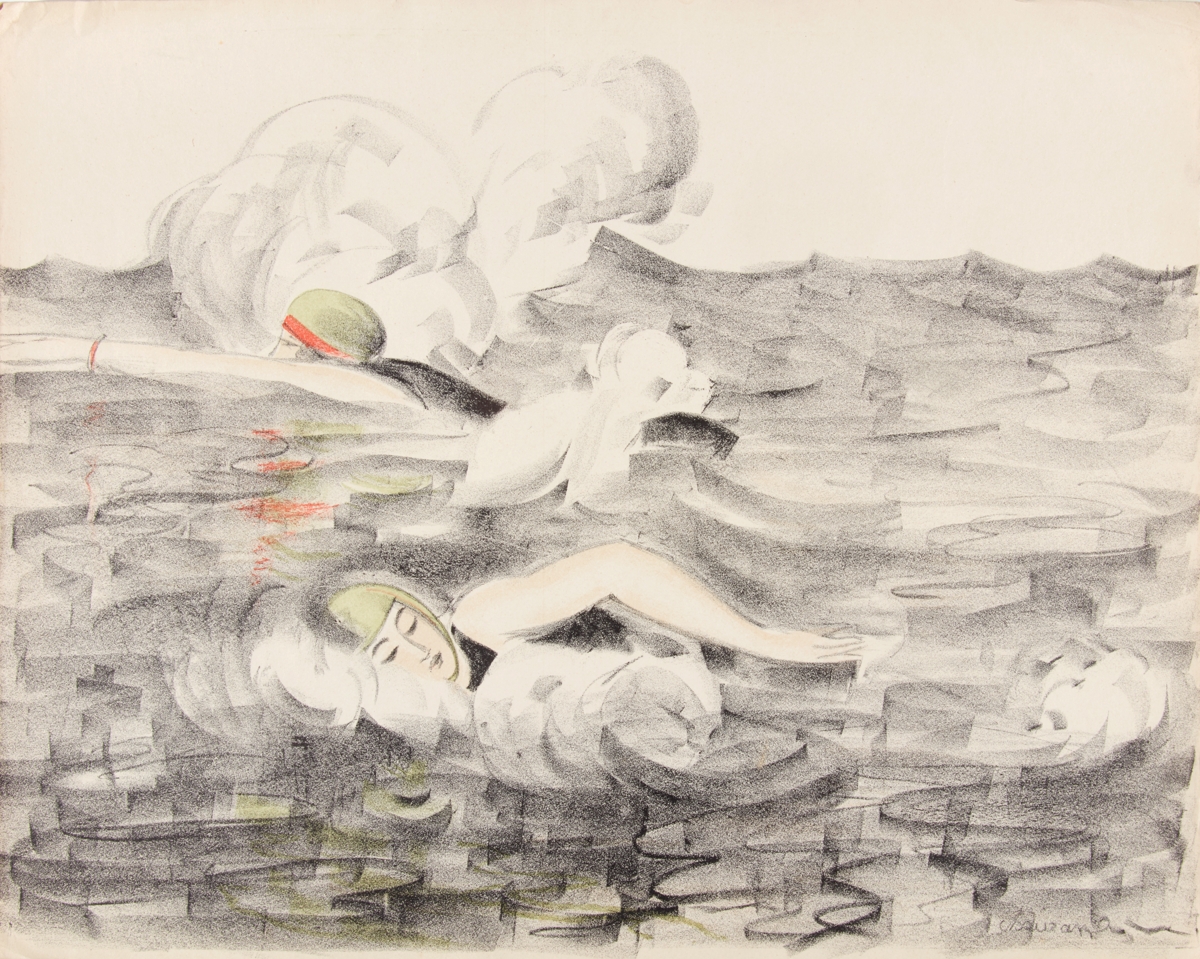 Two female swimmers in open water (?). Lithography. Signed: "Chaurand-Naurac" lower right.