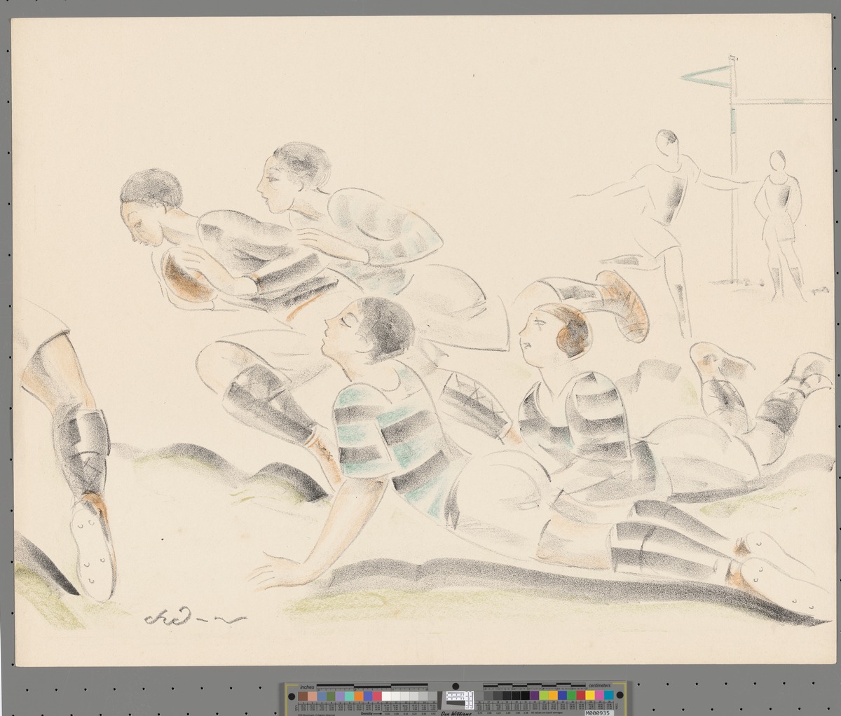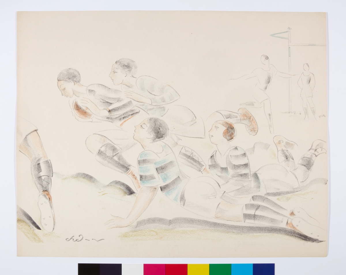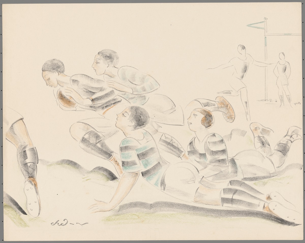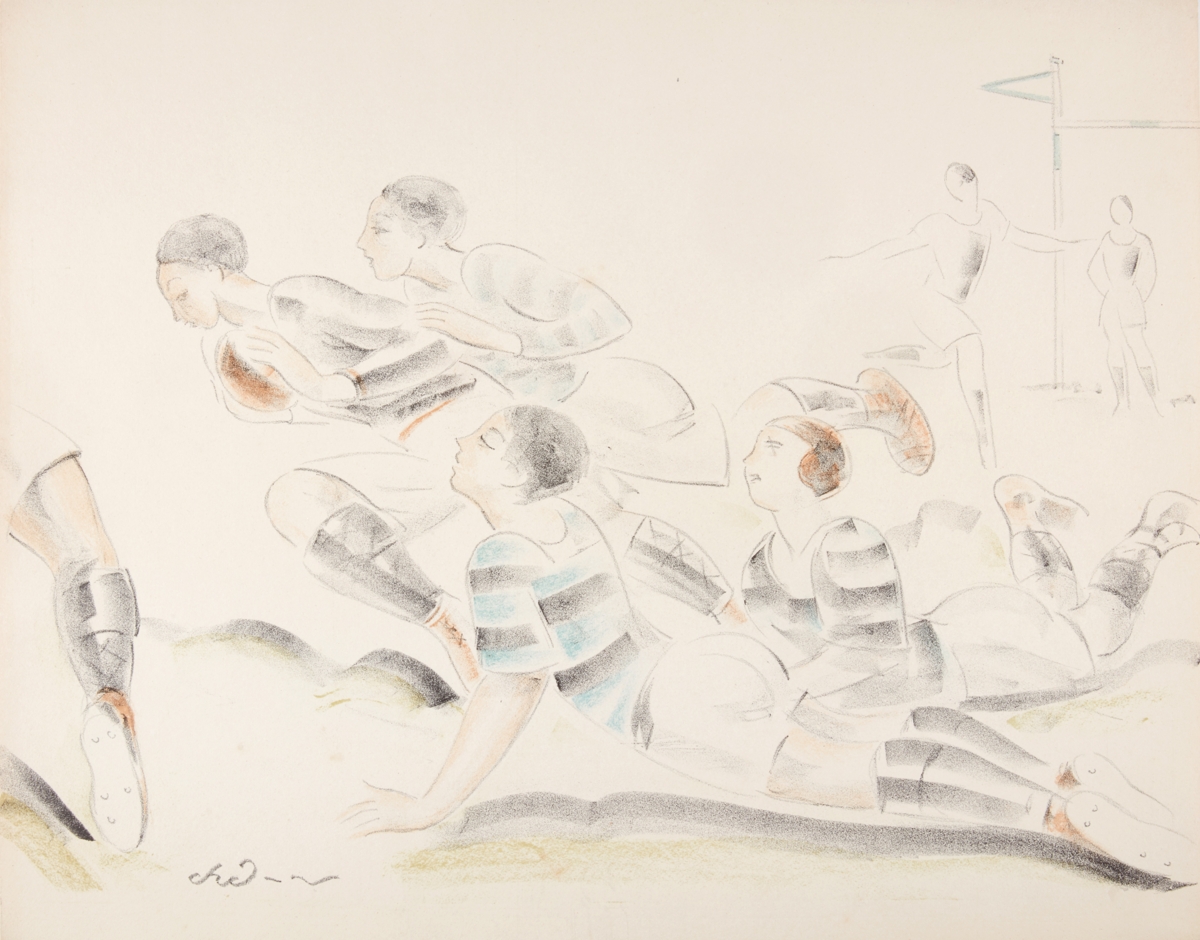 Players in the scrum. Lithography. Signed: "Chaurand-Naurac" lower right.