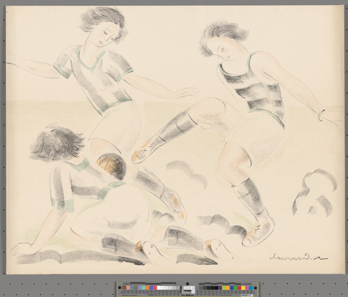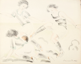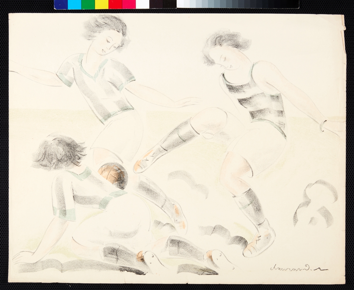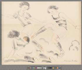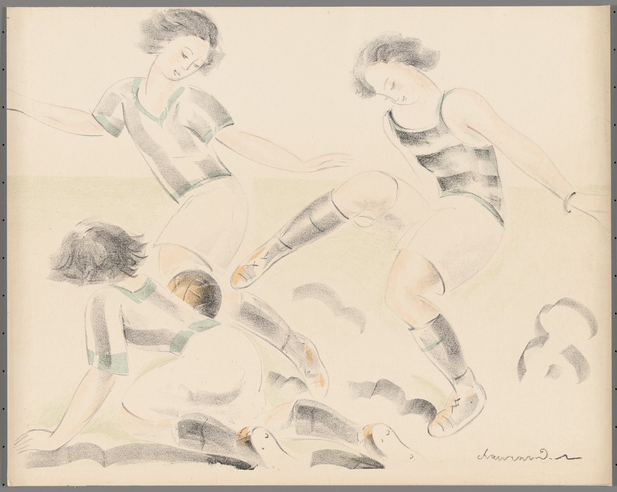 Three women fighting for the ball. Lithography. Signed: "Chaurand-Naurac" lower right.