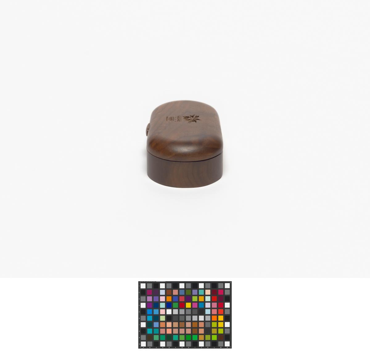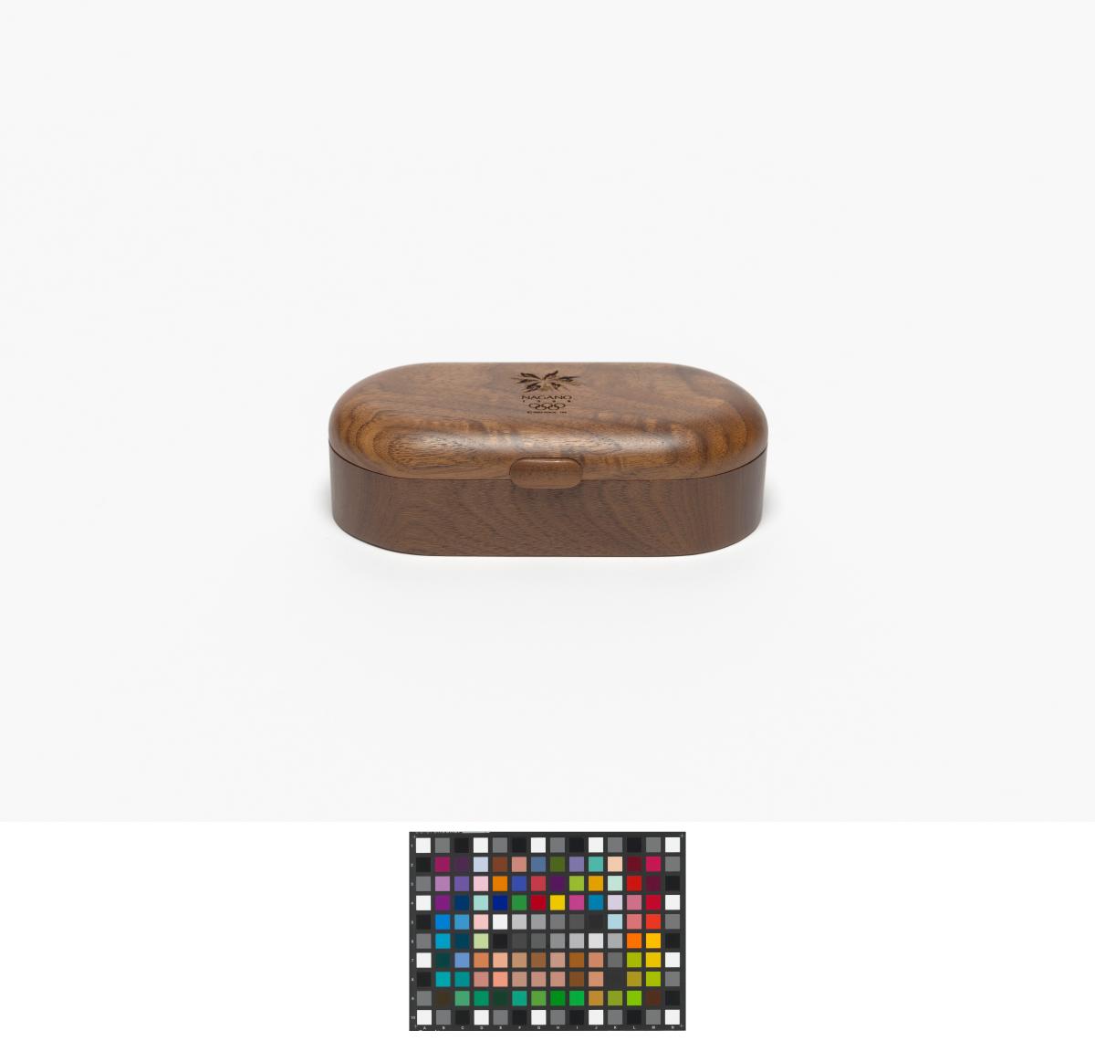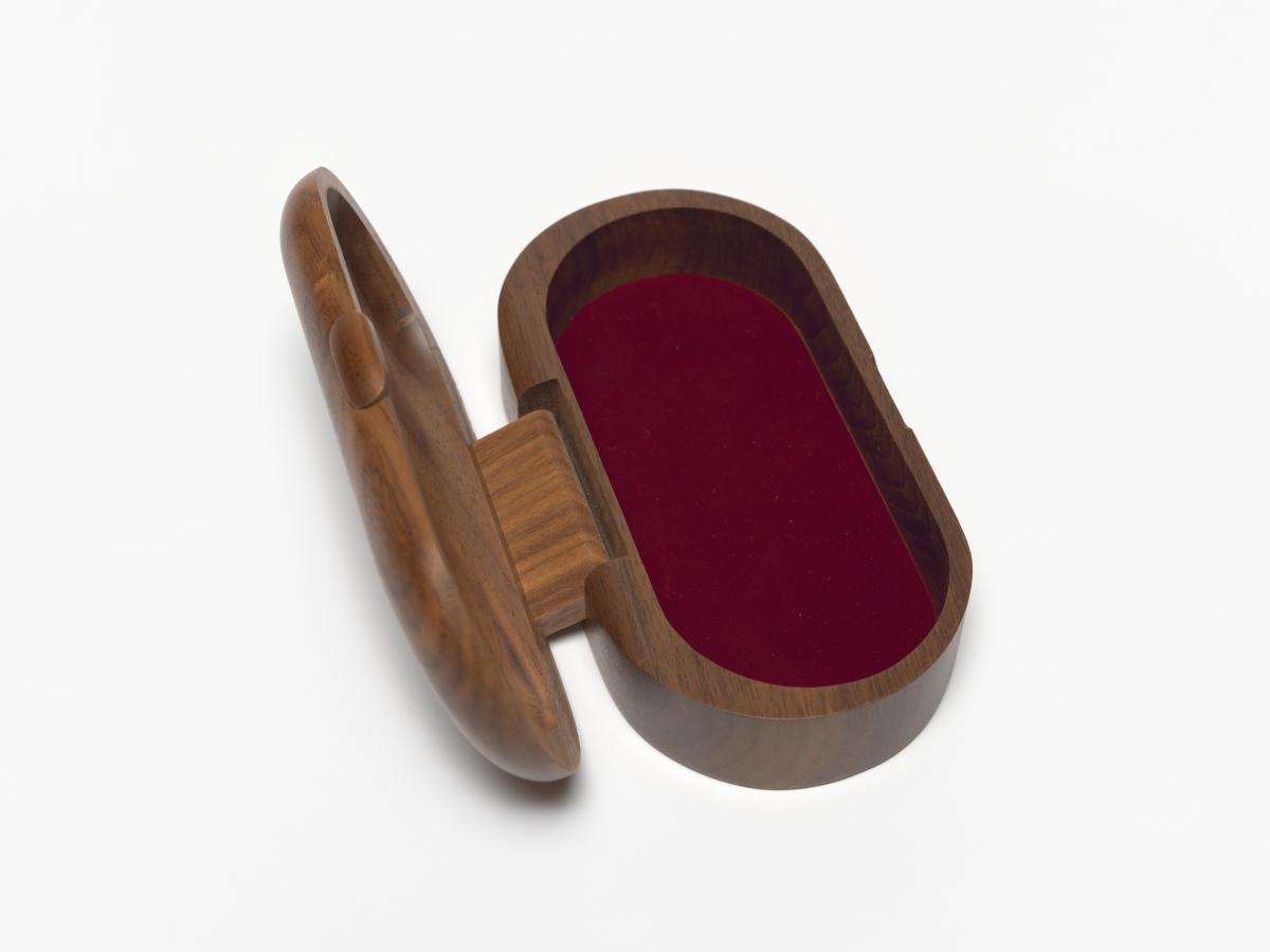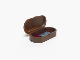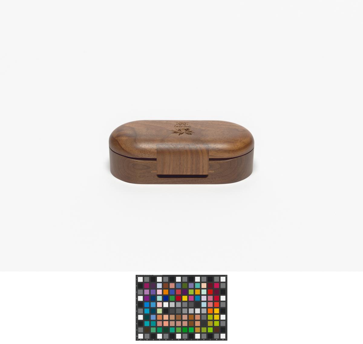 Ovale shaped box with the Games' emblem engraved in the wood on the lid.