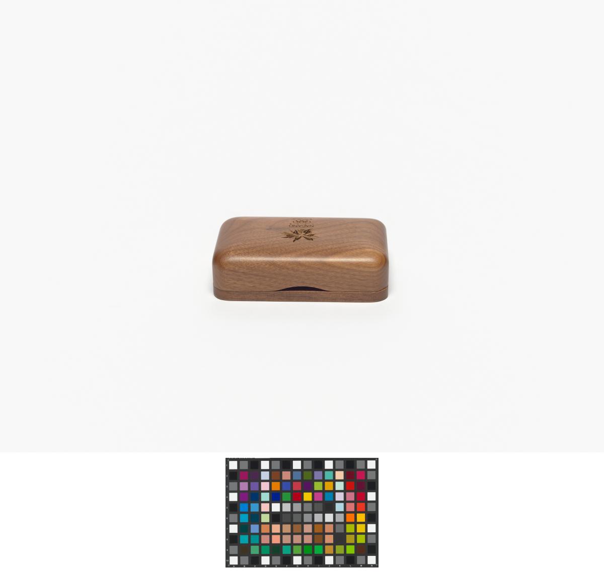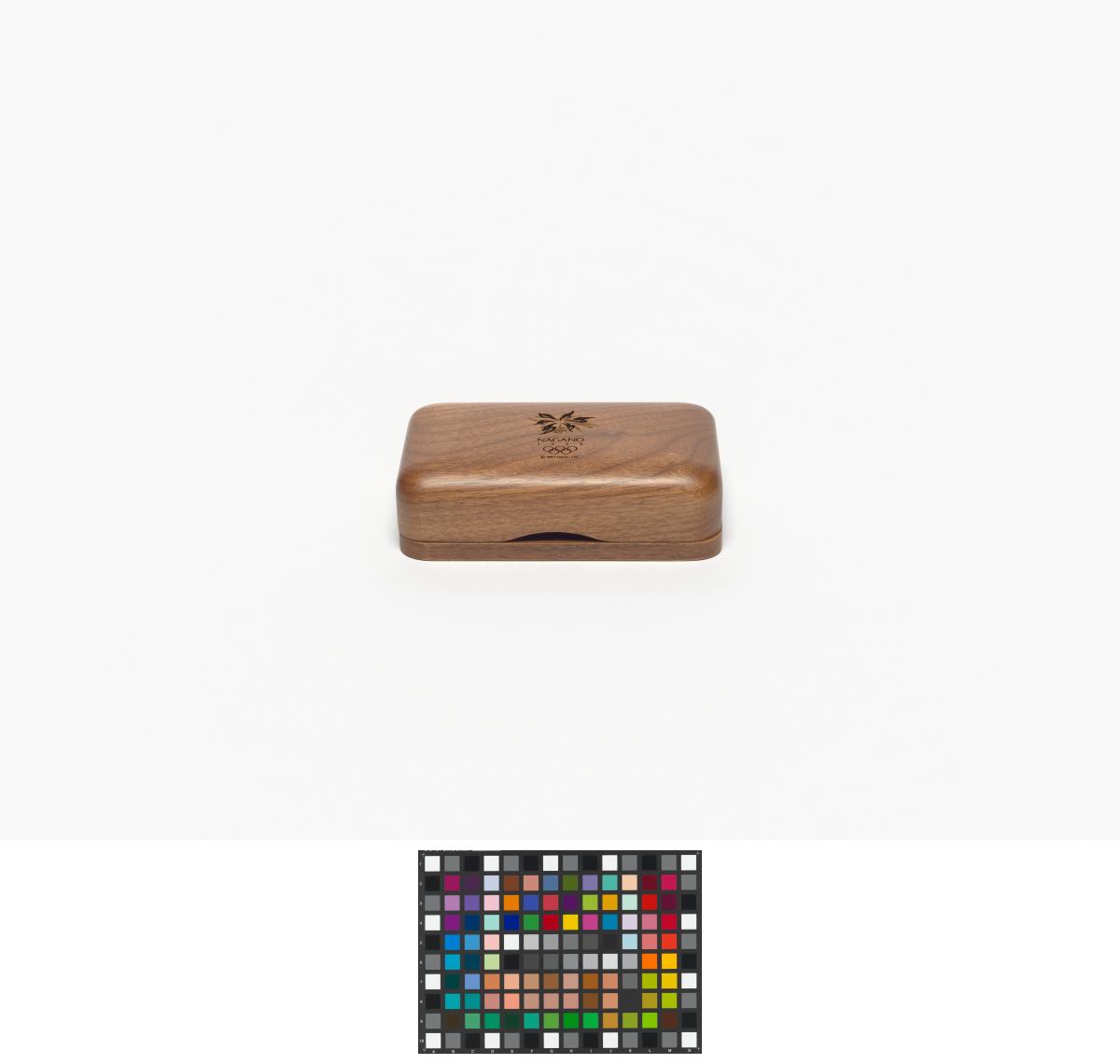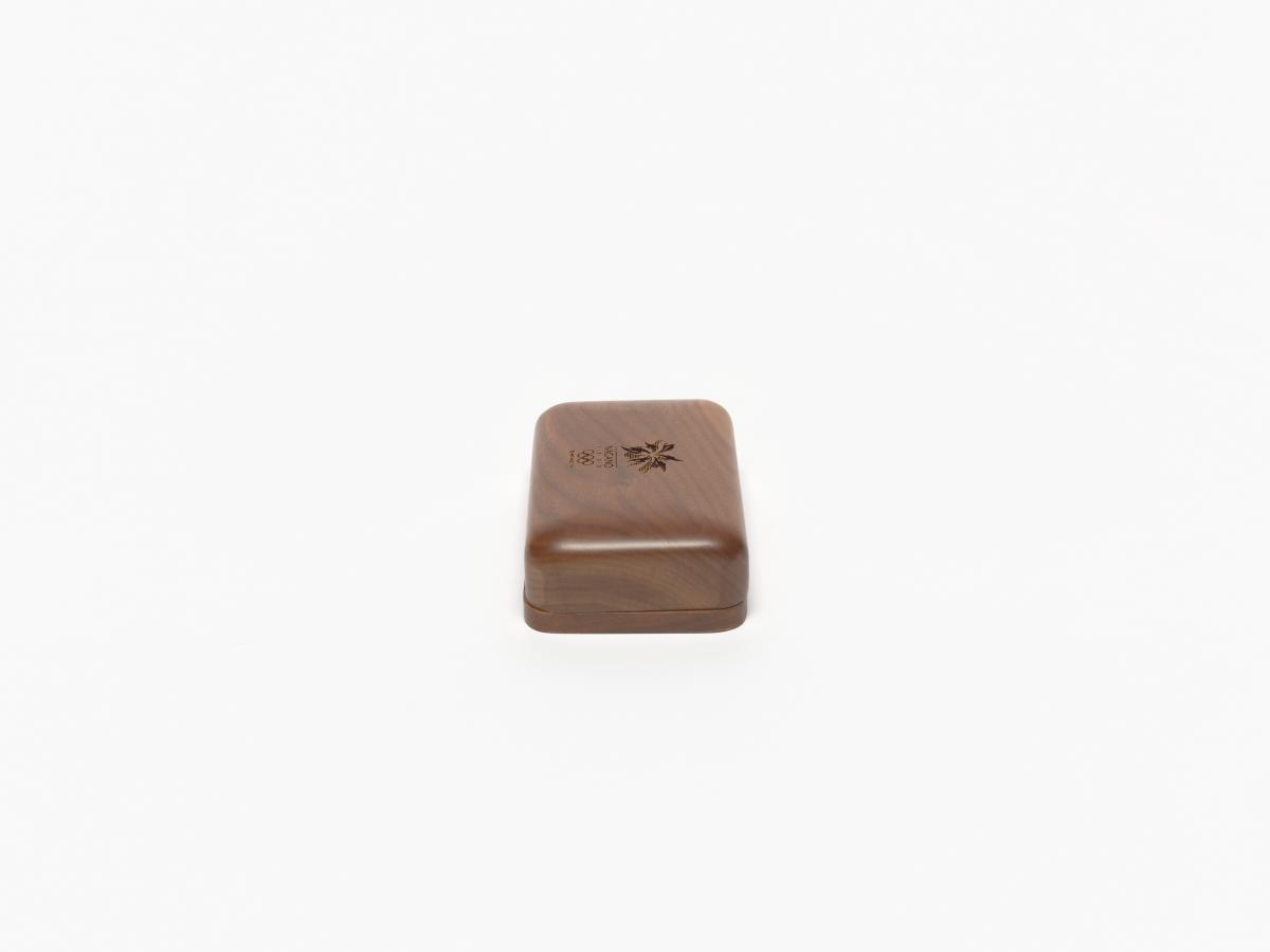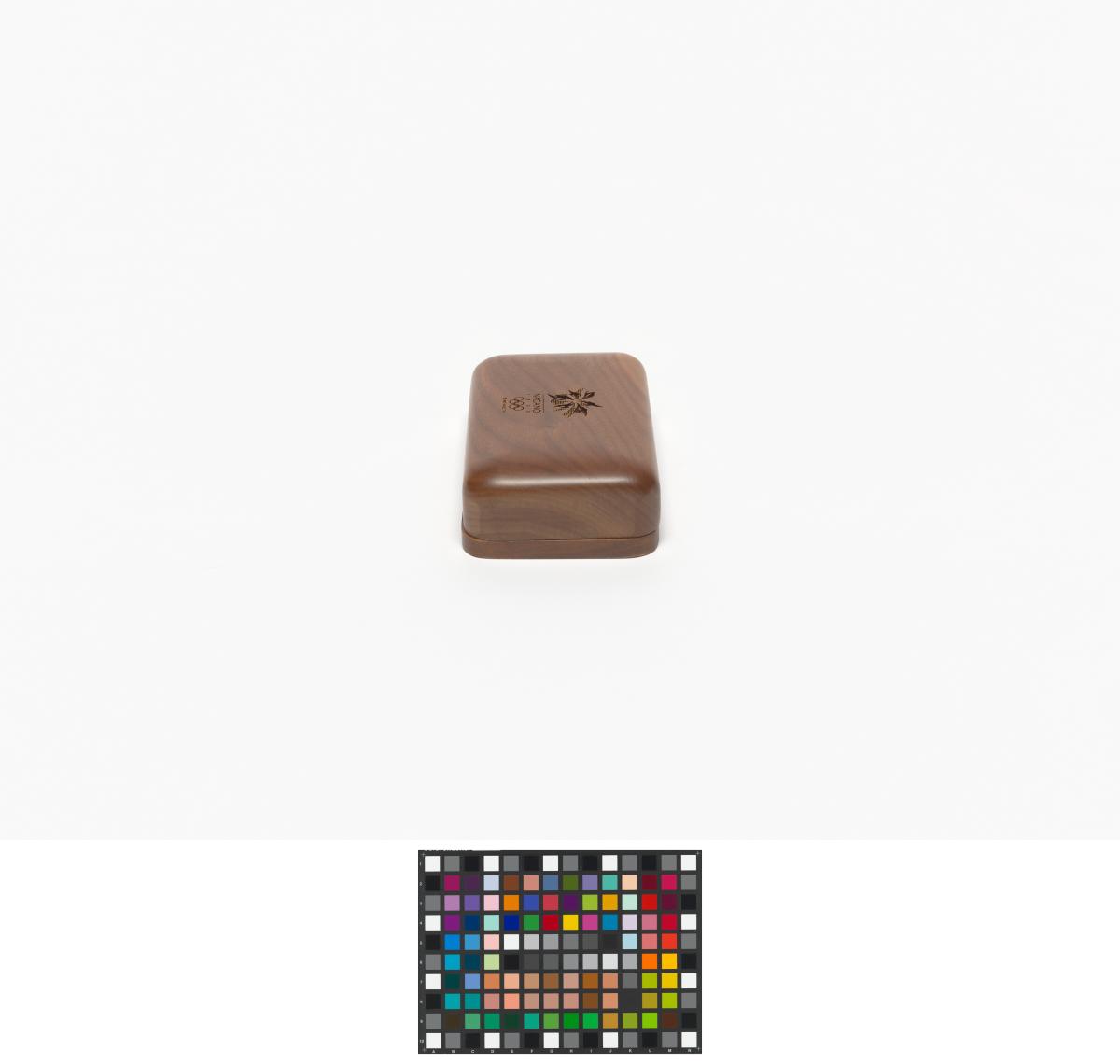 Box with rounded corners and the Games' emblem engraved in the wood on the lid.