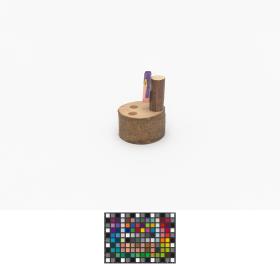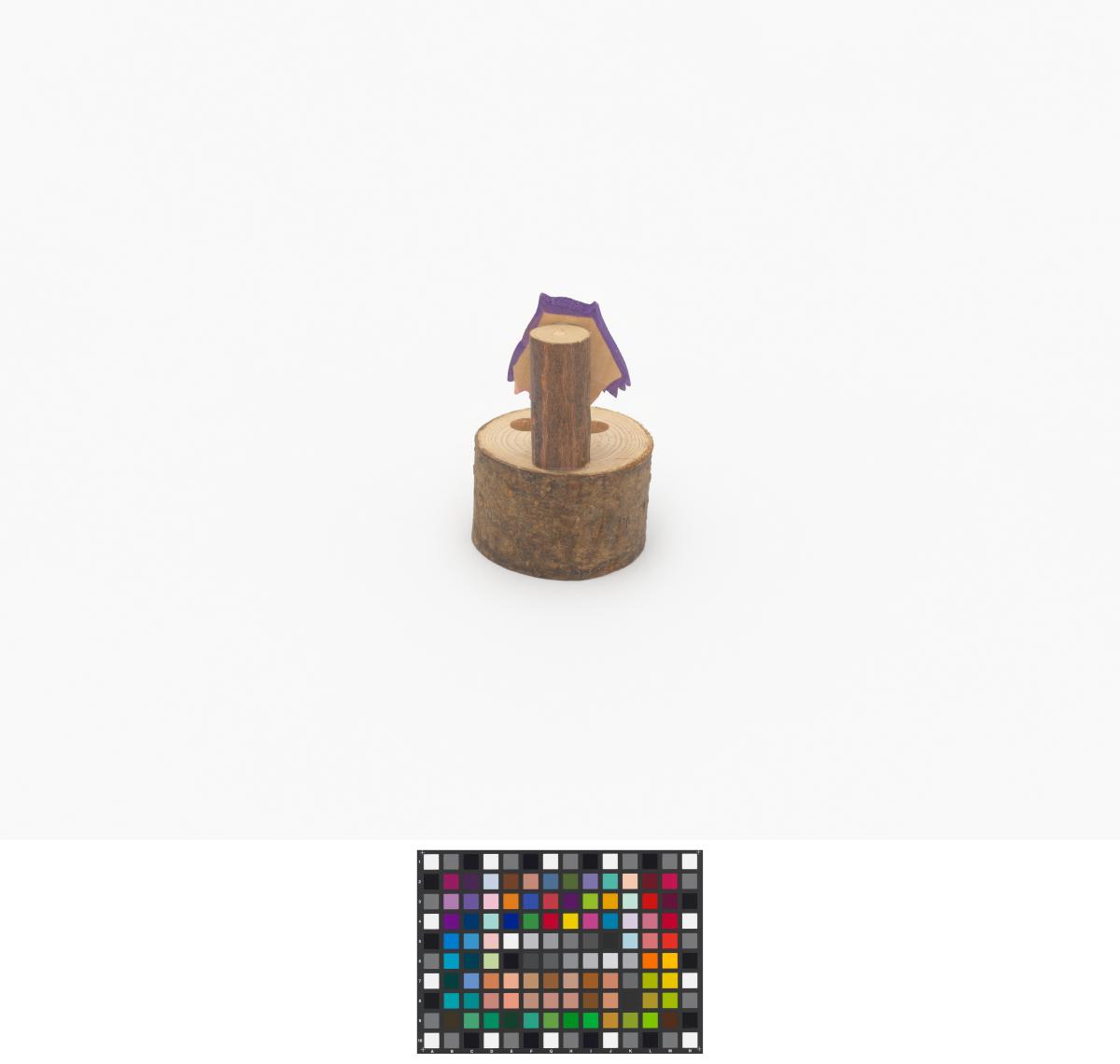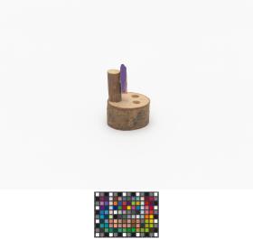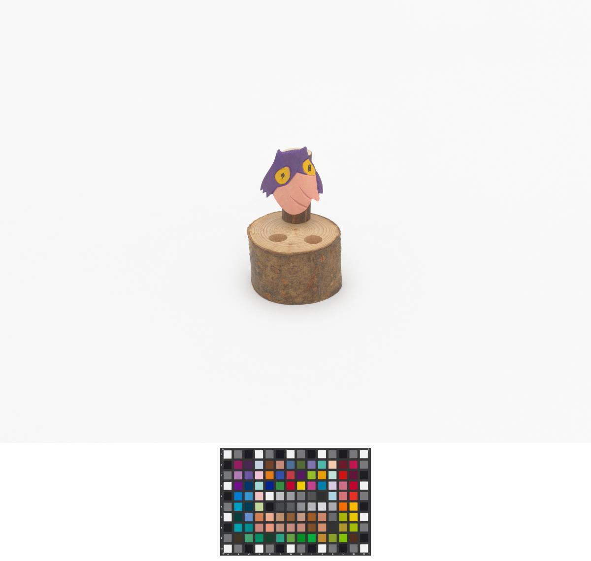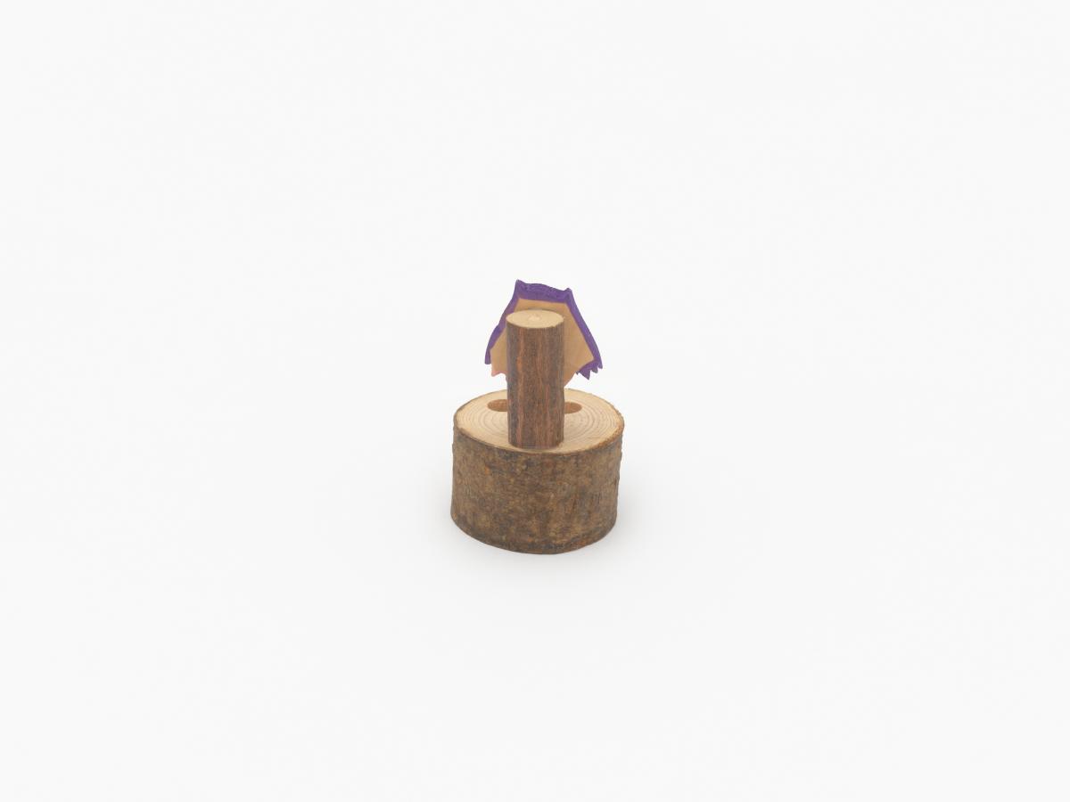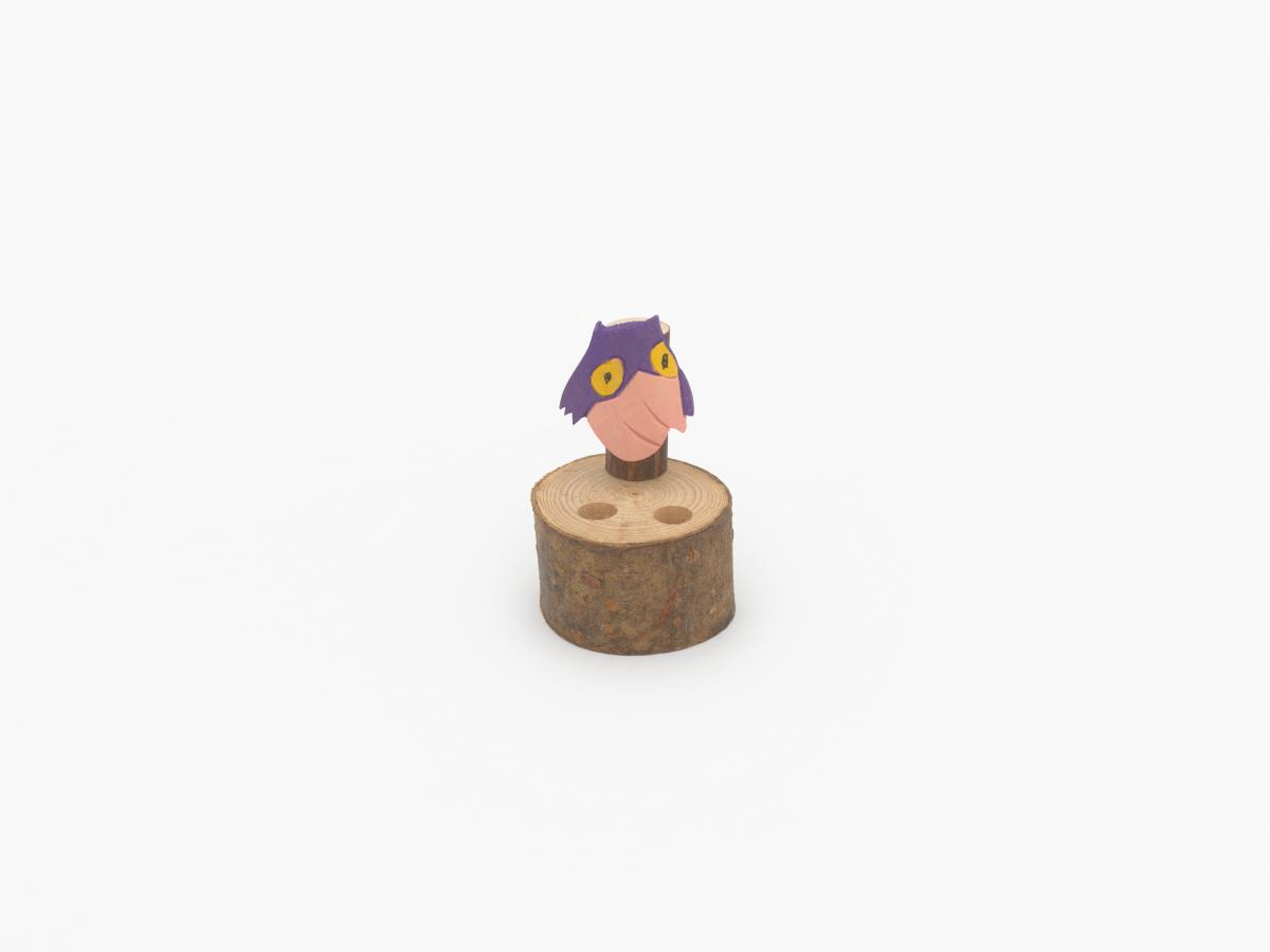 Piece of a tree trunk with Sukki and two holes for the pencils.
