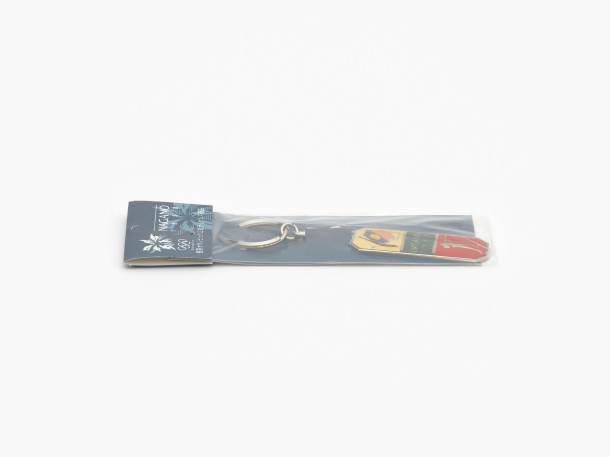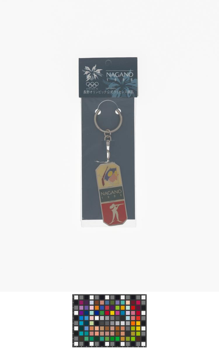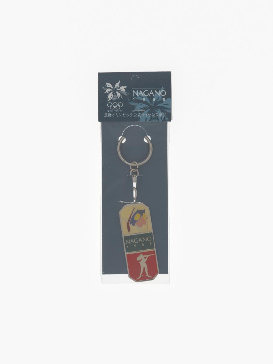 Nagano 1998, key ring with Sukki, one of the Games' mascots, doing biathlon and the biathlon pictogram.