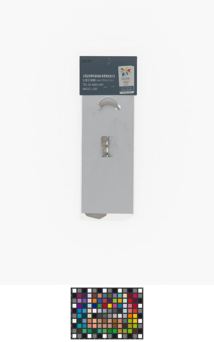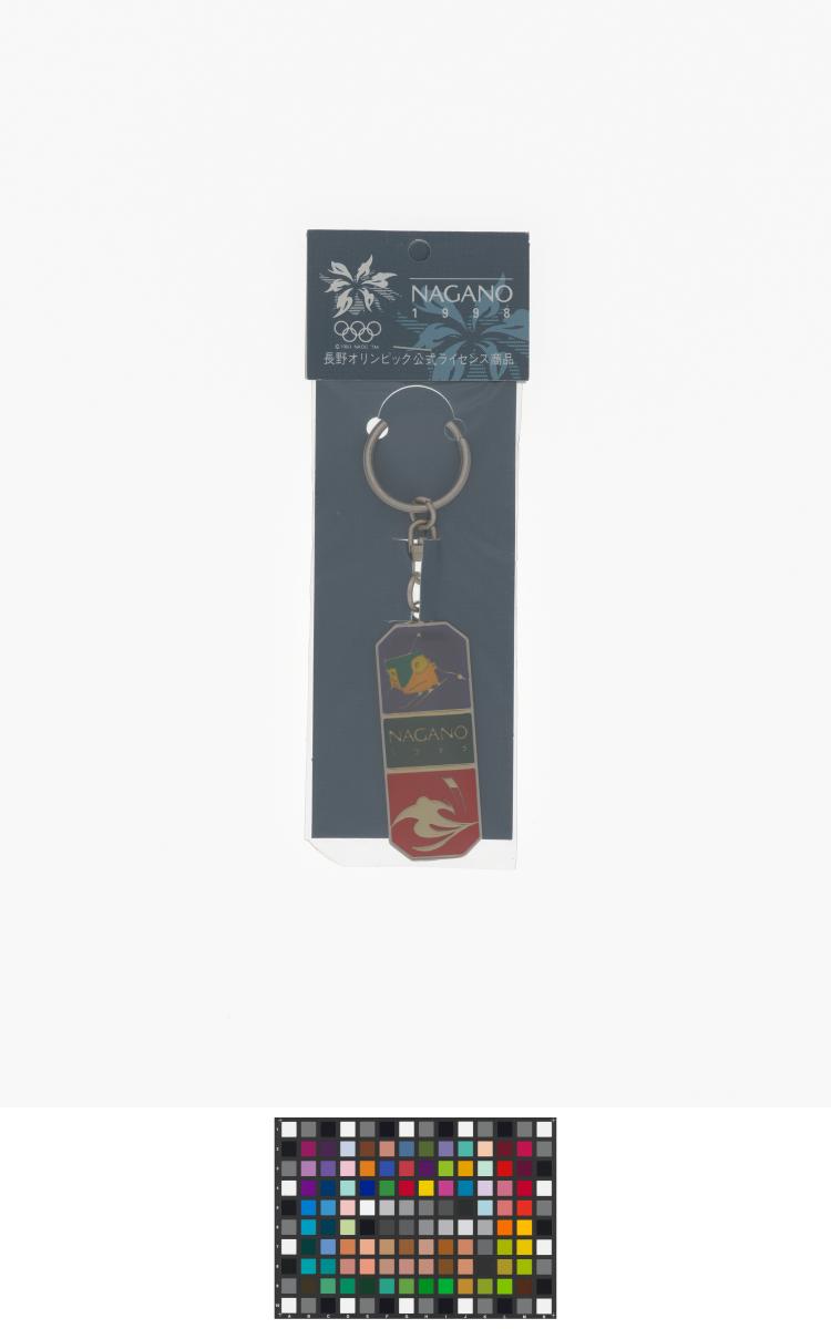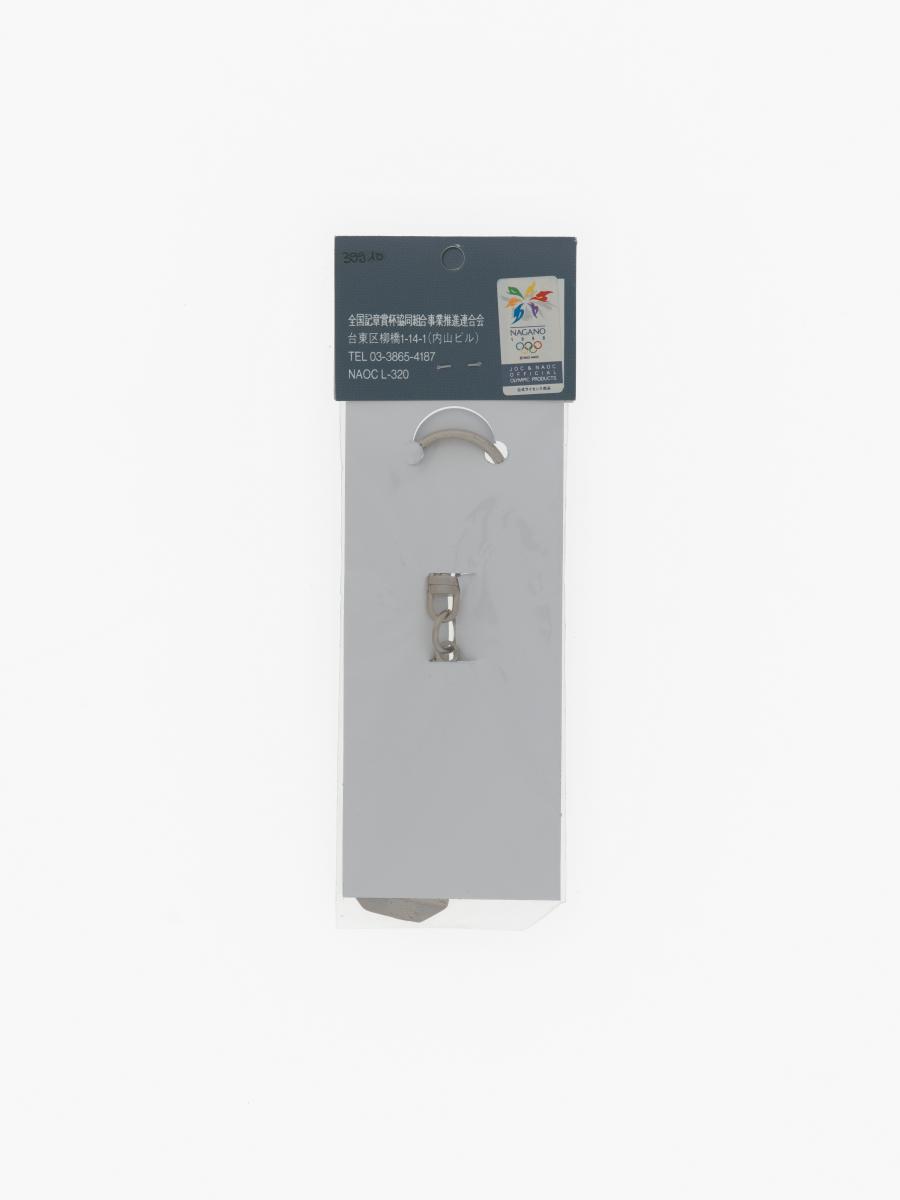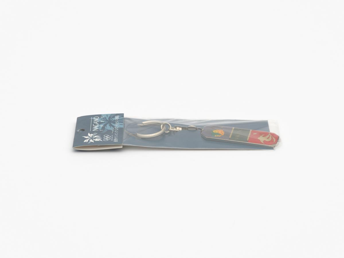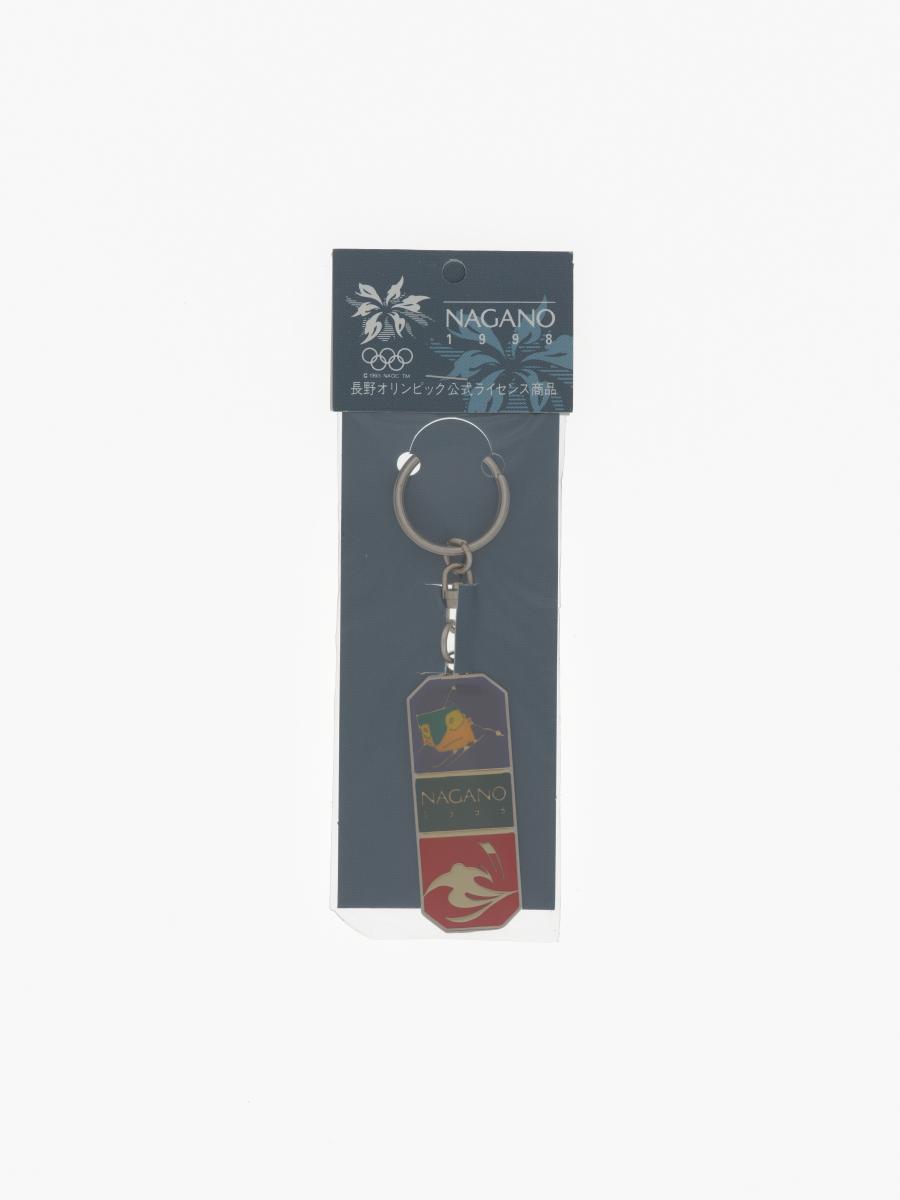 Nagano 1998, key ring with Nokki, one of the Games' mascots, doing slalom and the slalom pictogram.