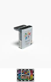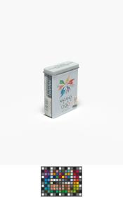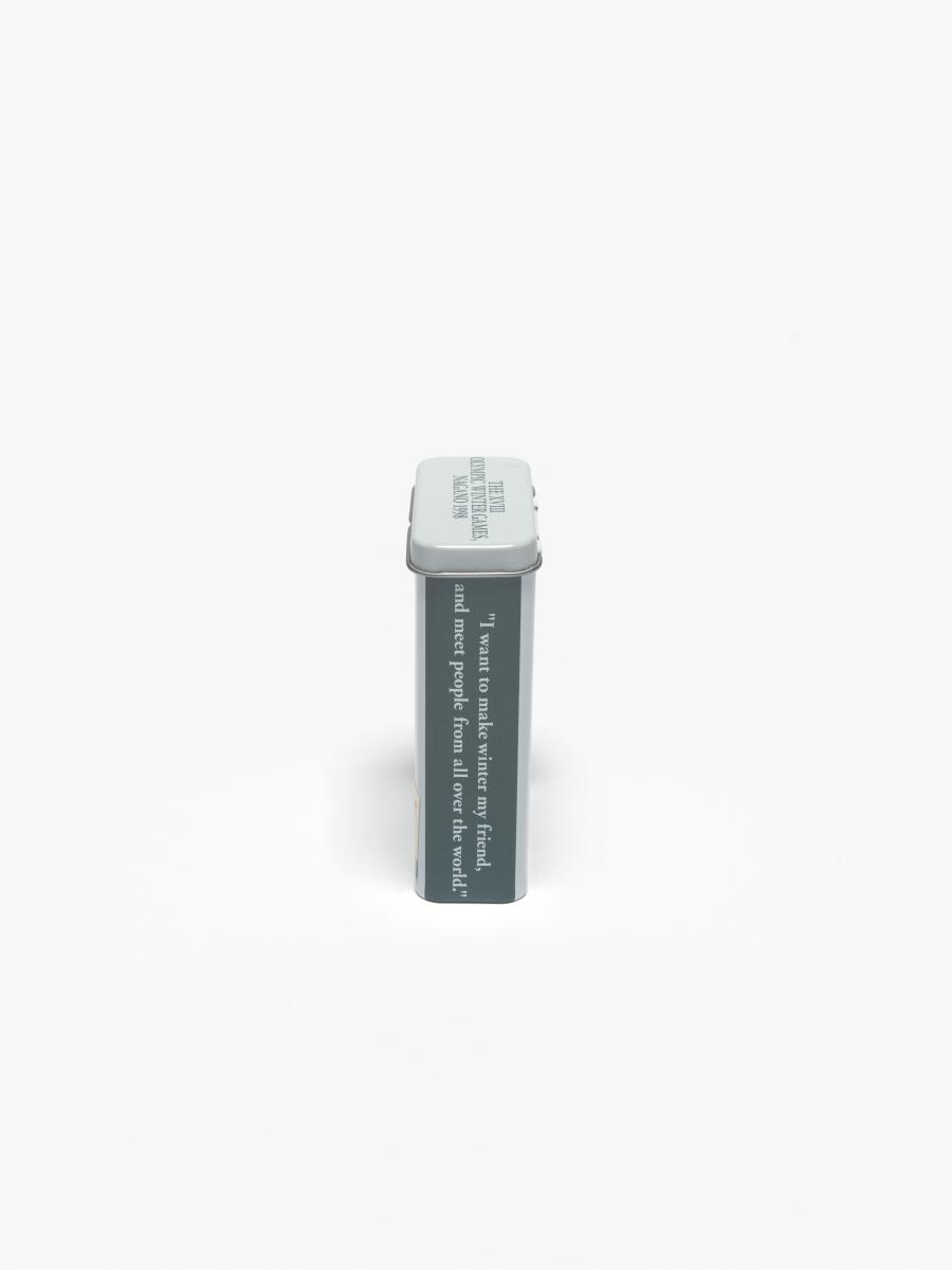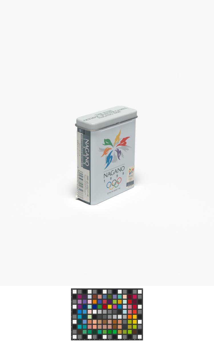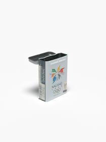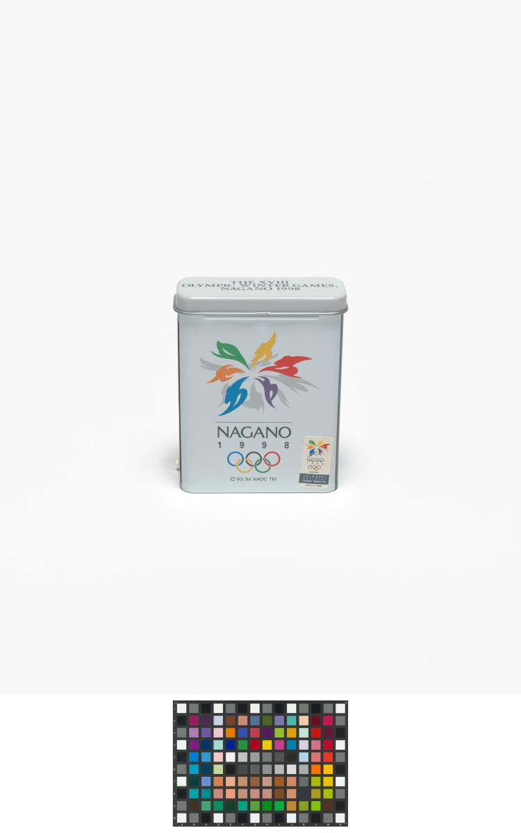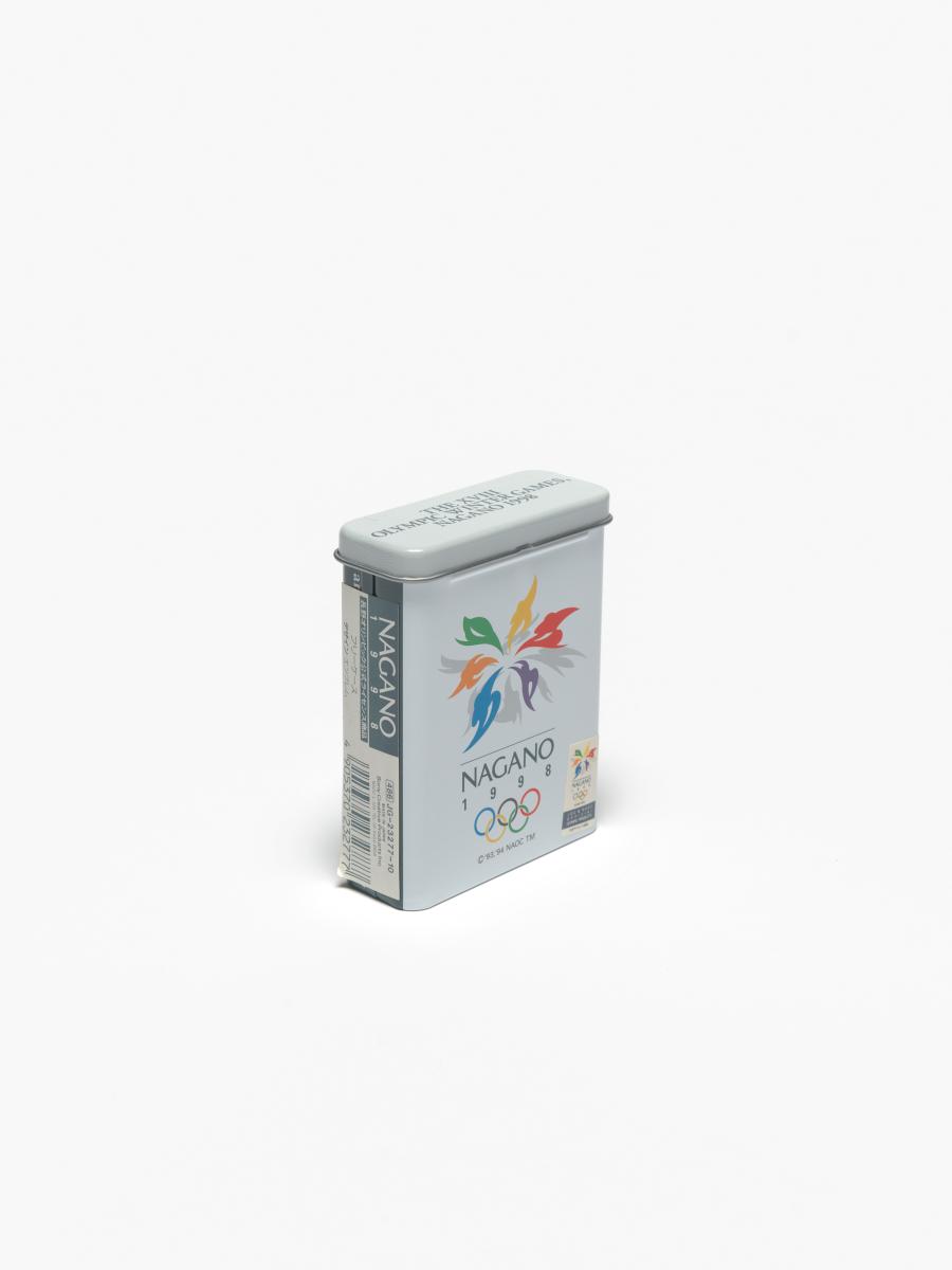 The Games' emblem on one side and the sports pictograms on the other. Caption on the lid: "The XVIII Olympic Winter Games Nagano 1998", caption on the both sides: "I want to make winter my friend ; and meet people from all over the world".