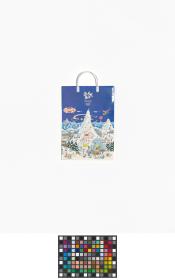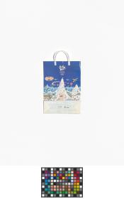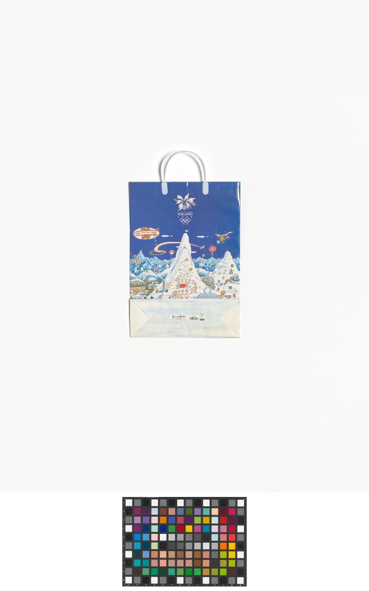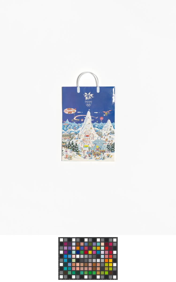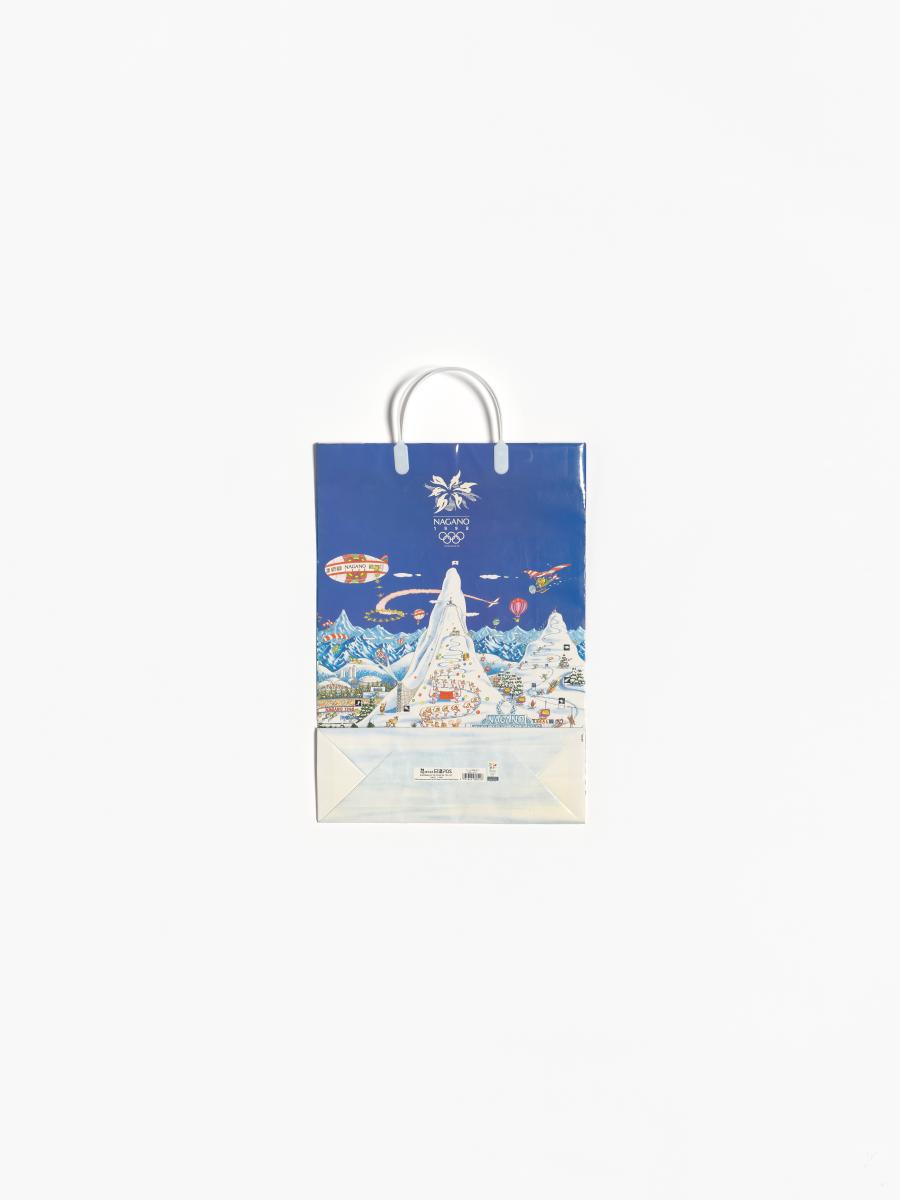 Nagano 1998, plastified paper bag with a humorous illustration of the Games and the Games' emblem.