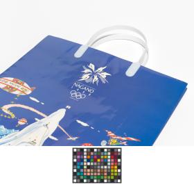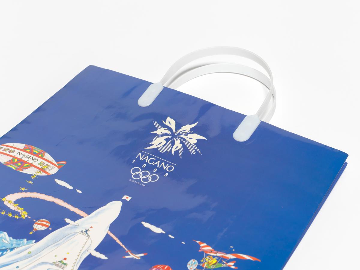 Plastic handles. Humorous drawing of the Nagano Olympic venue on the whole bag.