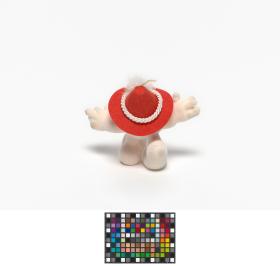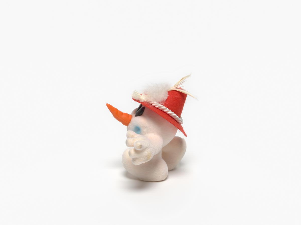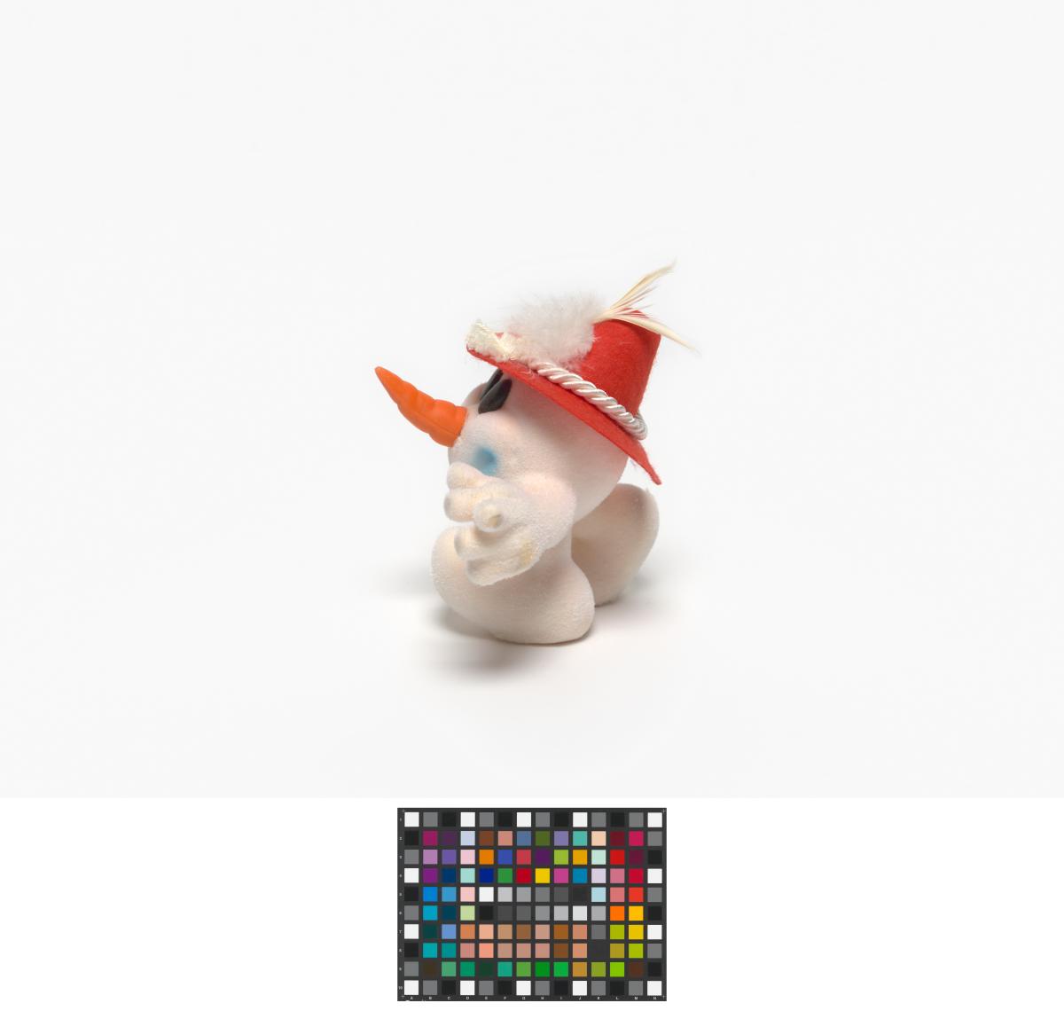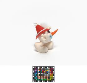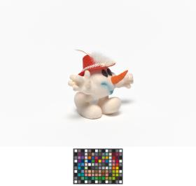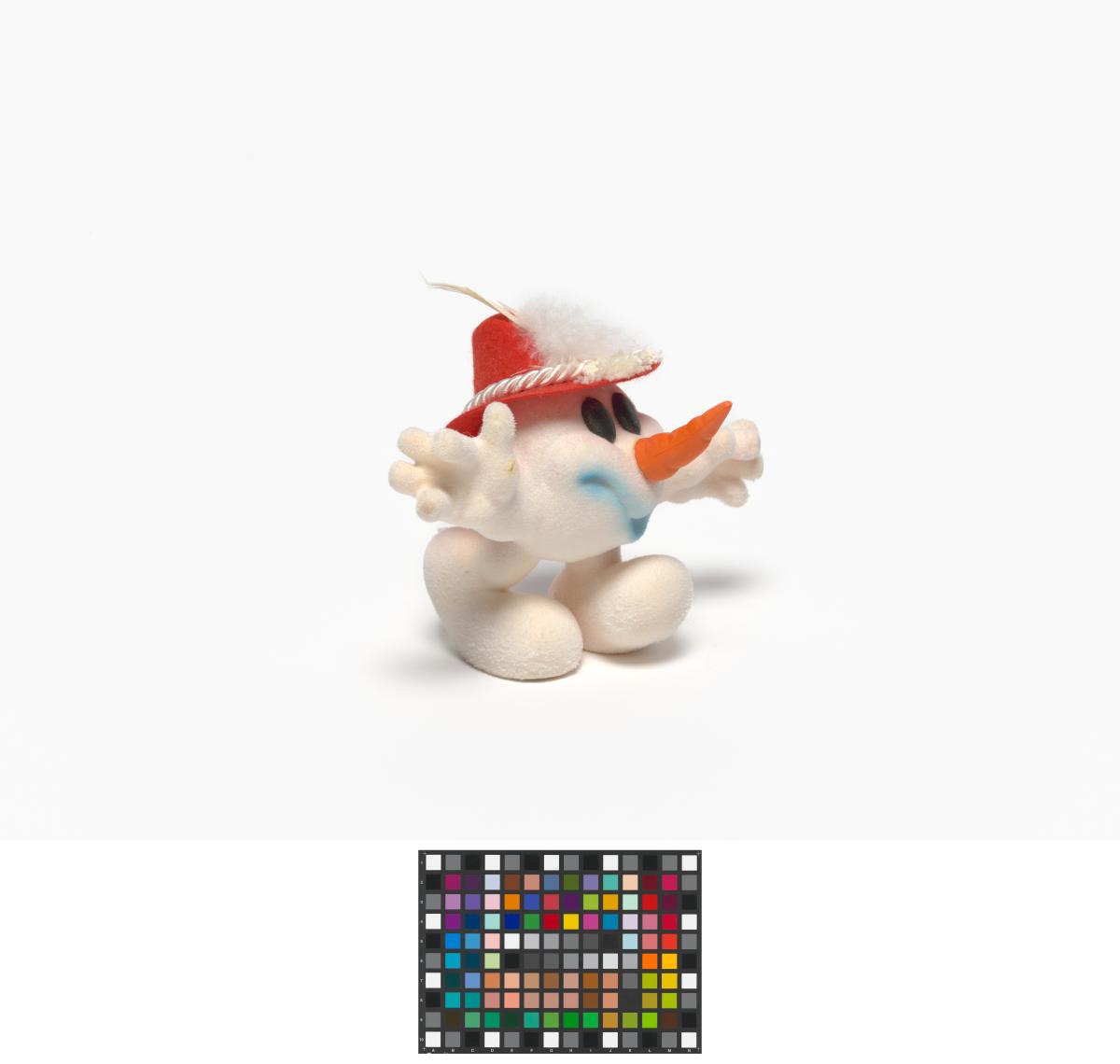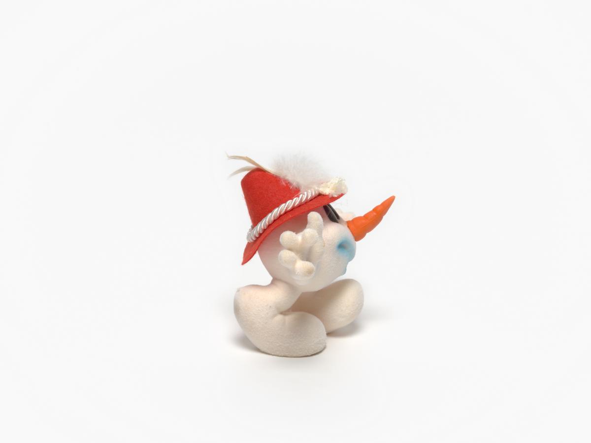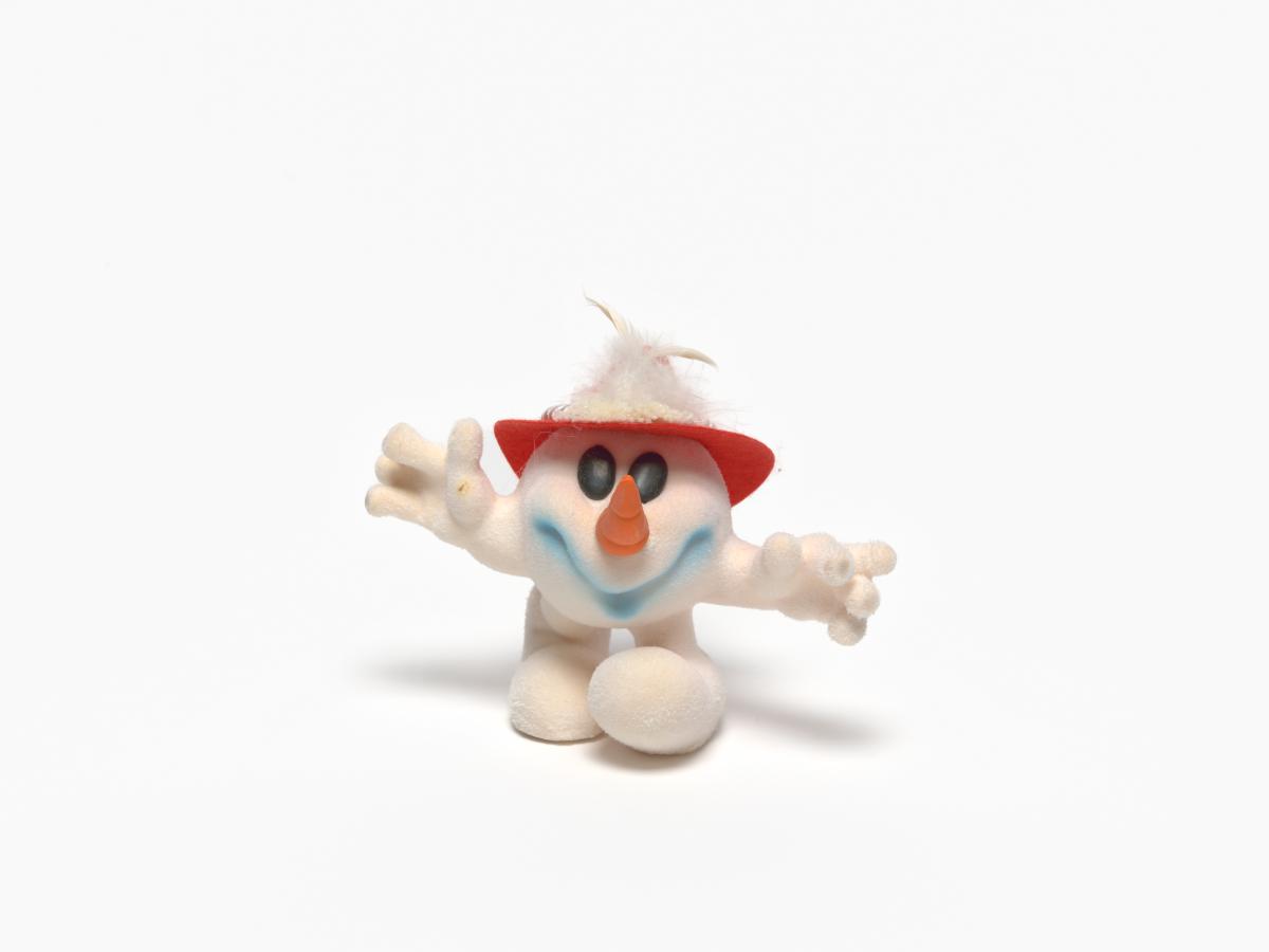 Snowman shape mascot wearing a Tyrolien hat with two white feathers.
