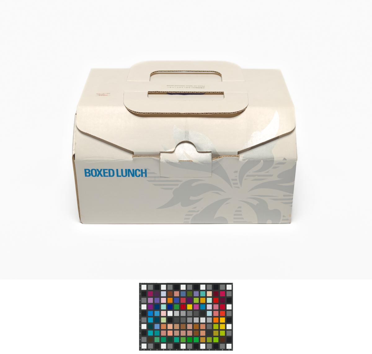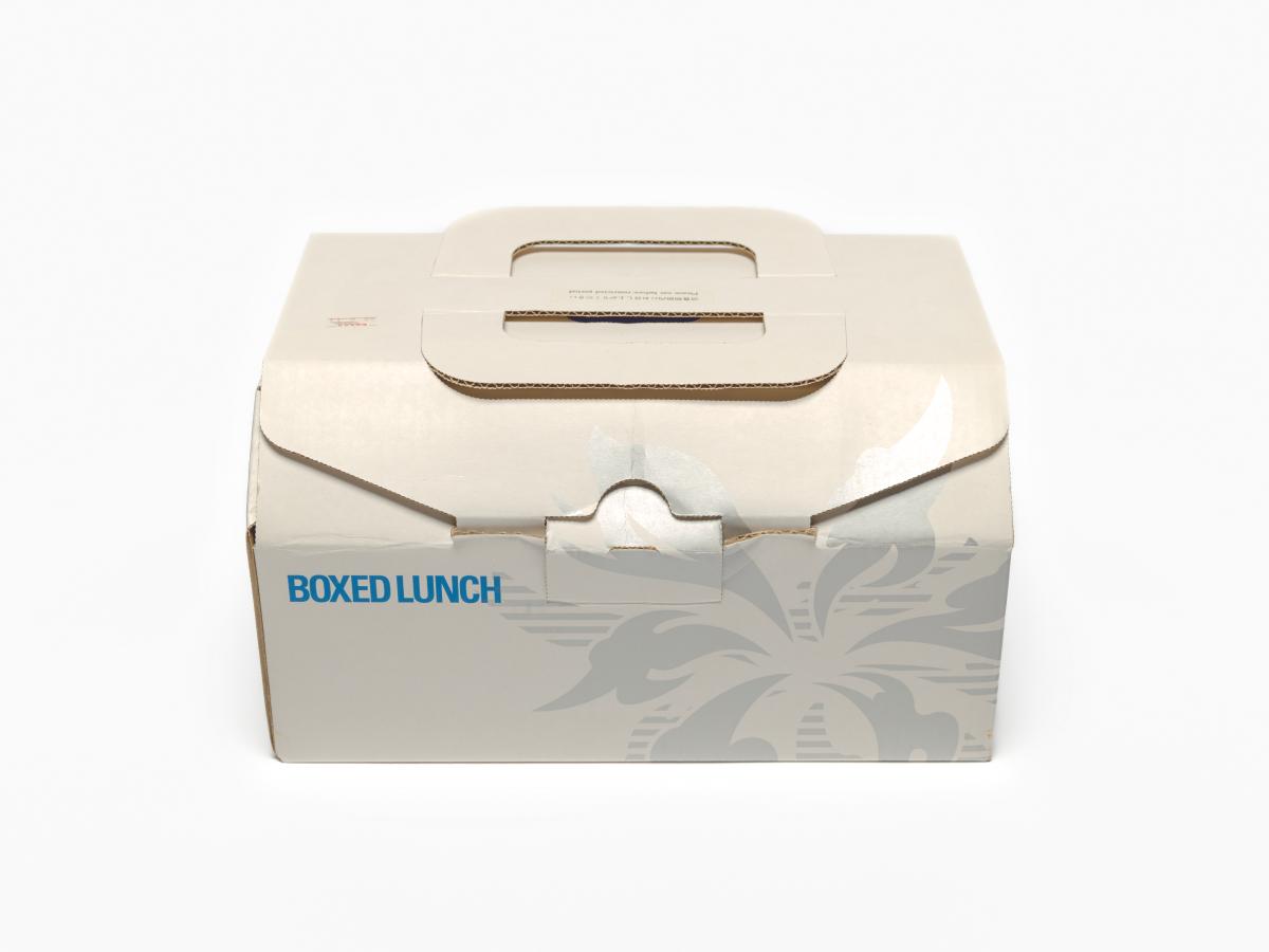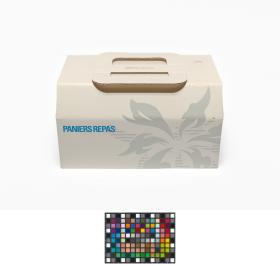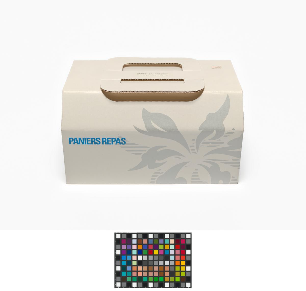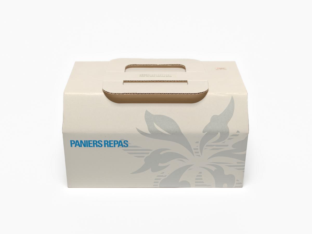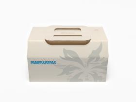 Cardboard box with two handles to carry a lunch. Drawing of the Games' emblem and caption: "panier repas".