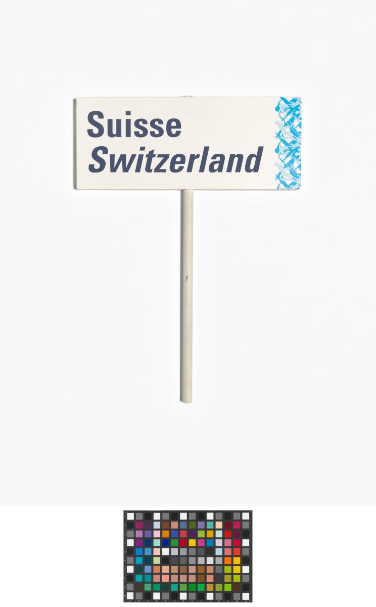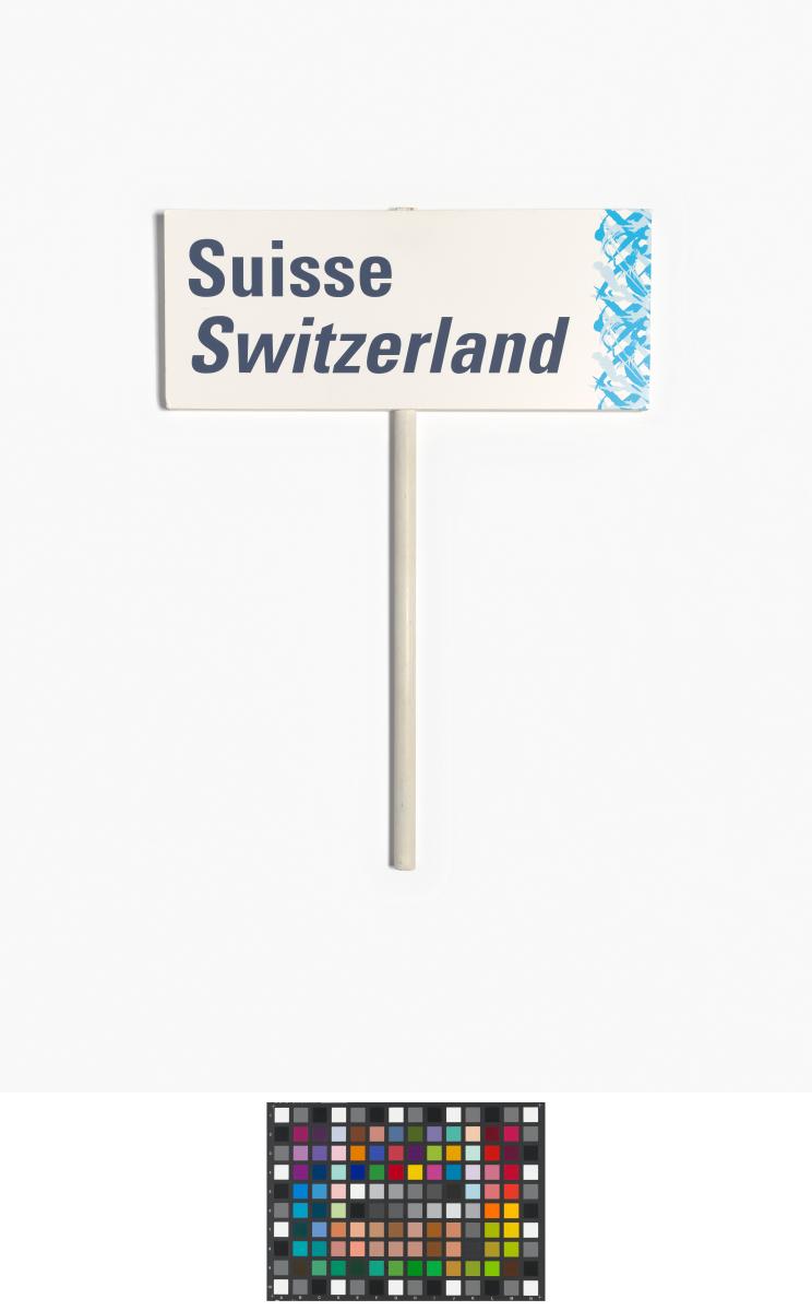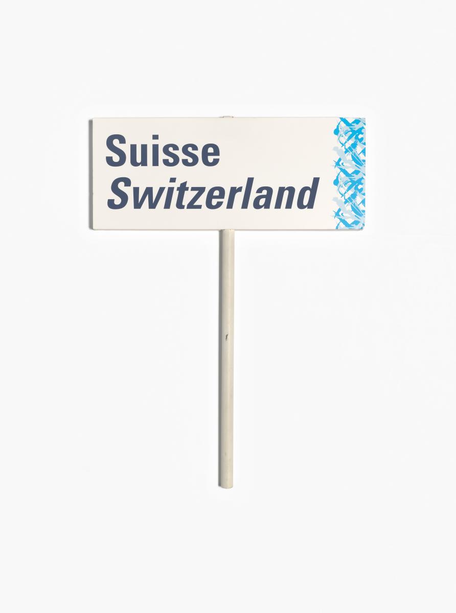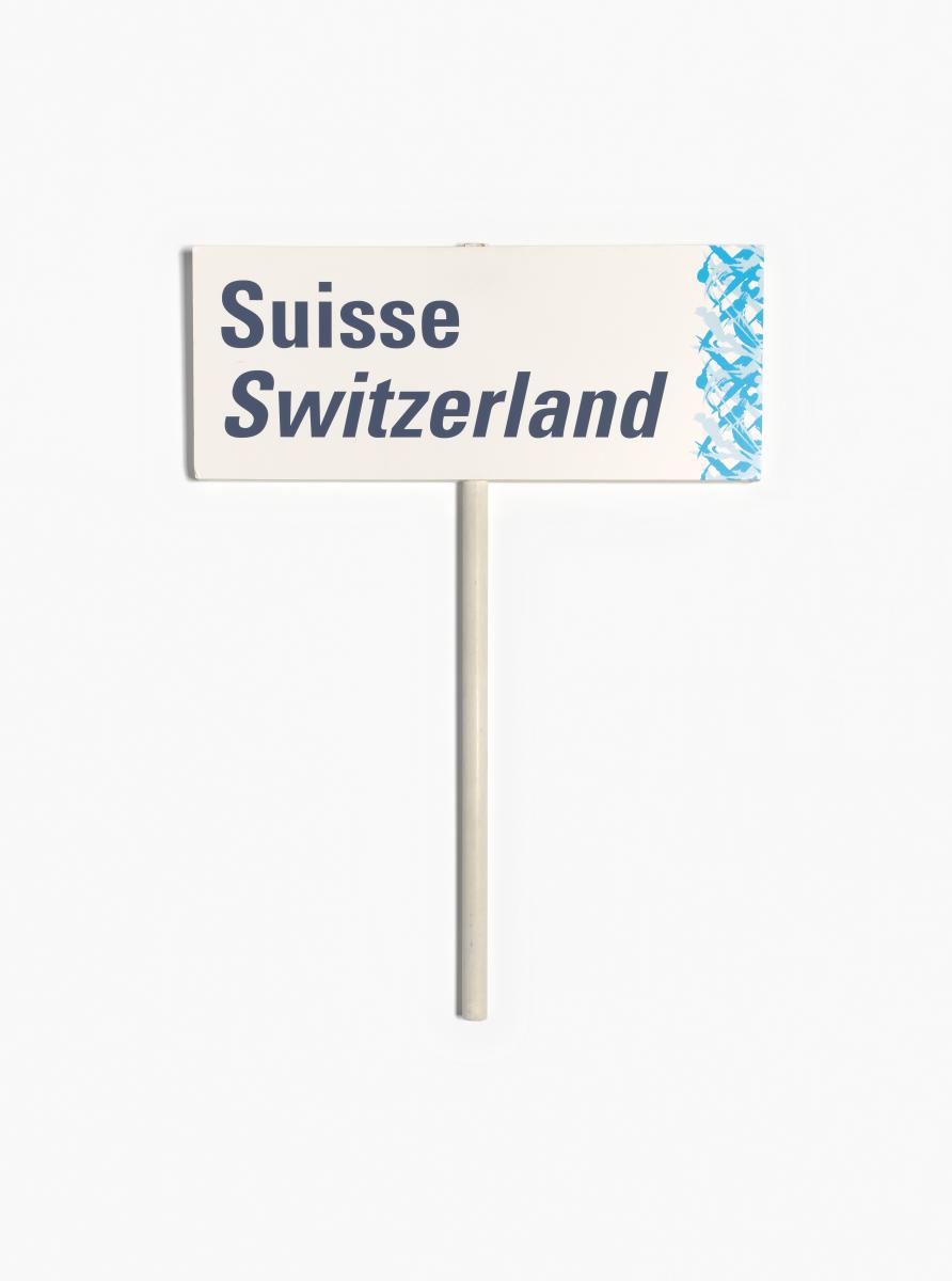 Rectangular sign with a long handle in the middle. Caption in English and French: "Suisse ; Switzerland". Look of the Games on the right side.