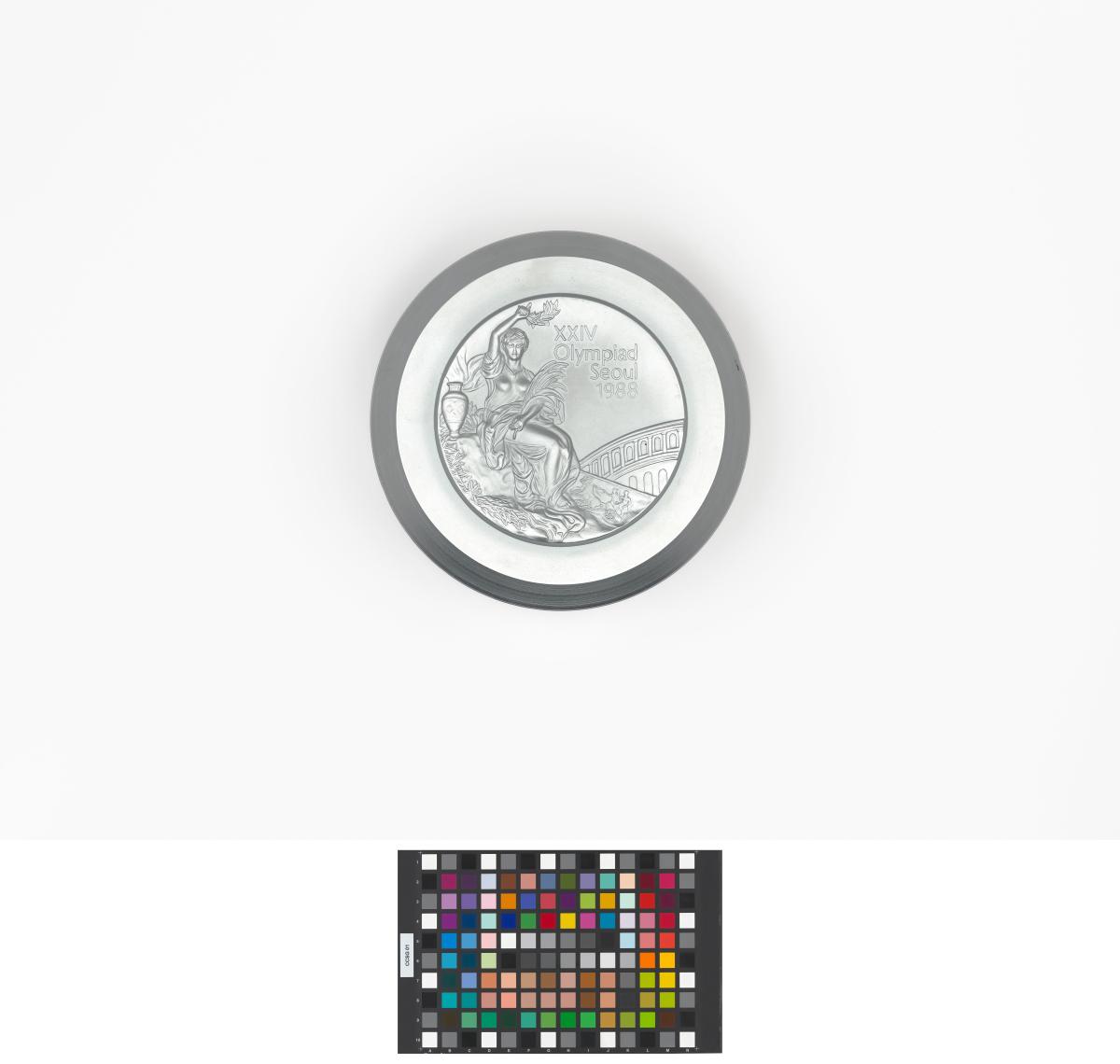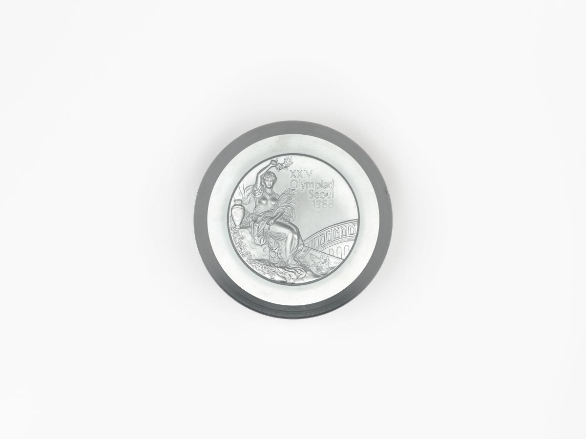 Winner's medal obverse: victory goddess seated and holding a laurel wreath, caption: "XXIV / Olympiad / Seoul / 1988".
