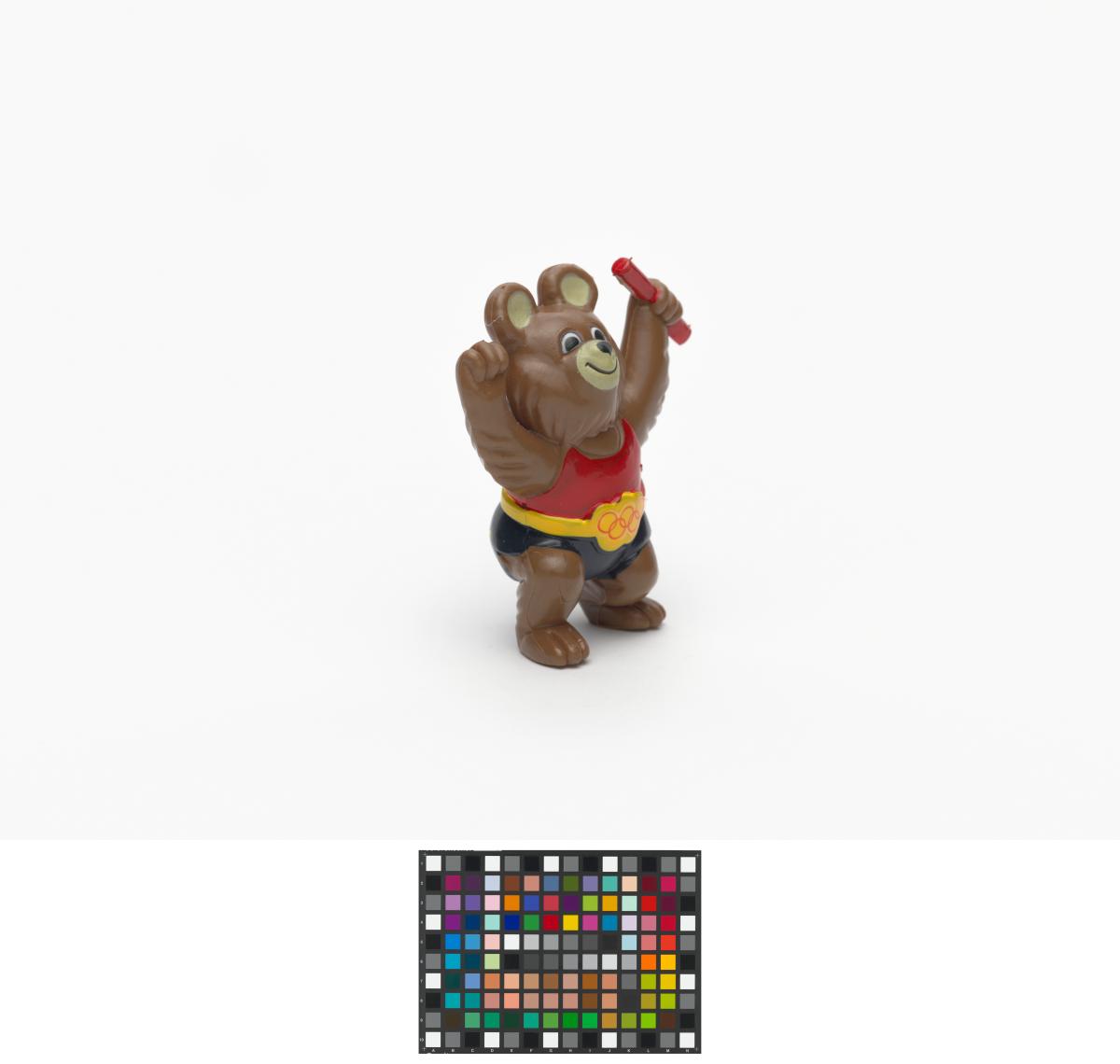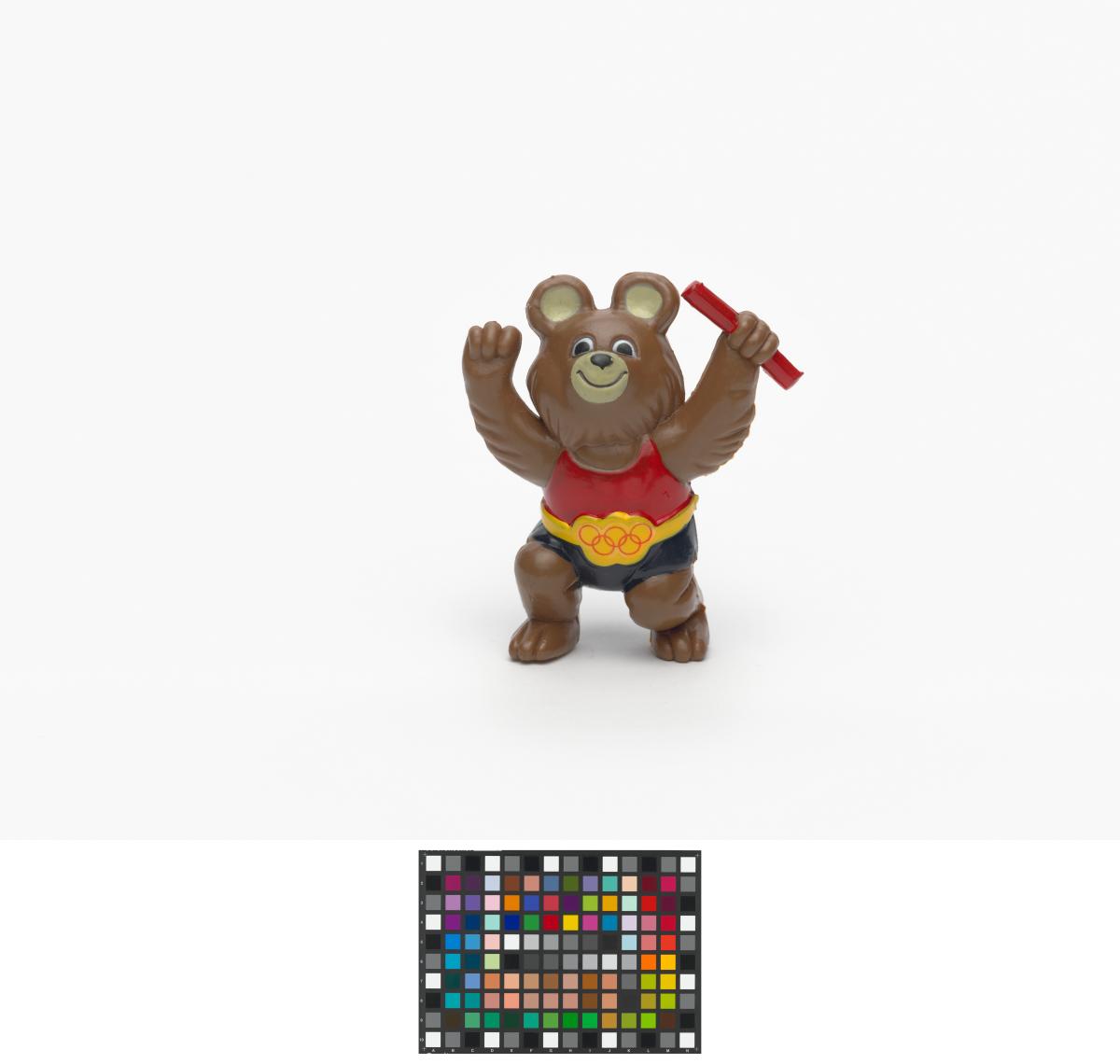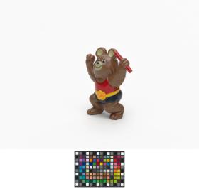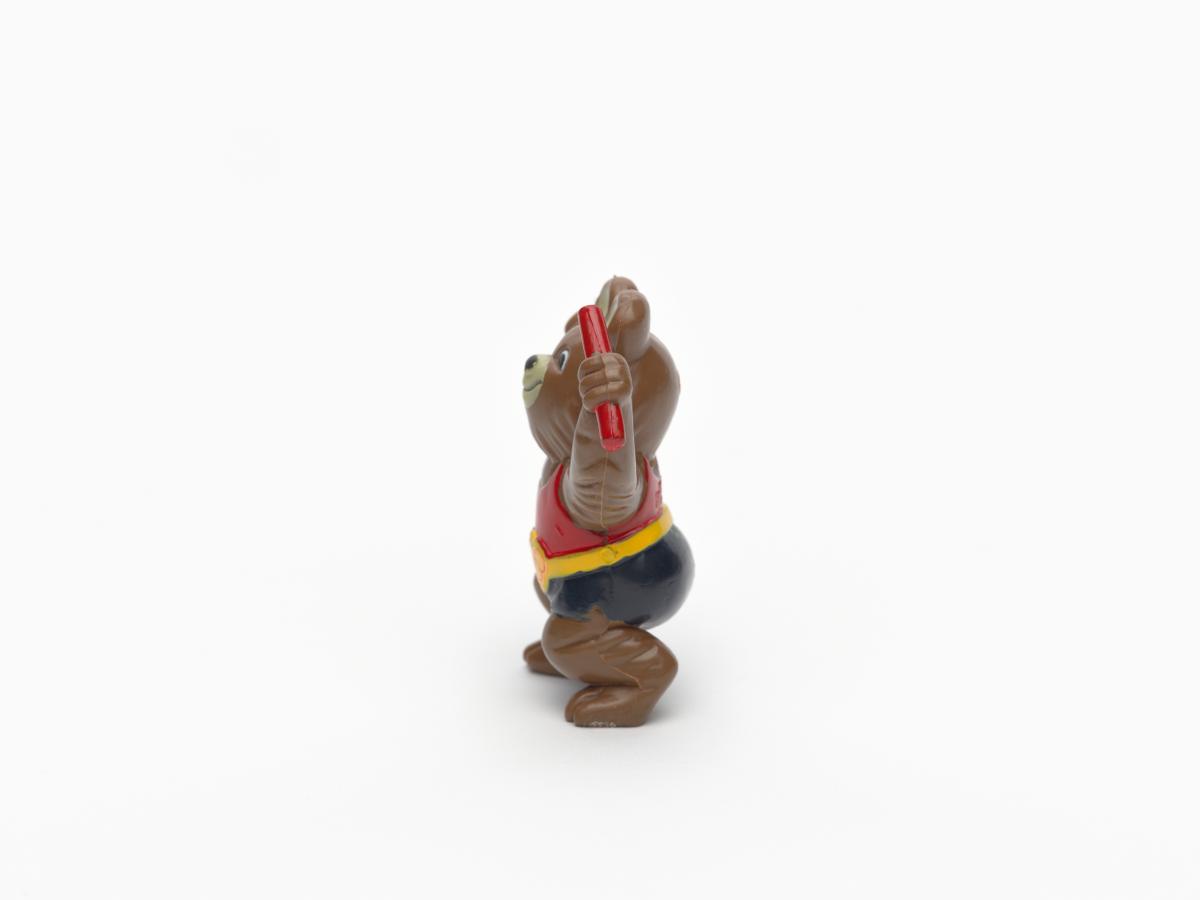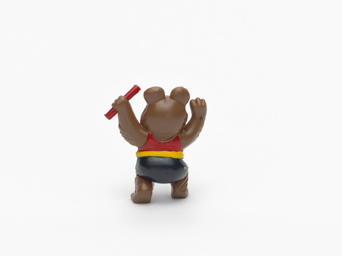 Moscow 1980, figurine of Misha, the Games' mascot, holding a relay baton.