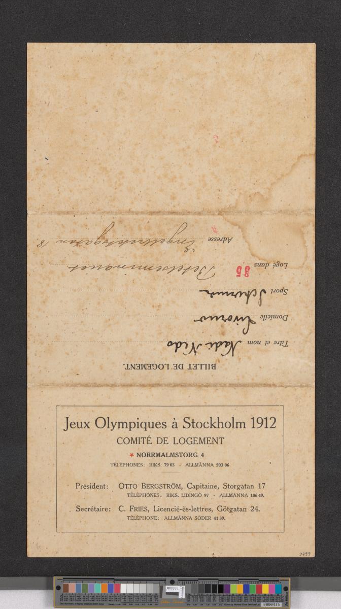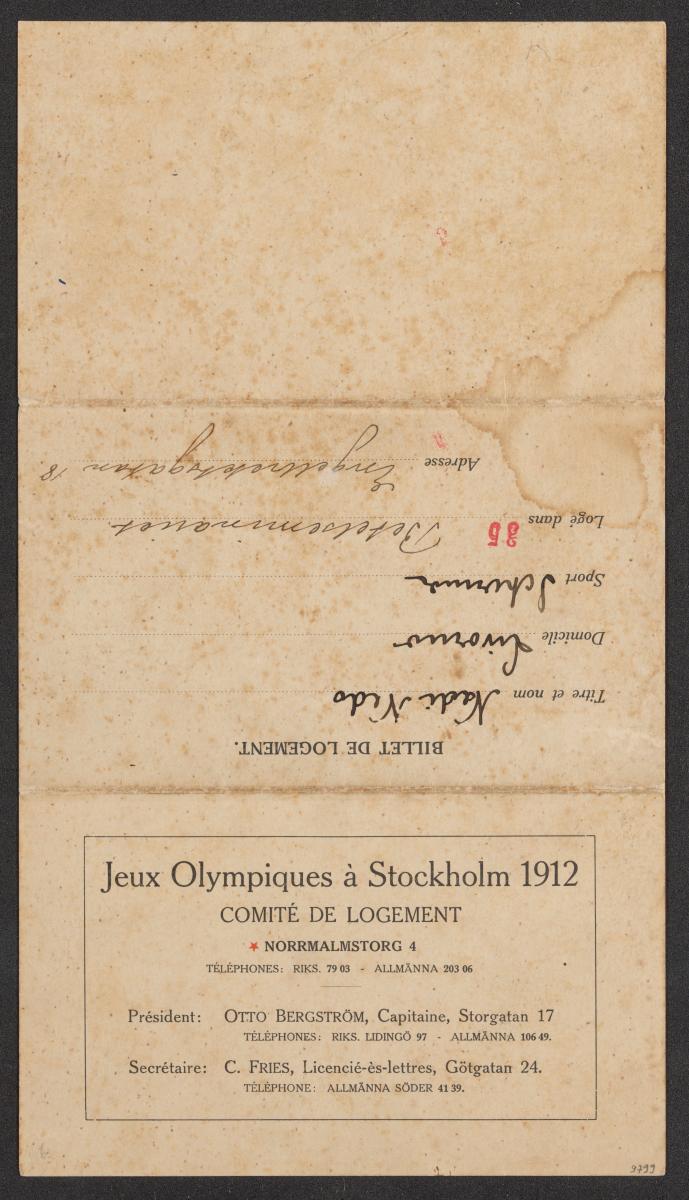 Stockholm 1912, accomodation card of Nedo NADI (ITA).