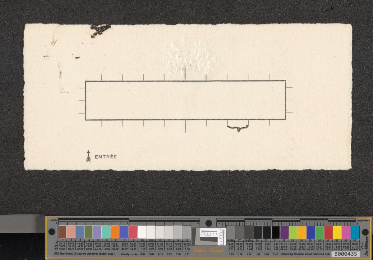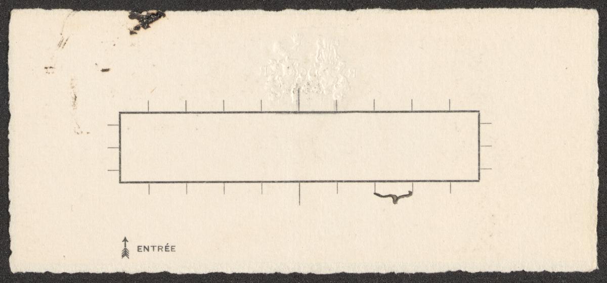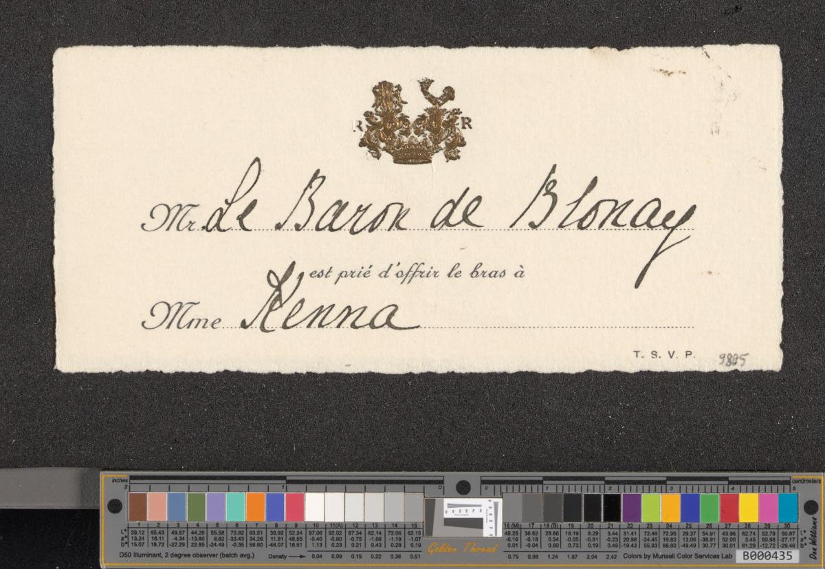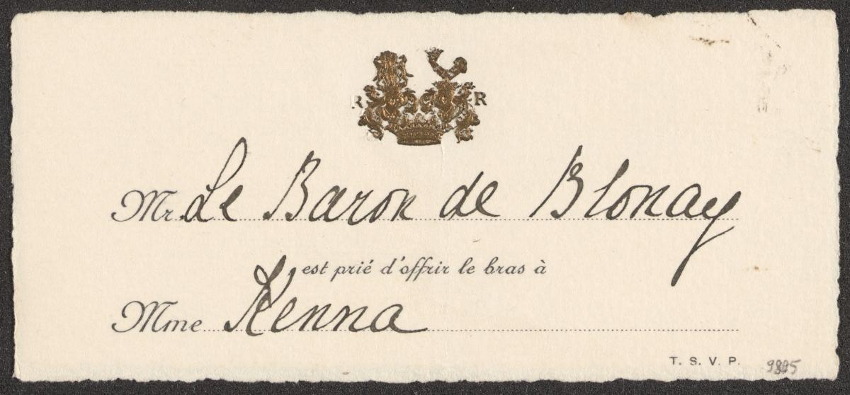 Rectangular card with gilded coat of arms. Text: "Mr Le Baron de Blonay / est prié d'offrir le bras à / Mme Kenna". Seating plan at the back of the card.
